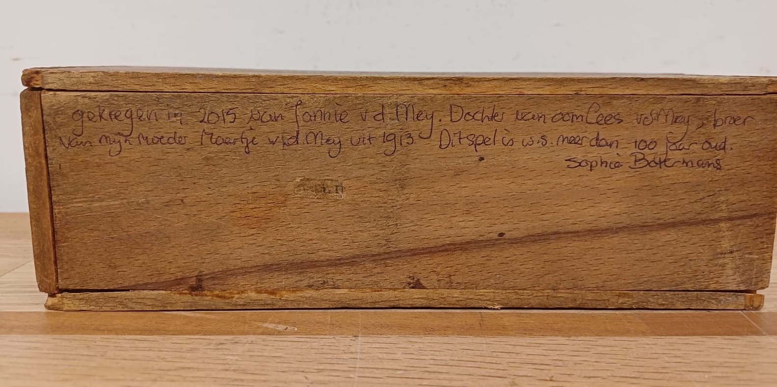 Gekregen in 2015 van Jannie v/d Mey. Dochter van oom Cees vd Mey, broer van mijn moeder Maartje v/d Mey uit 1913. Dit spel is w.s. meer dan 100 jaar oud. Sophie Botermans
