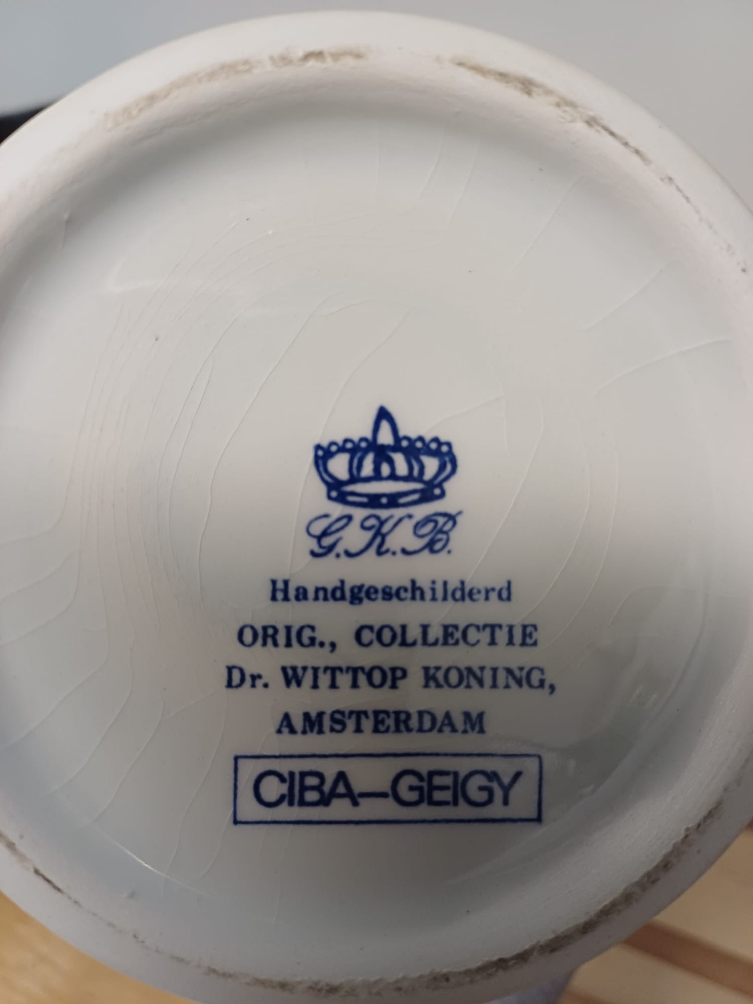 Delftsblauwe Apothekerspot “Aqua Pulegii” – Heruitgave geïnspireerd door 18e-eeuws ontwerp van Theunis Dextra (1758-1764), vervaardigd door CIBA-GEIGY in samenwerking met Dr. D.A. Wittop Koning, handgeschilderd, collectie Amsterdam.