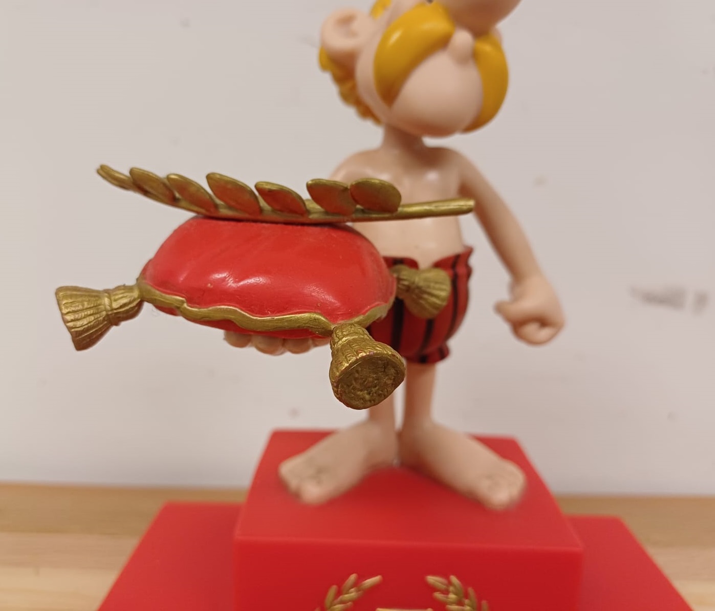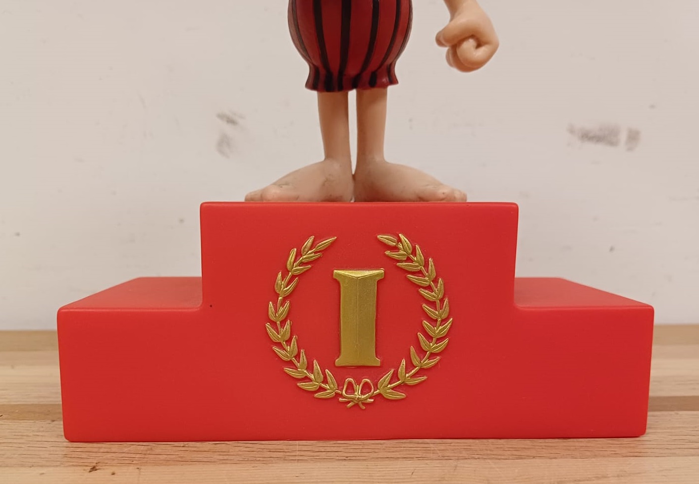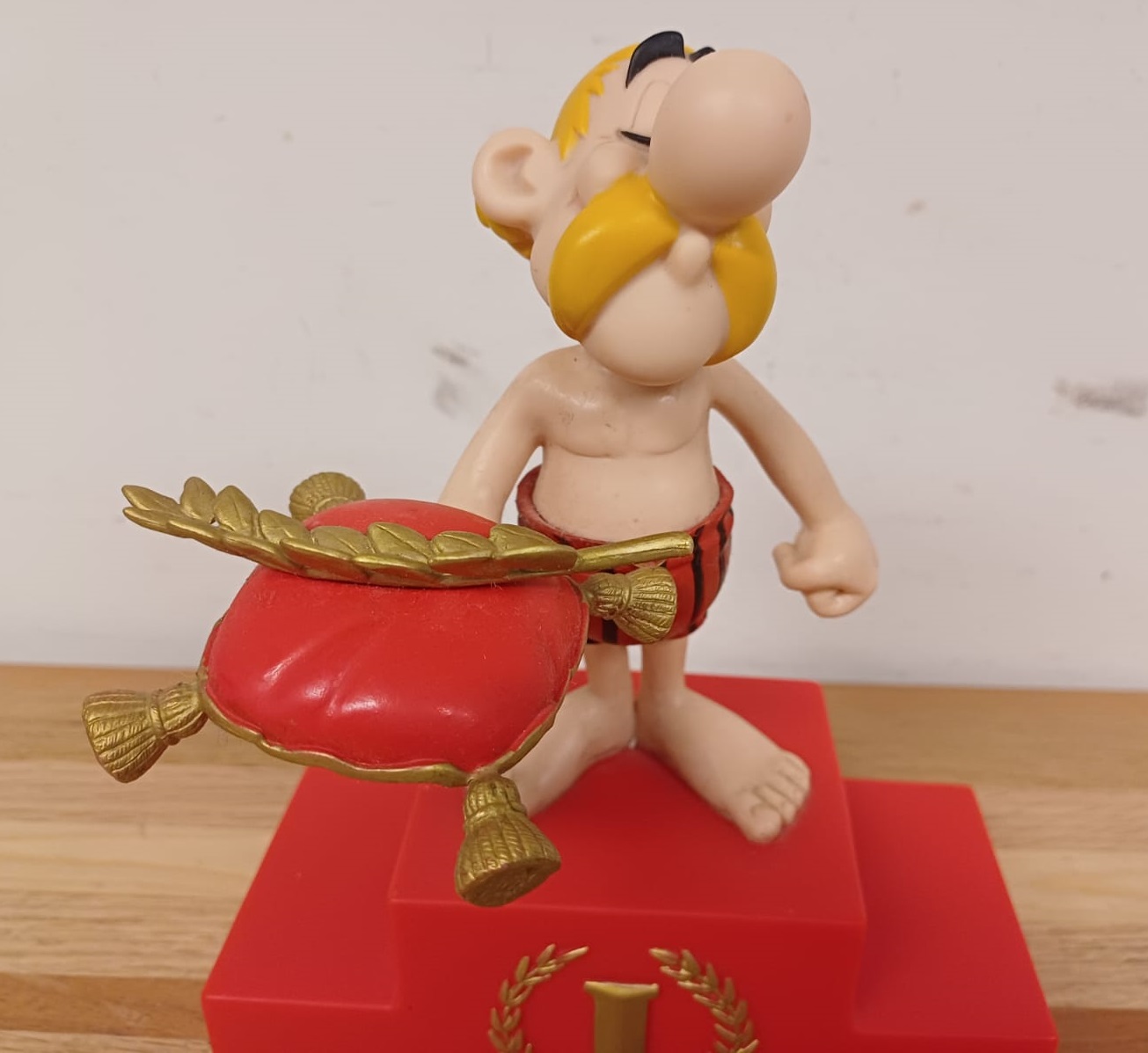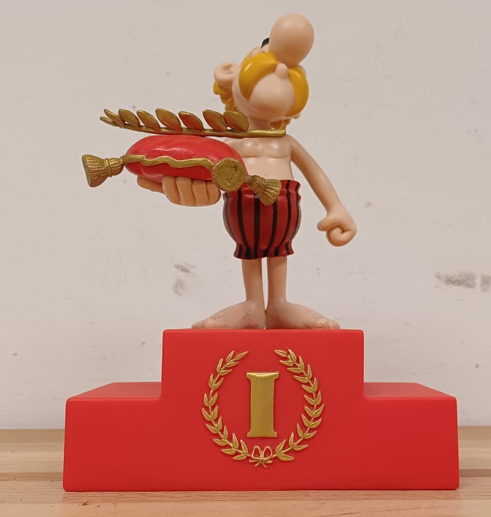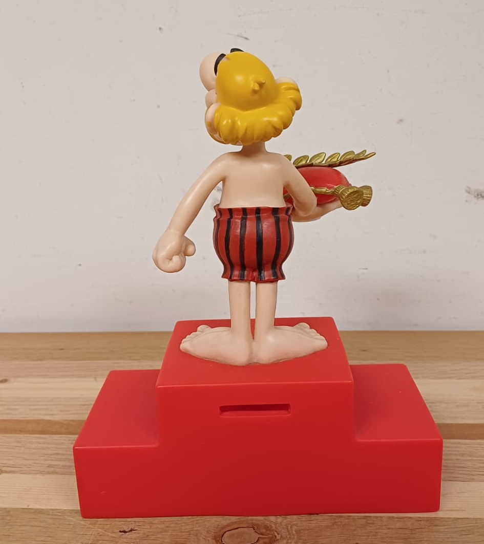 Asterix gaat in het album ‘Asterix en de Olympische Spelen’ de strijd weer aan met de Romeinen. En natuurlijk wint hij de eerste prijs! Speciaal voor deze overwinning heeft het Franse merk Plastoy een extra grote spaarpot gemaakt van Asterix als hij op de hoogste trede staat na zijn overwinning.