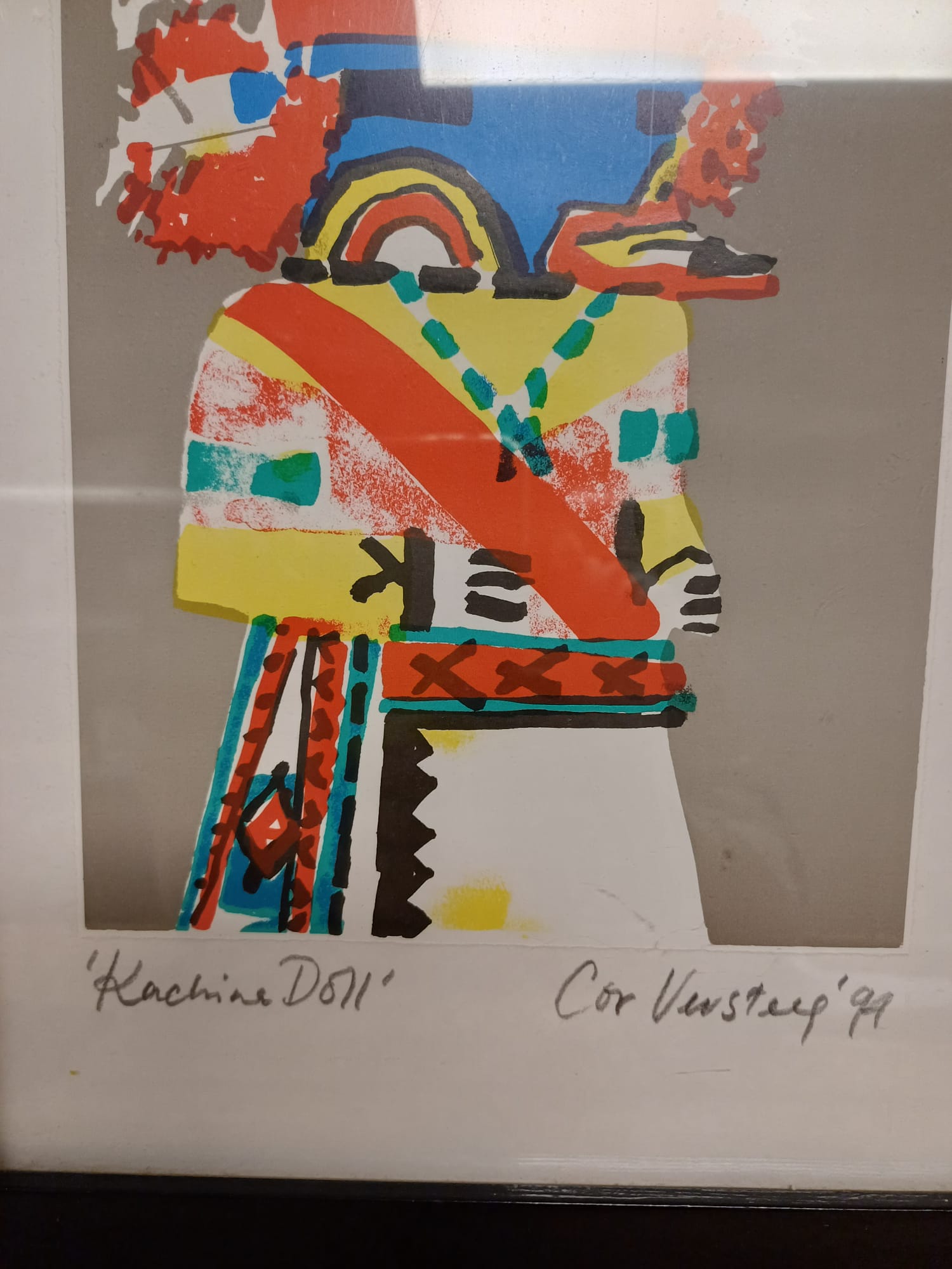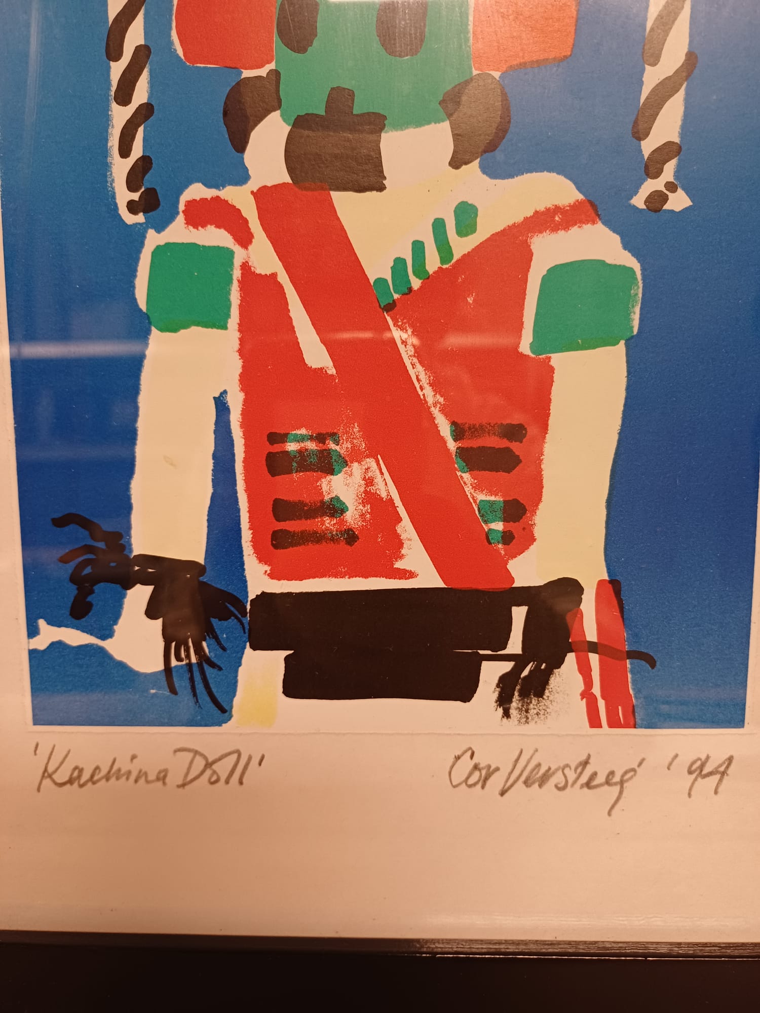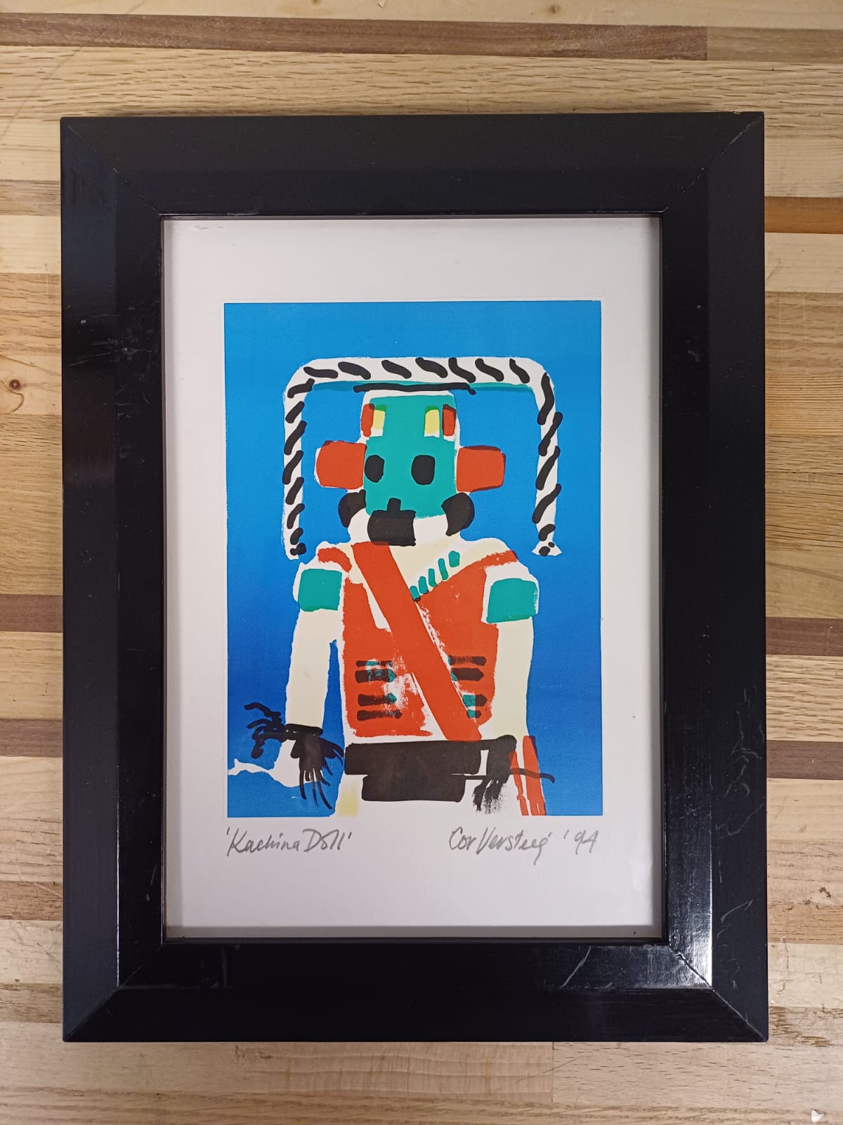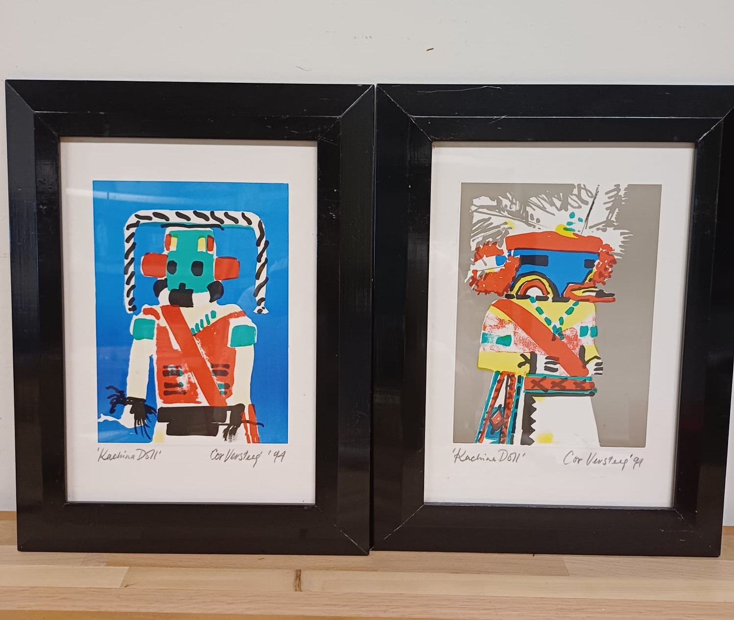Twee ingelijste kunstwerken van Cor Versteeg, getiteld ‘Kachina Doll’ uit 1994. De werken tonen kleurrijke afbeeldingen van Kachina poppen, een belangrijk onderdeel van de cultuur van de inheemse bevolking van Noord-Amerika. De lijsten zijn zwart en in goede staat. Een mooie aanvulling op elke kunstcollectie.
