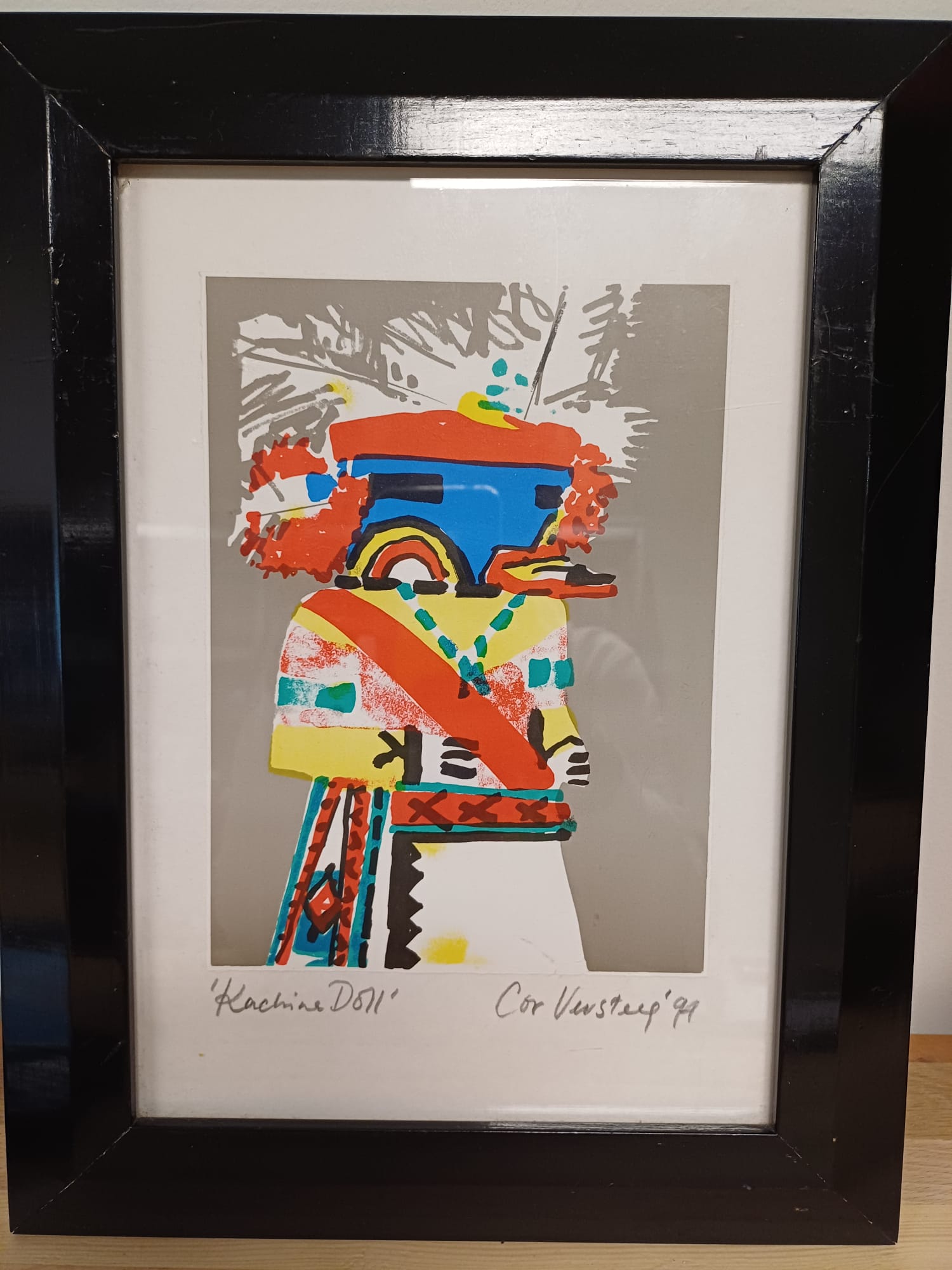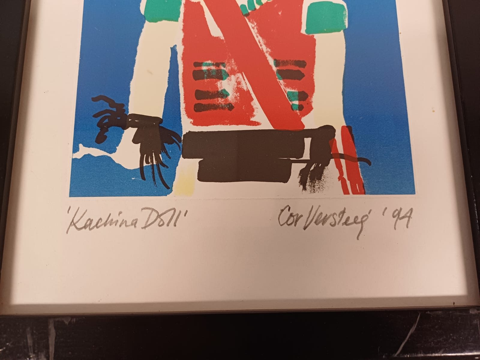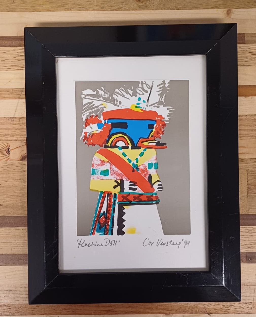 Twee ingelijste kunstwerken van Cor Versteeg, getiteld ‘Kachina Doll’ uit 1994. De werken tonen kleurrijke afbeeldingen van Kachina poppen, een belangrijk onderdeel van de cultuur van de inheemse bevolking van Noord-Amerika. De lijsten zijn zwart en in goede staat. Een mooie aanvulling op elke kunstcollectie.