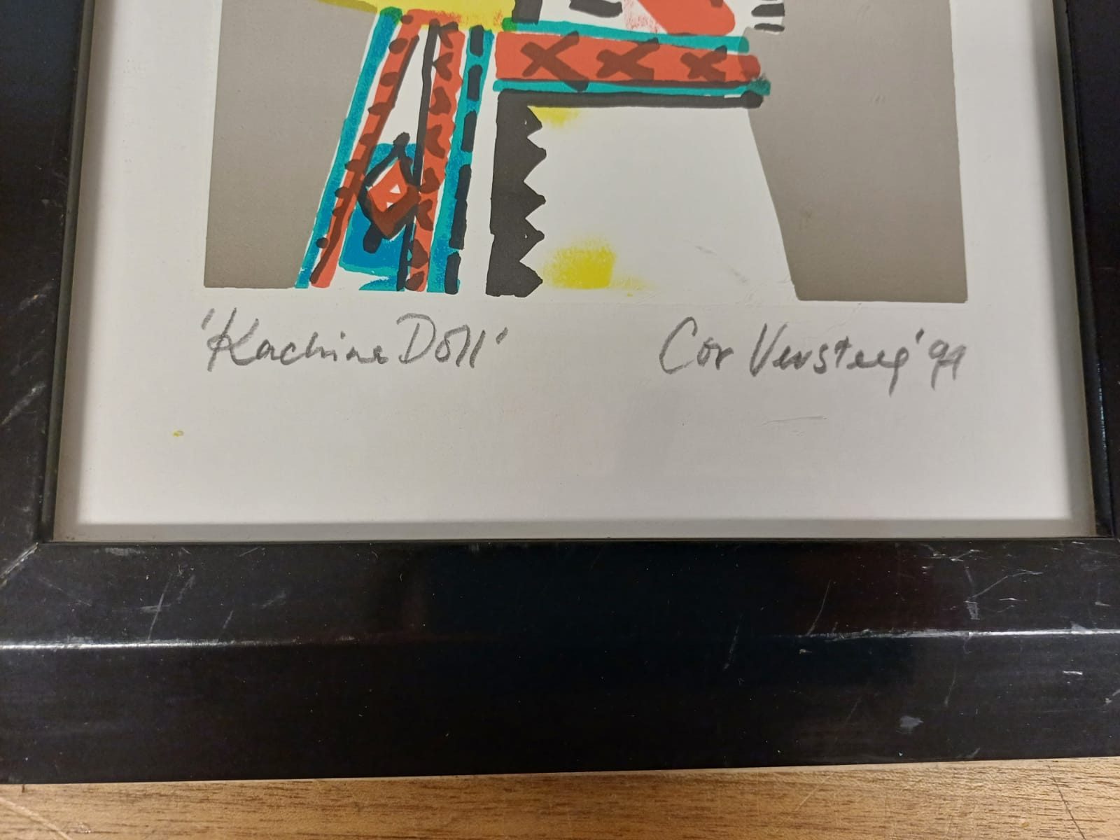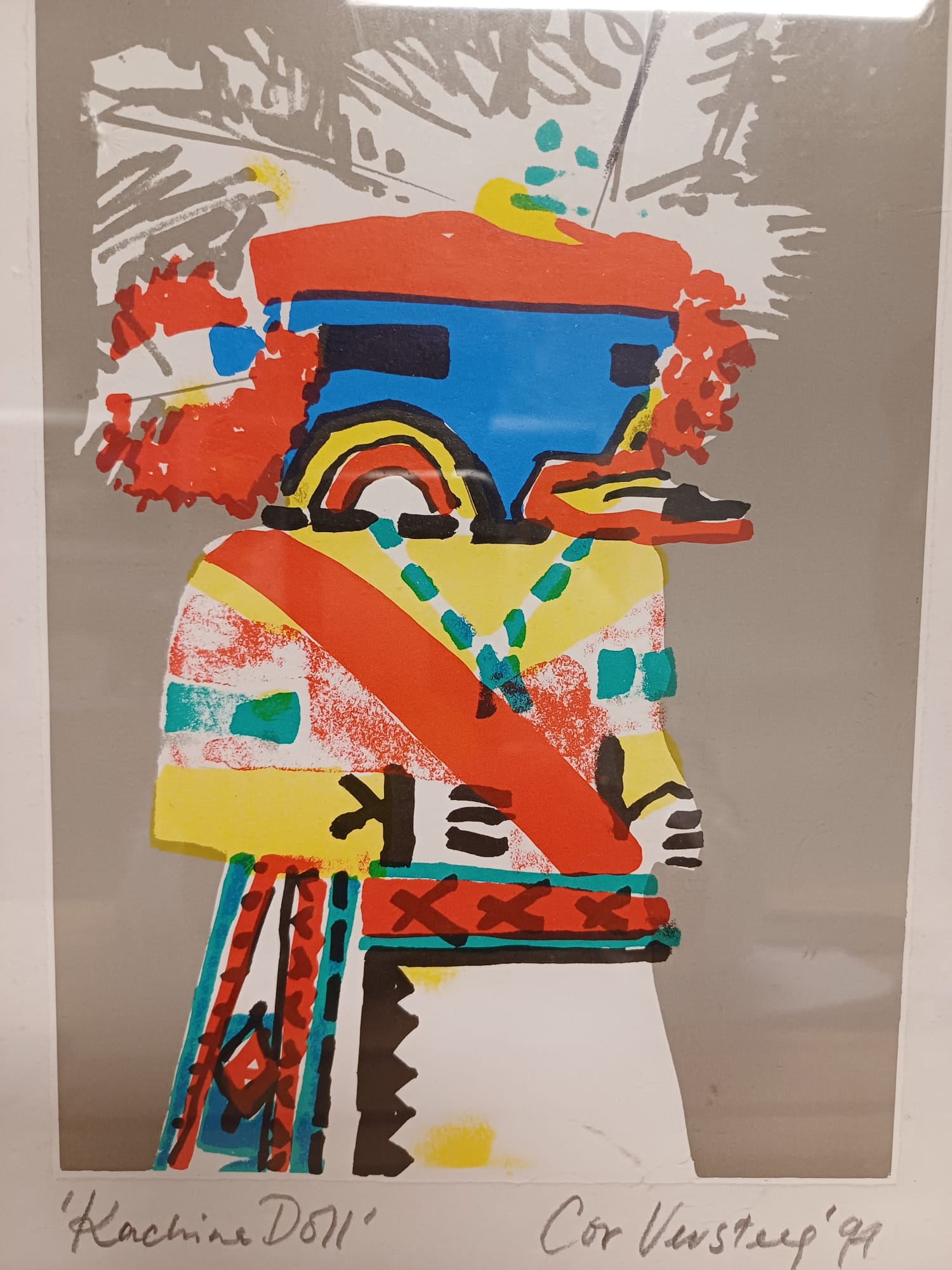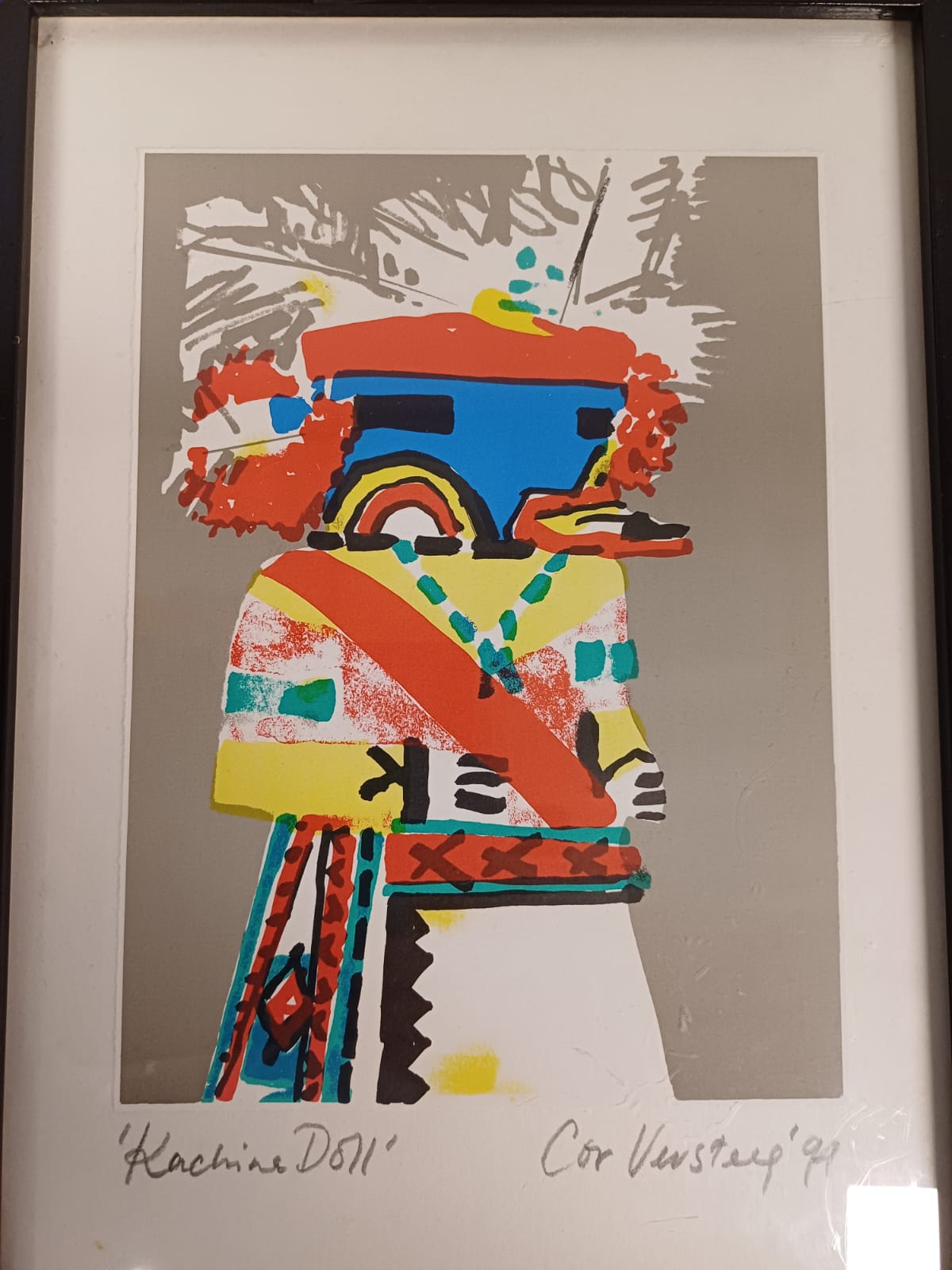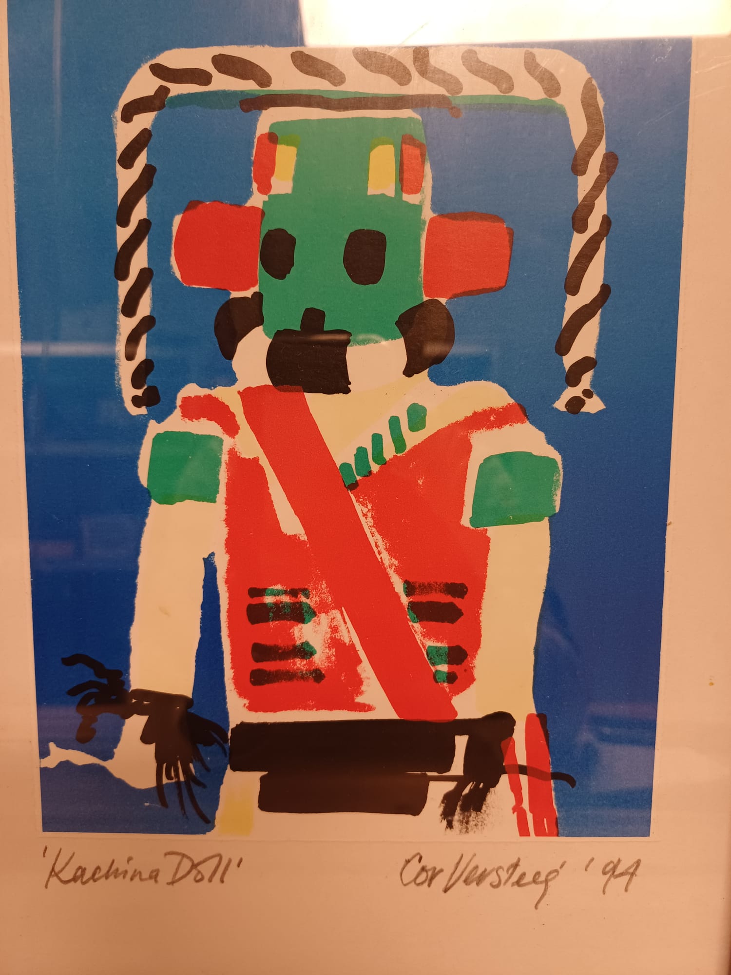 Twee ingelijste kunstwerken van Cor Versteeg, getiteld ‘Kachina Doll’ uit 1994. De werken tonen kleurrijke afbeeldingen van Kachina poppen, een belangrijk onderdeel van de cultuur van de inheemse bevolking van Noord-Amerika. De lijsten zijn zwart en in goede staat. Een mooie aanvulling op elke kunstcollectie.
