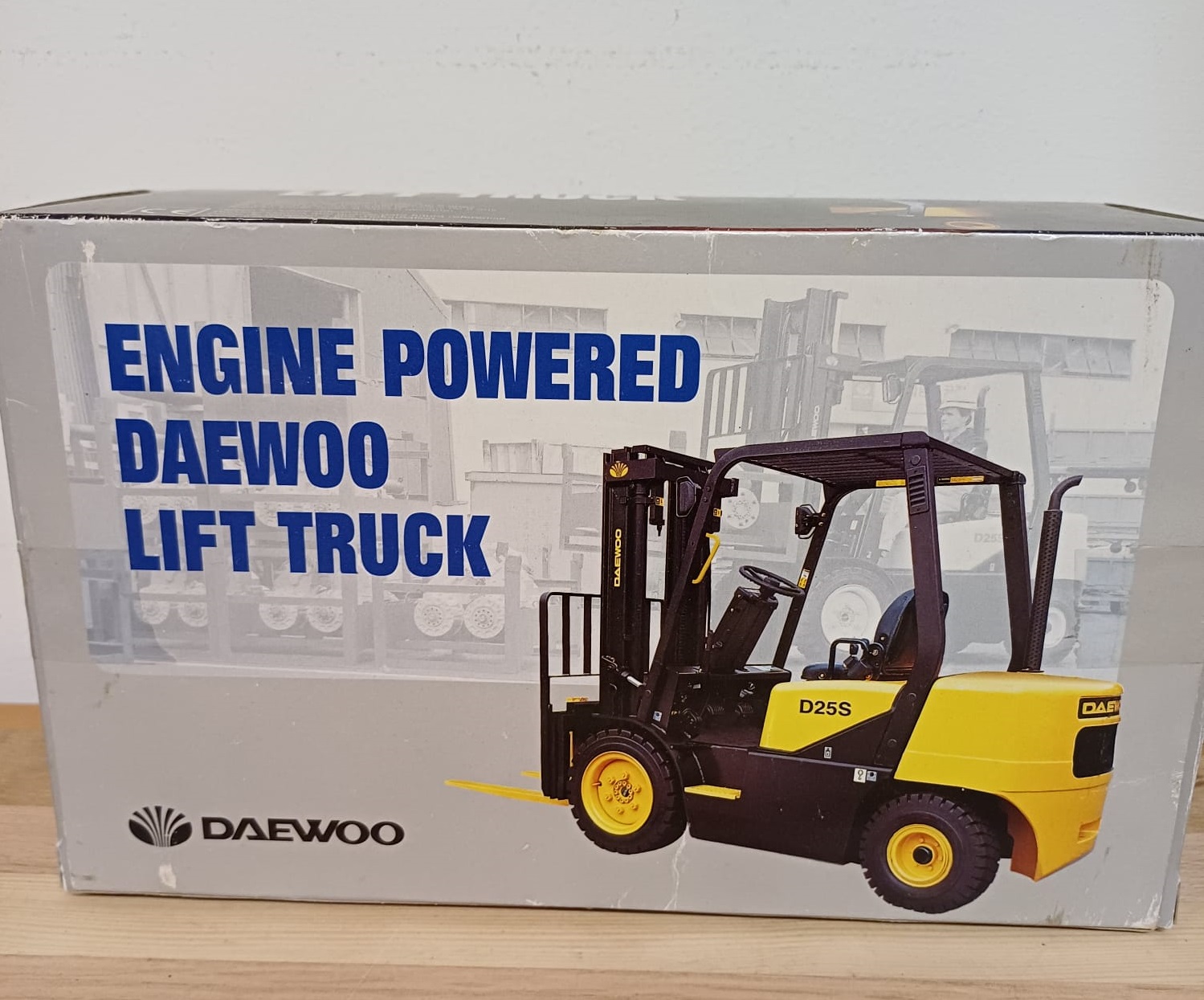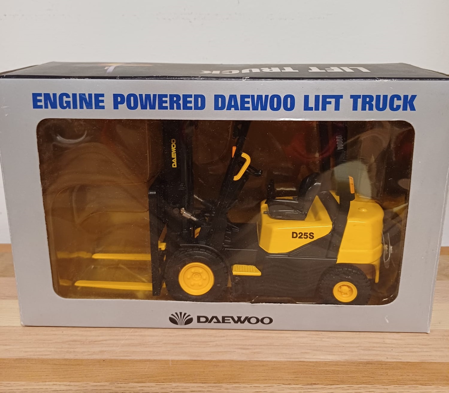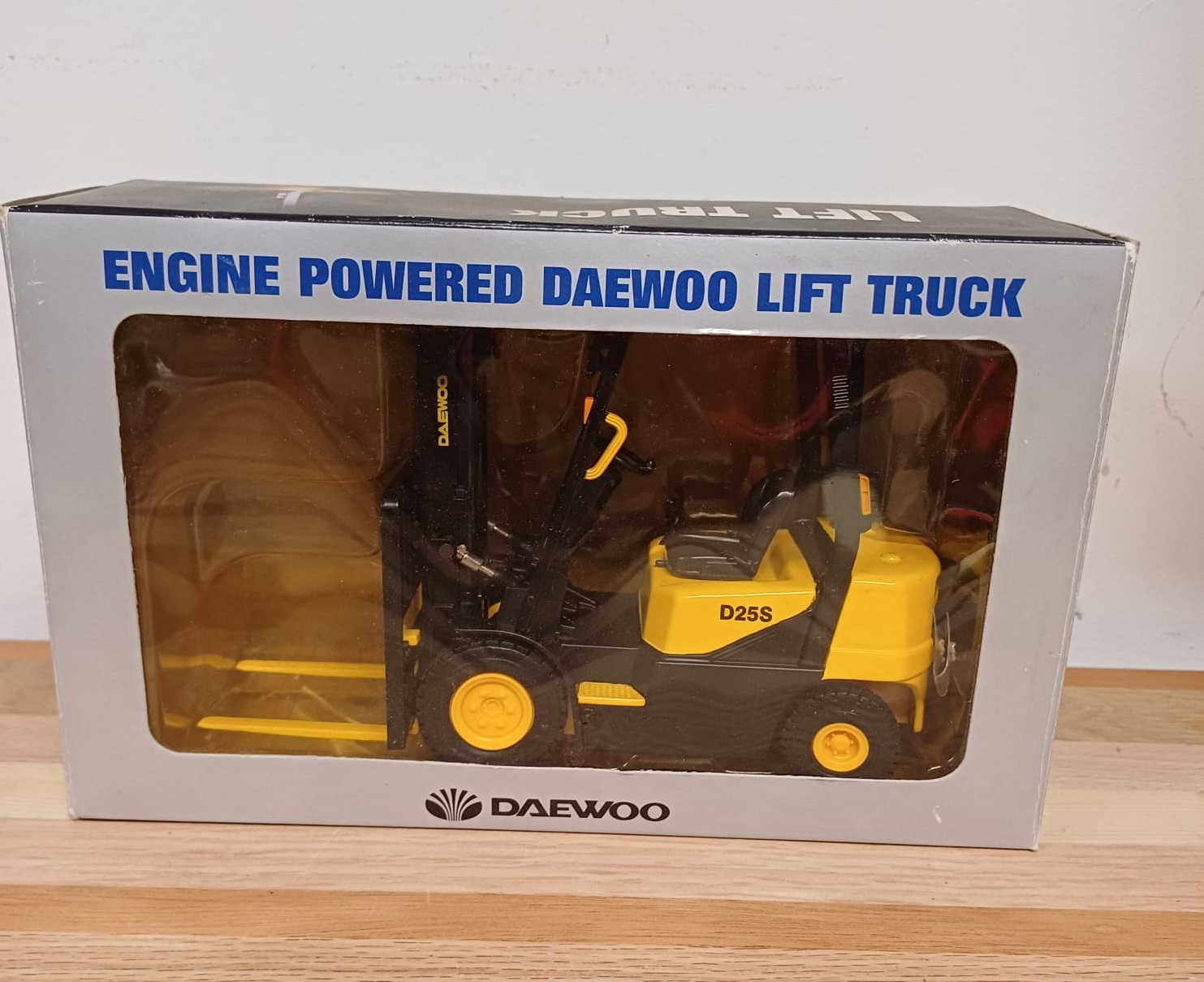 Een Daewoo heftruck, aangedreven door een Daewoo motor. Een mooi model voor verzamelaars of liefhebbers van heftrucks.Schaal 1/20