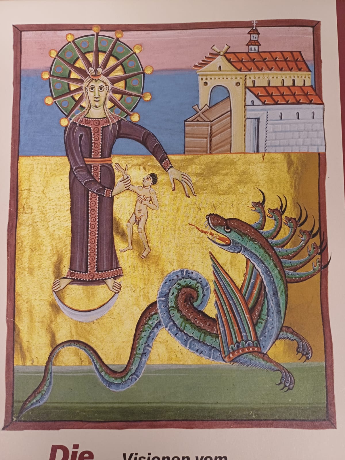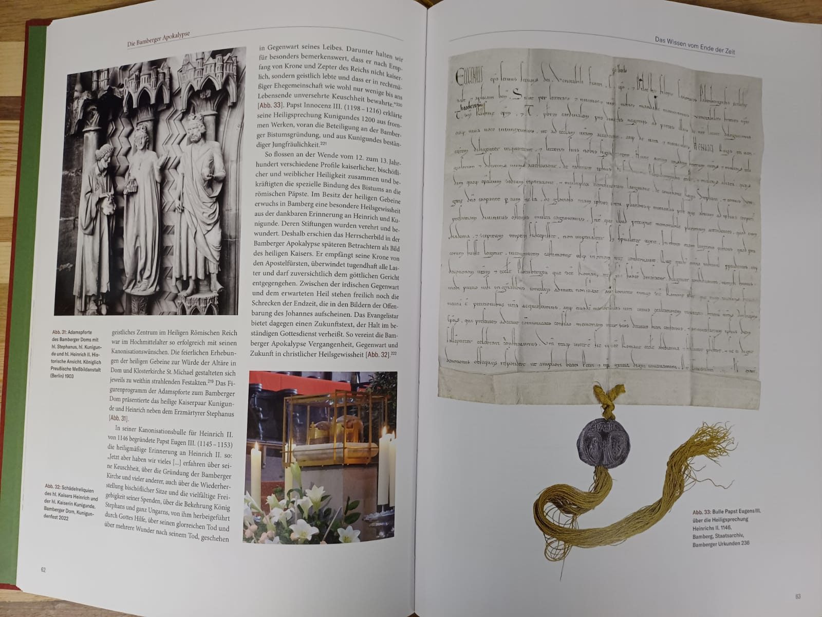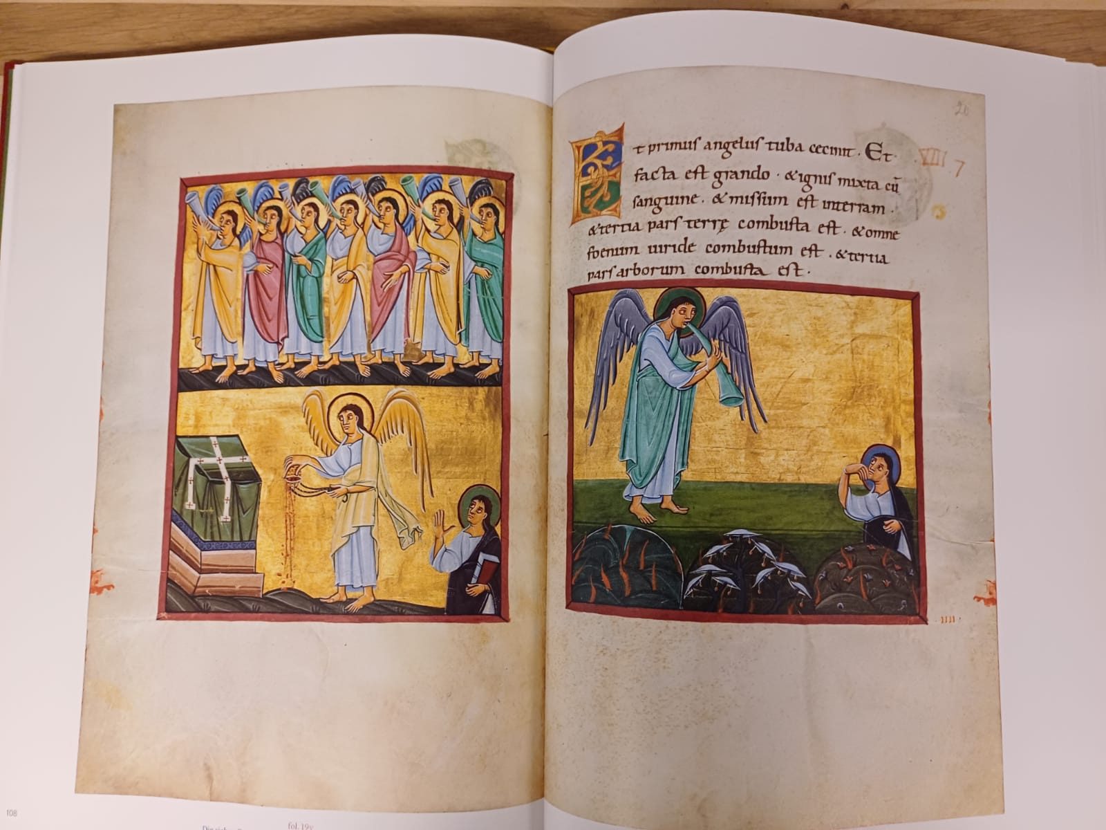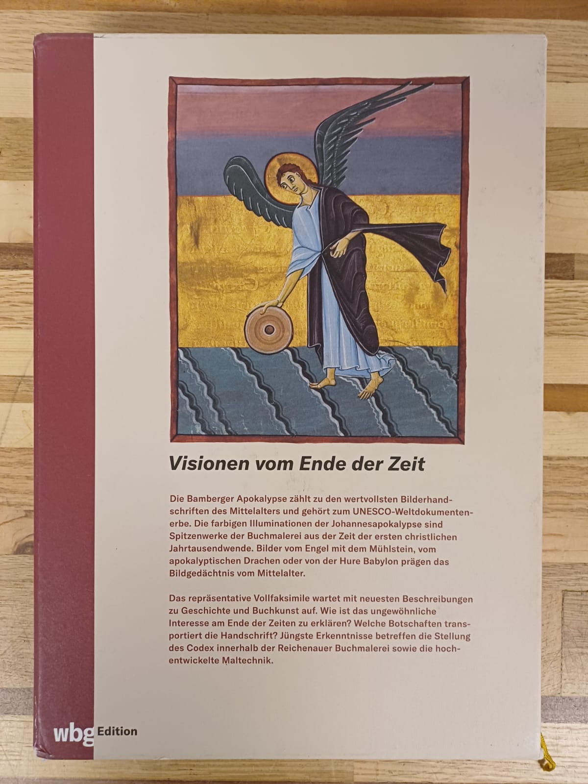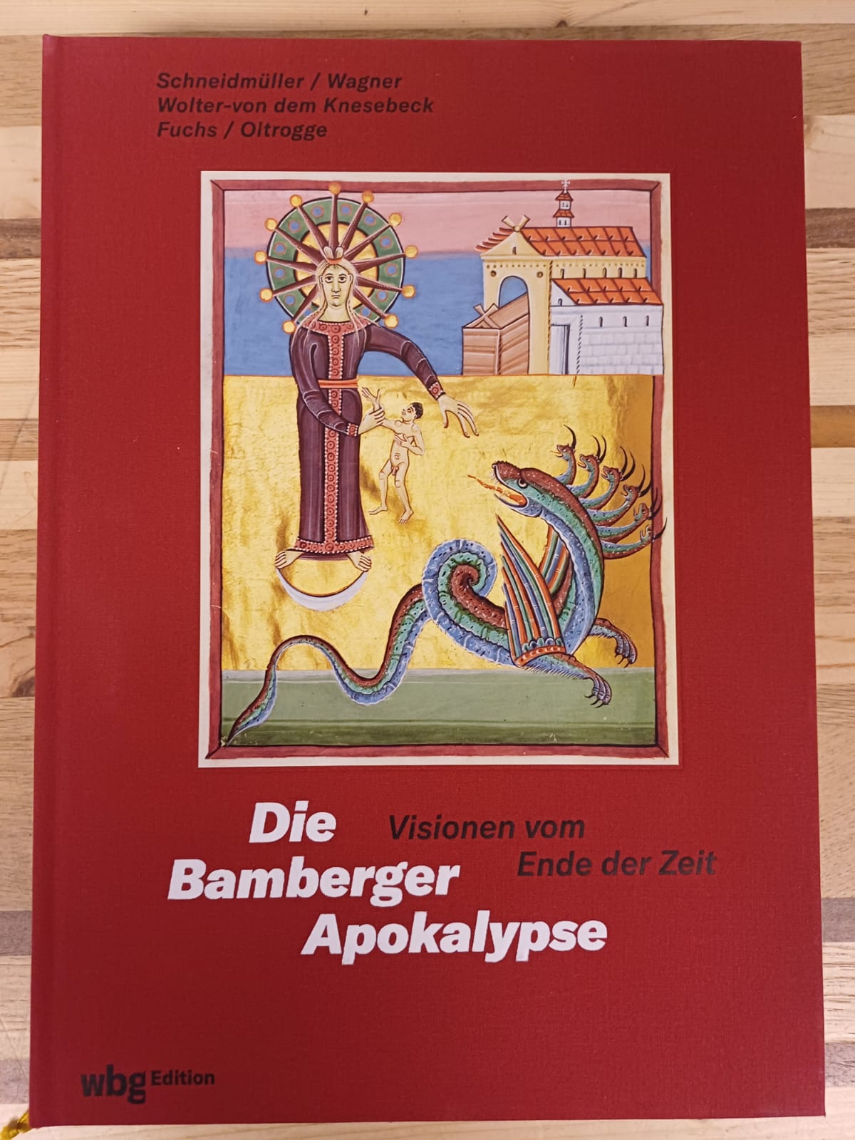 Die Bamberger Apokalypse entstand um das Jahr 1000 auf der Insel Reichenau im Bodensee. Nach Bamberg gelangte sie im Zuge der Gründung des Bistums Bamberg im Jahr 1007. Heute gehört sie zum UNESCO-Weltdokumentenerbe. Reich ausgestattet und mit Gold und Silber verziert, setzt die ottonische Handschrift die Geheime Offenbarung des Johannes in fünfzig äußerst expressive und dramatische Bilder um. Der Engel mit dem Mühlstein, der apokalyptische Drache oder die Hure Babylon prägen bis heute unser Bildgedächtnis vom Mittelalter.