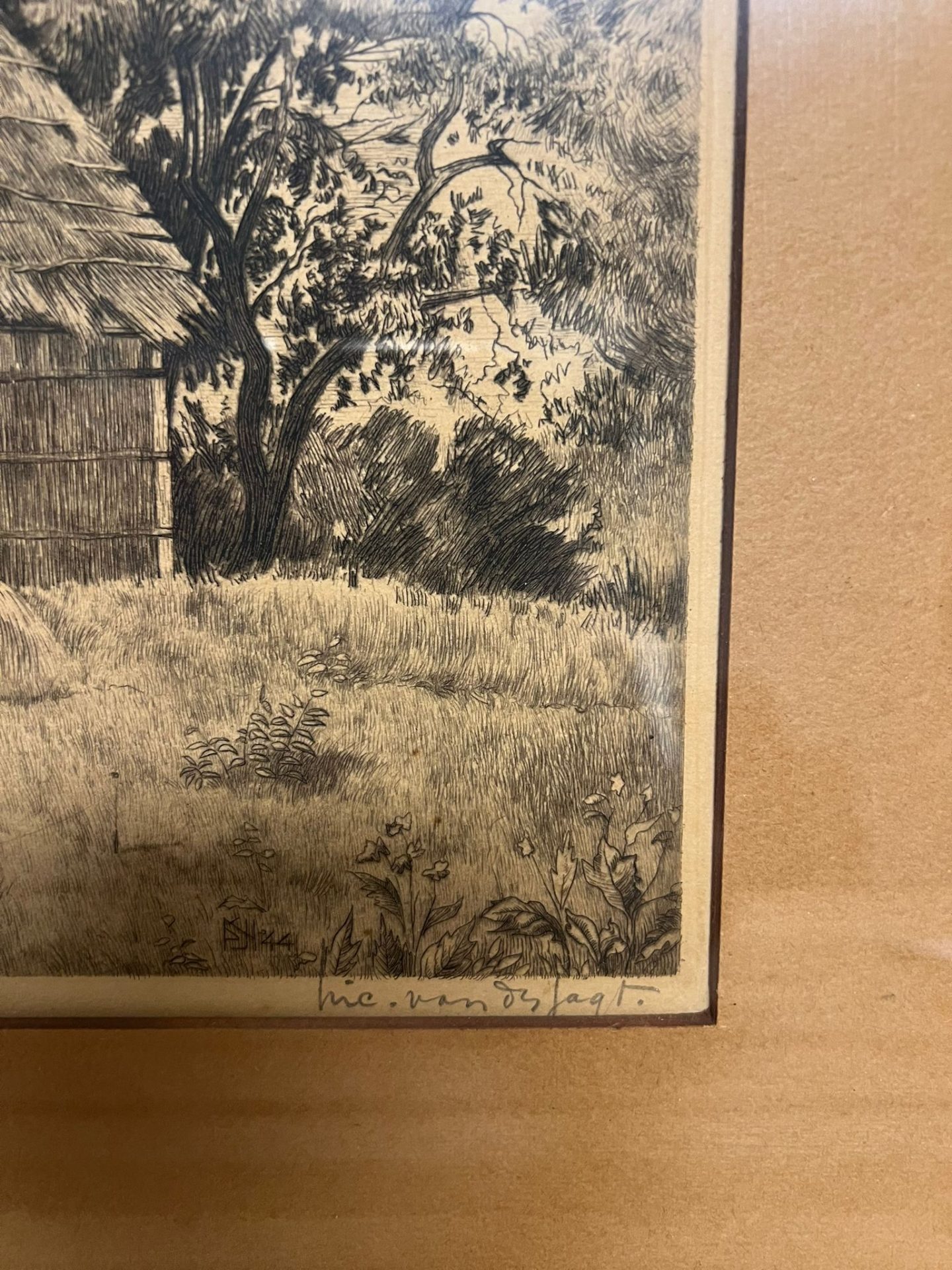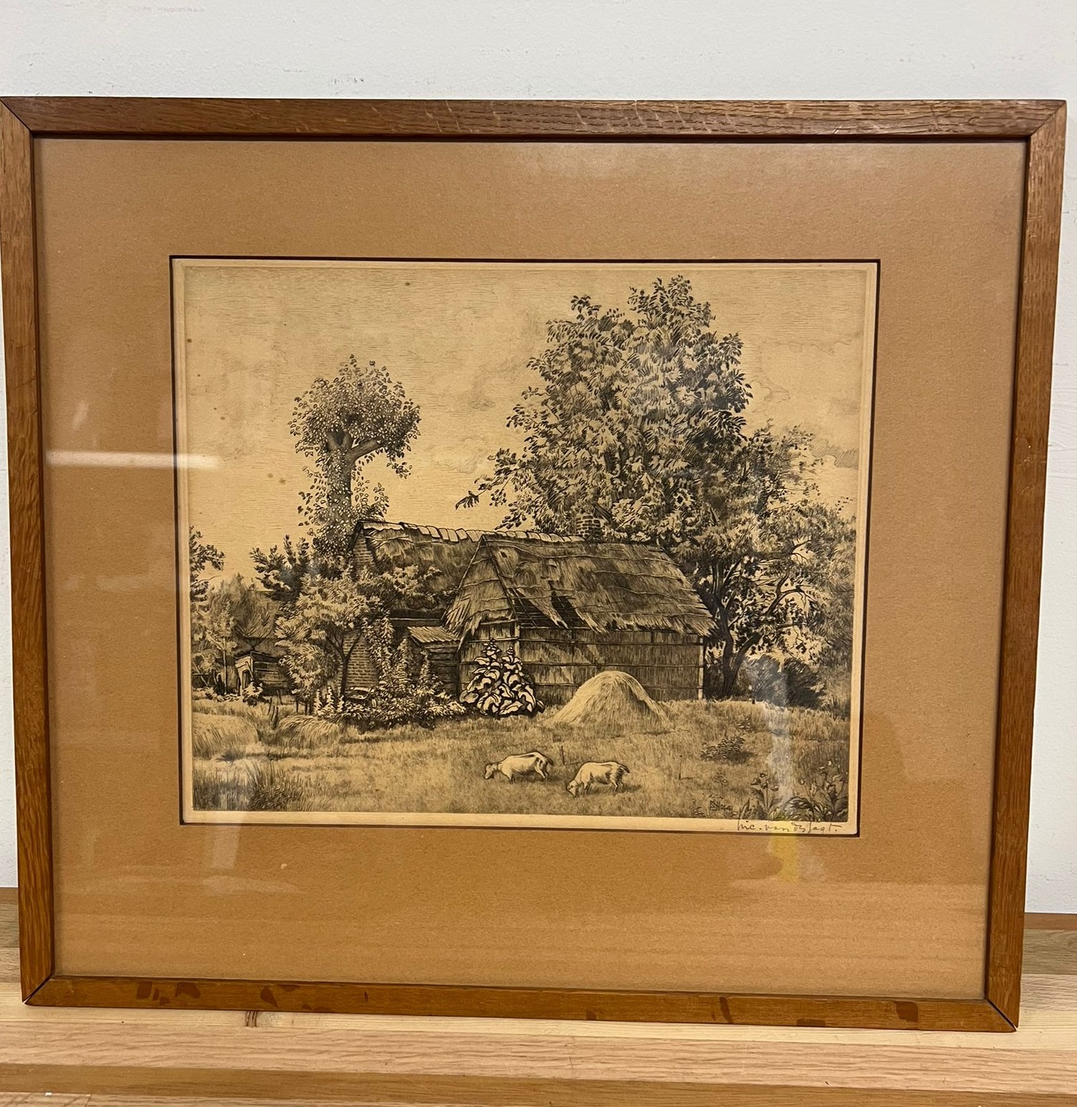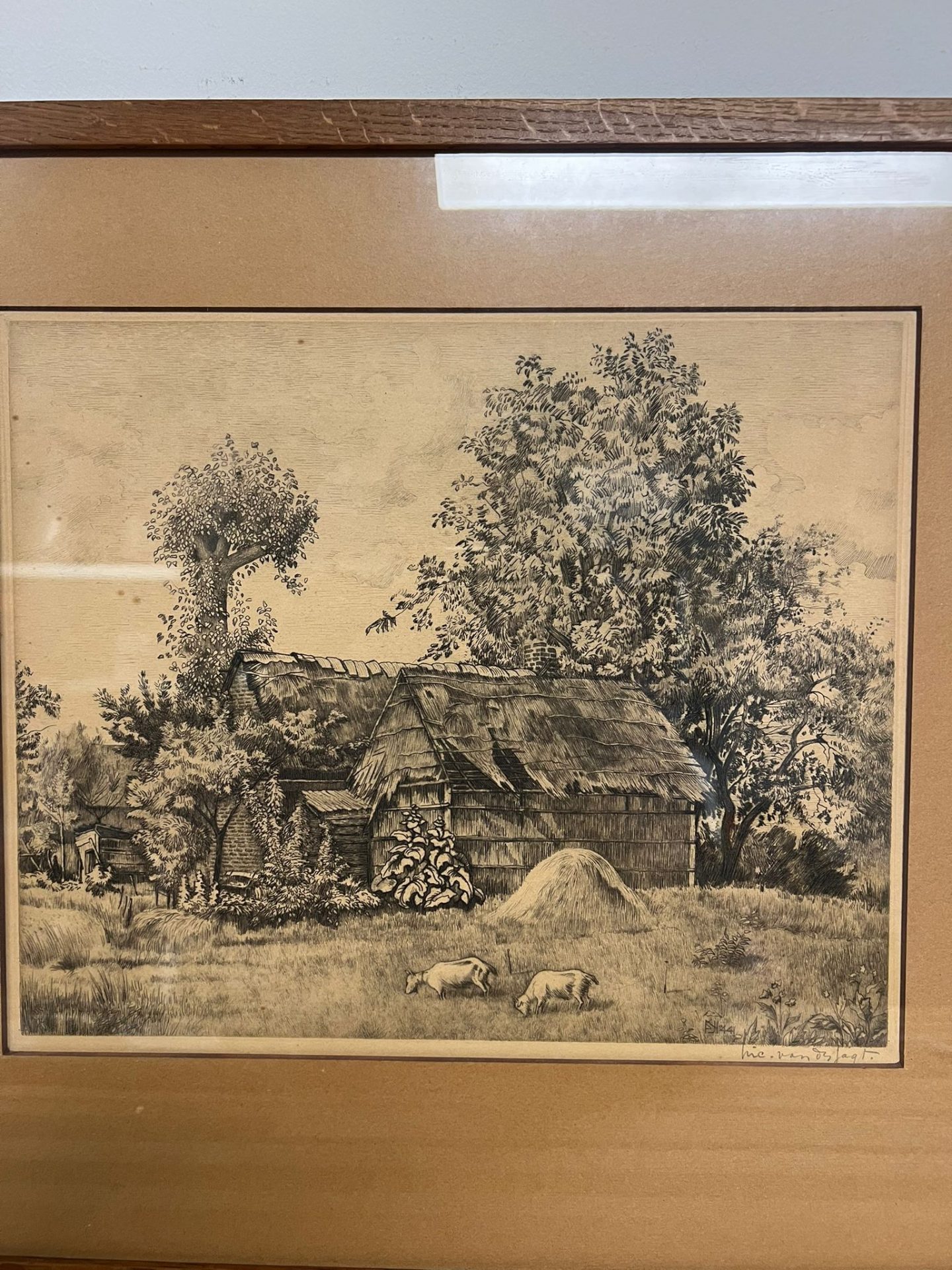 Prachtige ets van Nico van der Jagt (1888-1959), getiteld “Het geitenweitje” of “Geiten bij boerderij in de Achterhoek”. De ets is ingelijst en verkeert in goede staat. Een mooi stukje Nederlandse kunst.