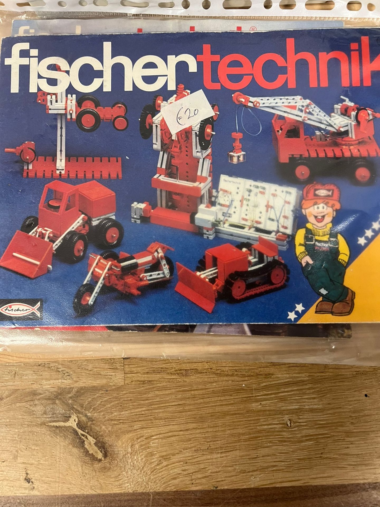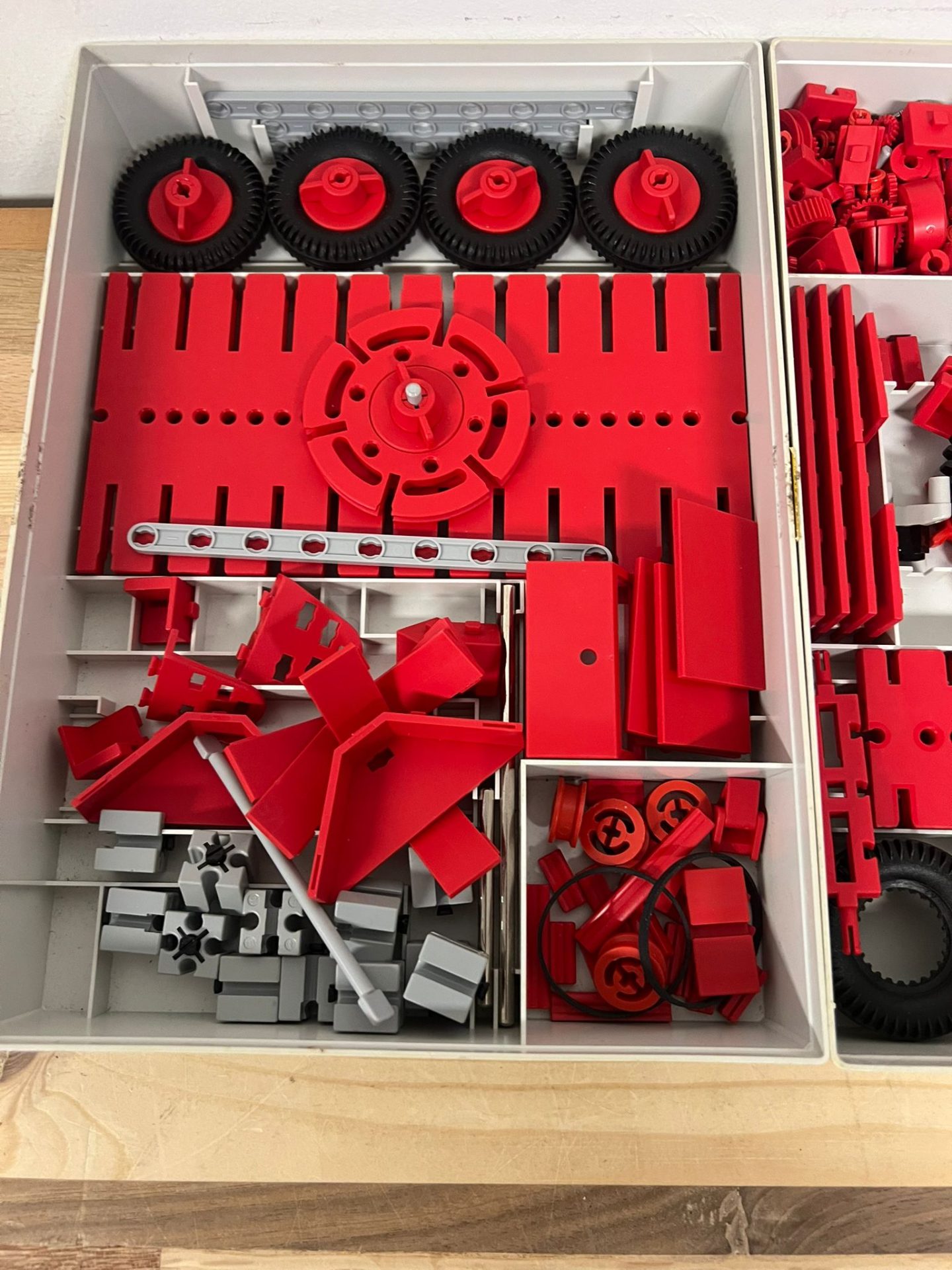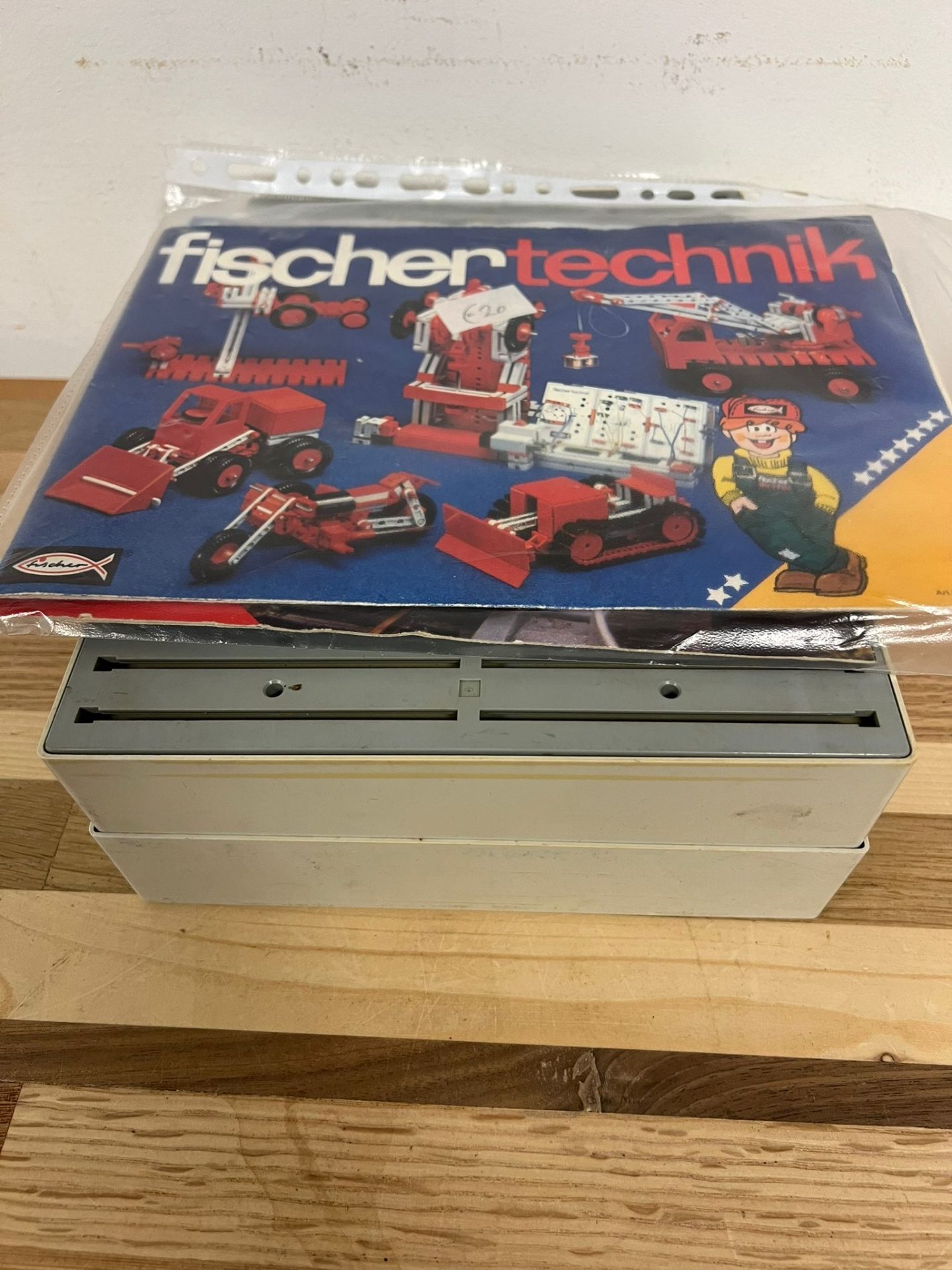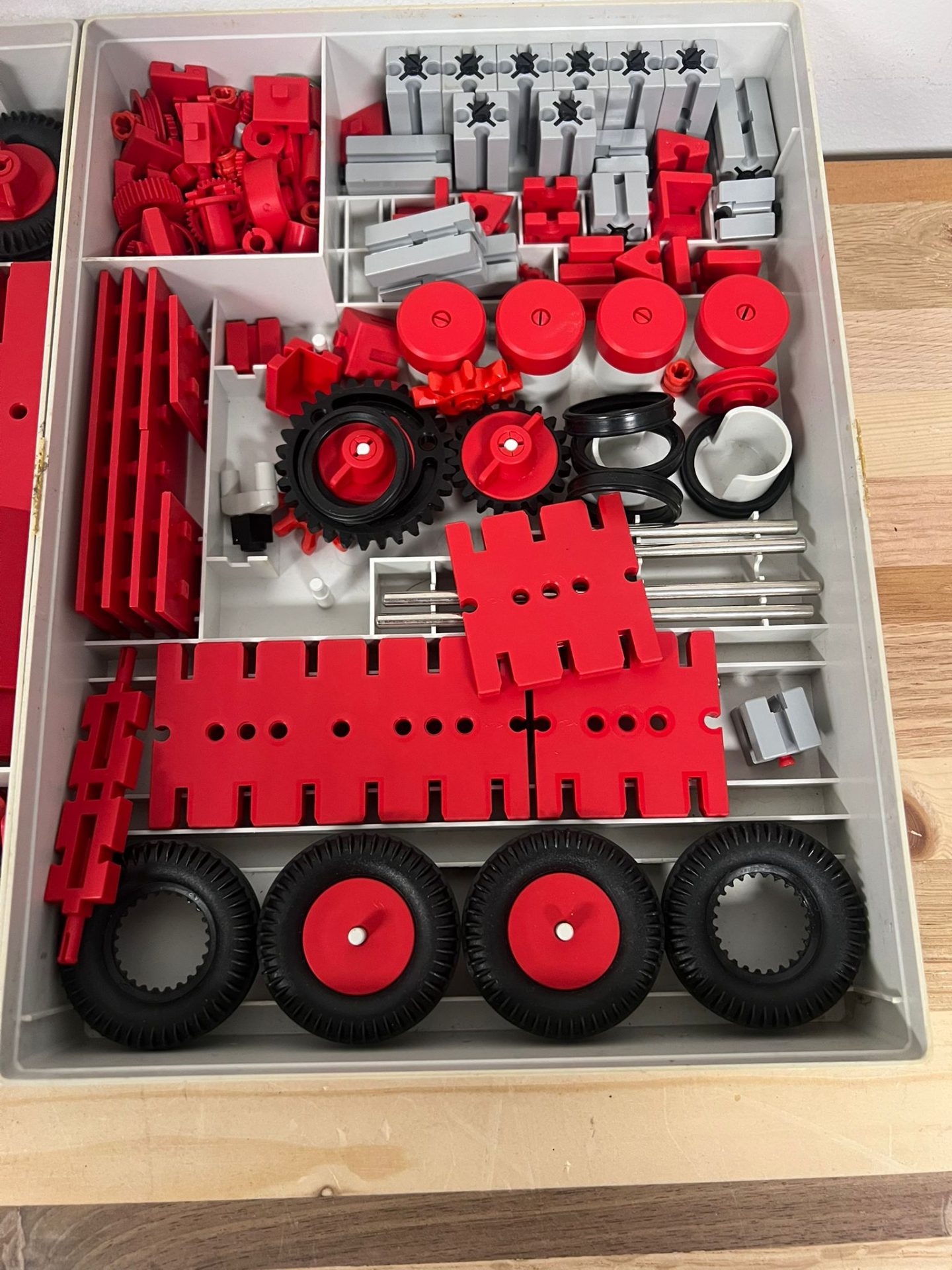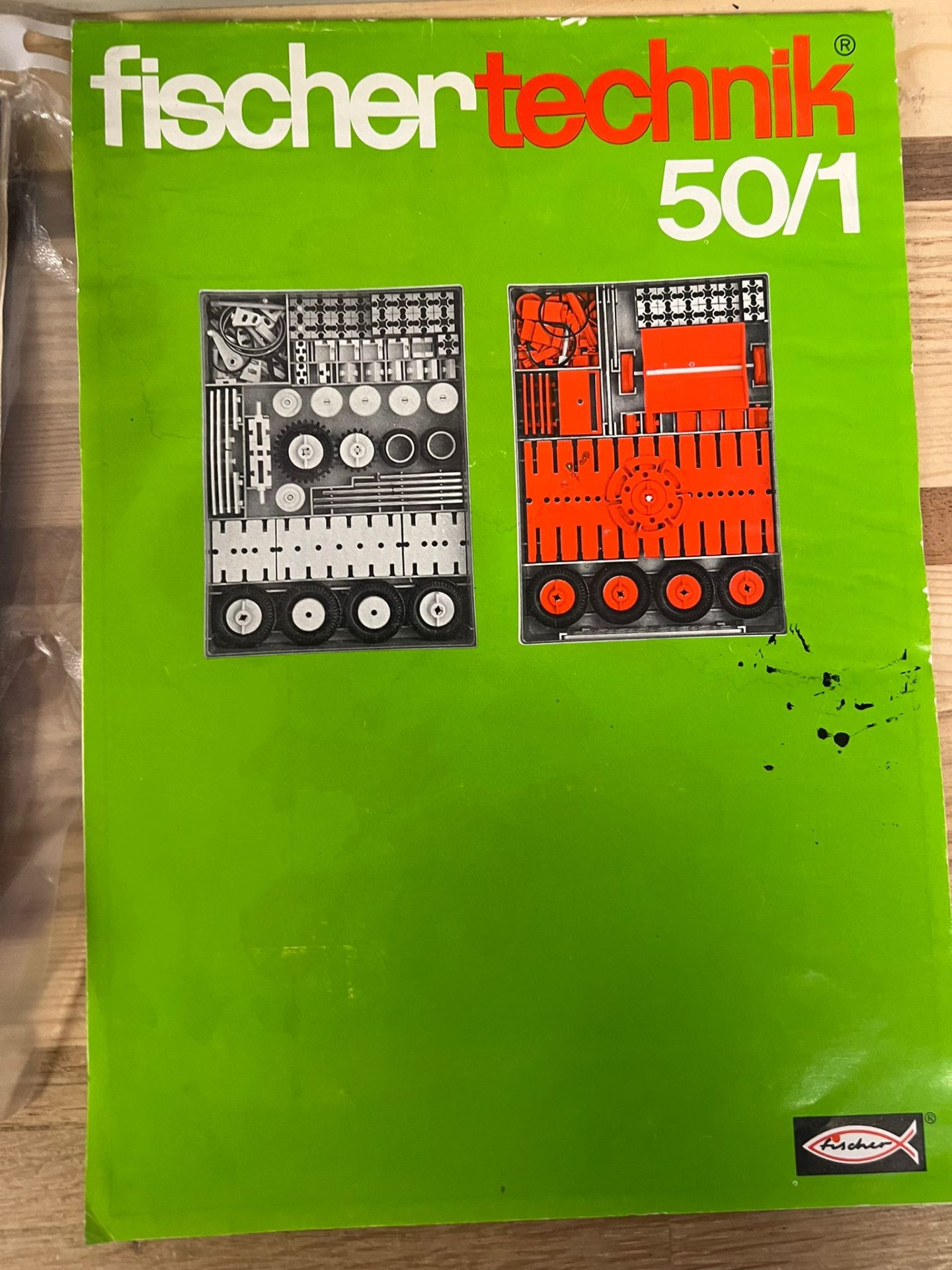 Dit is een Fischer Technik 50/1 bouwdoos. De doos bevat verschillende rode en grijze onderdelen, waaronder wielen en bouwplaten. Er zit ook een instructieboekje bij met voorbeelden van wat je ermee kunt bouwen.