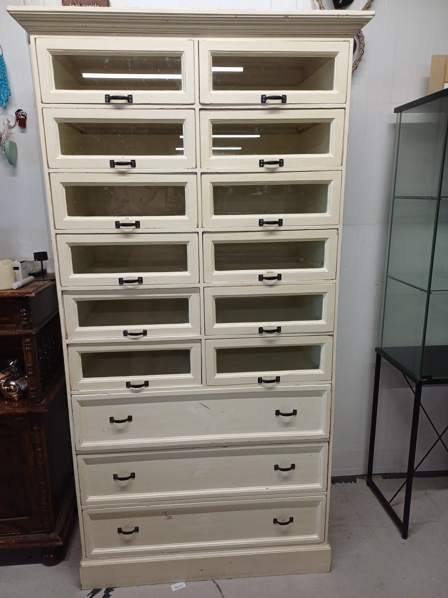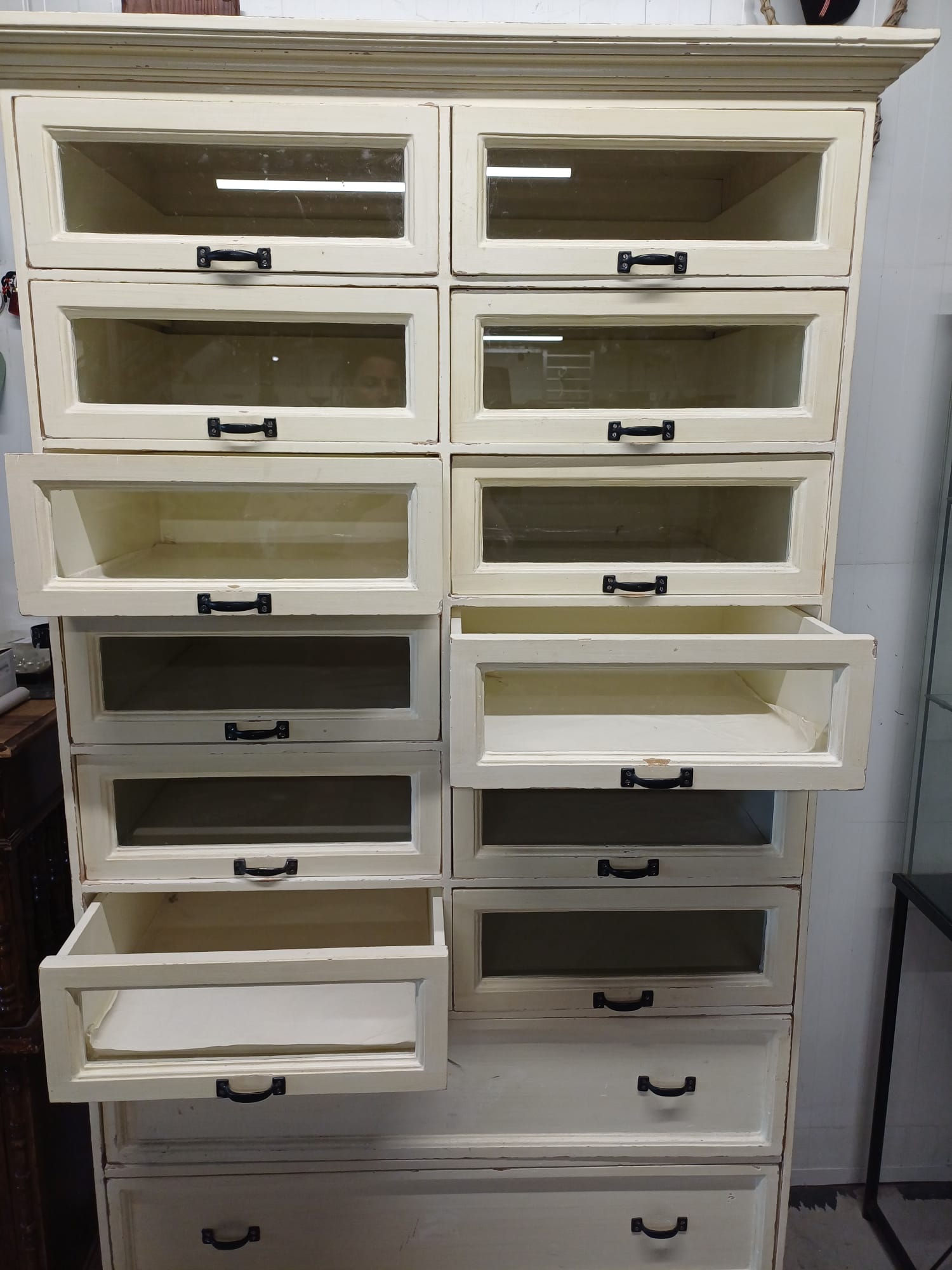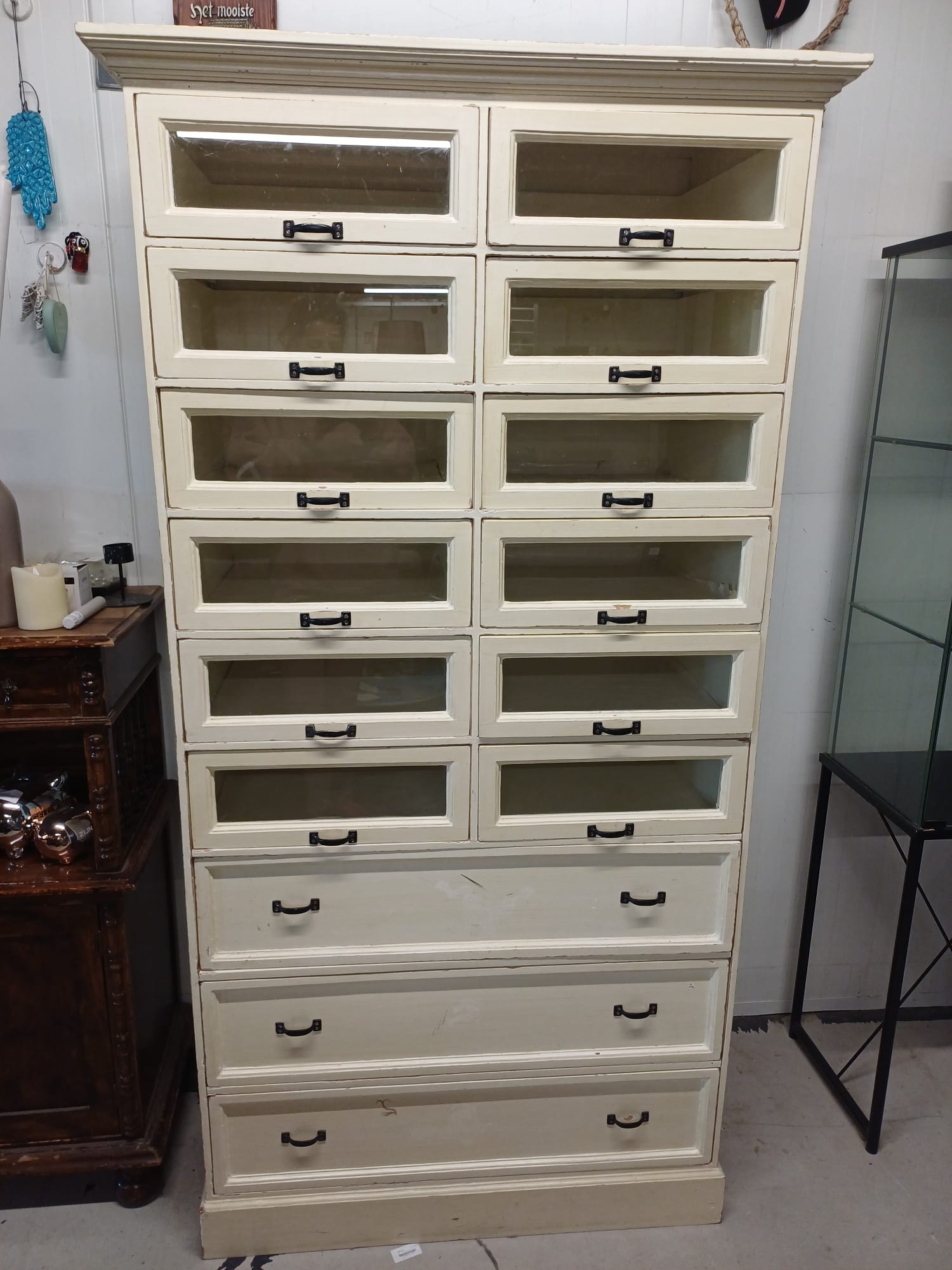 Deze kast heeft 12 glazen lades en 3 gewone lades. De lades zijn handig voor het opbergen van allerlei spullen.