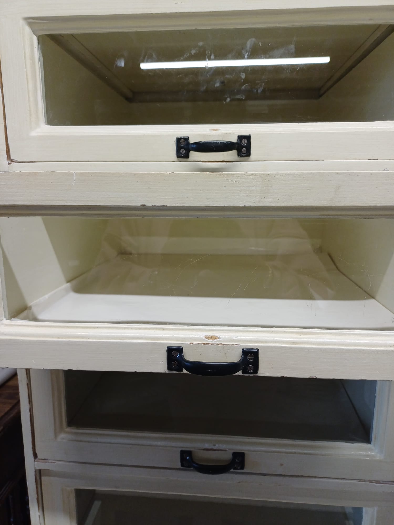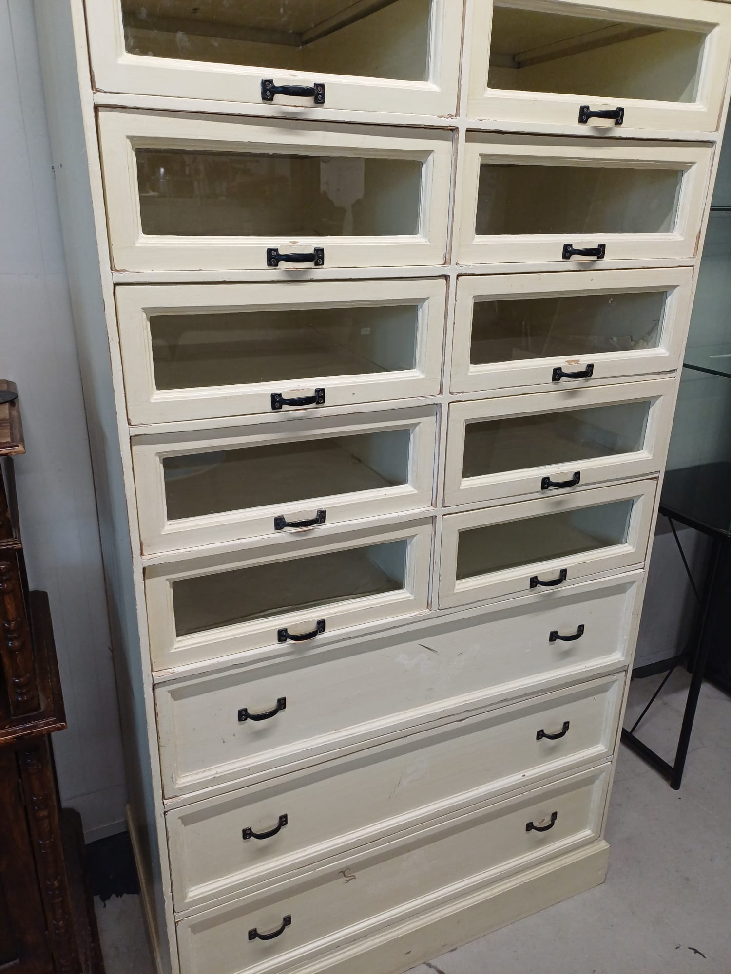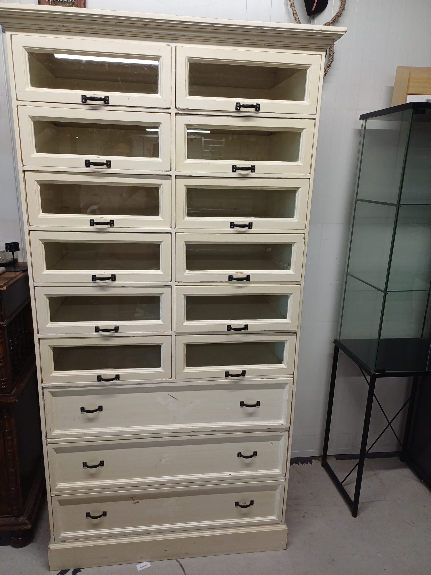 Deze kast heeft 12 glazen lades en 3 gewone lades. De lades zijn handig voor het opbergen van allerlei spullen.