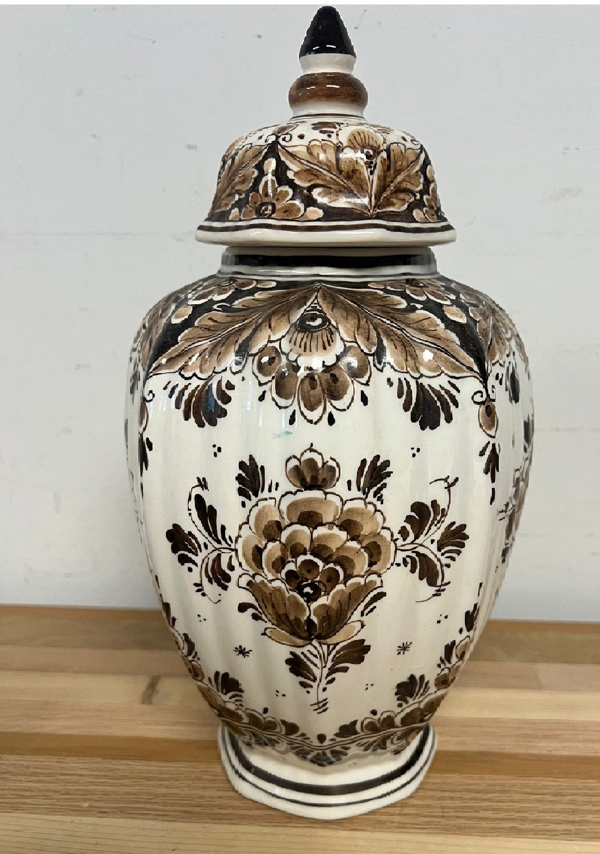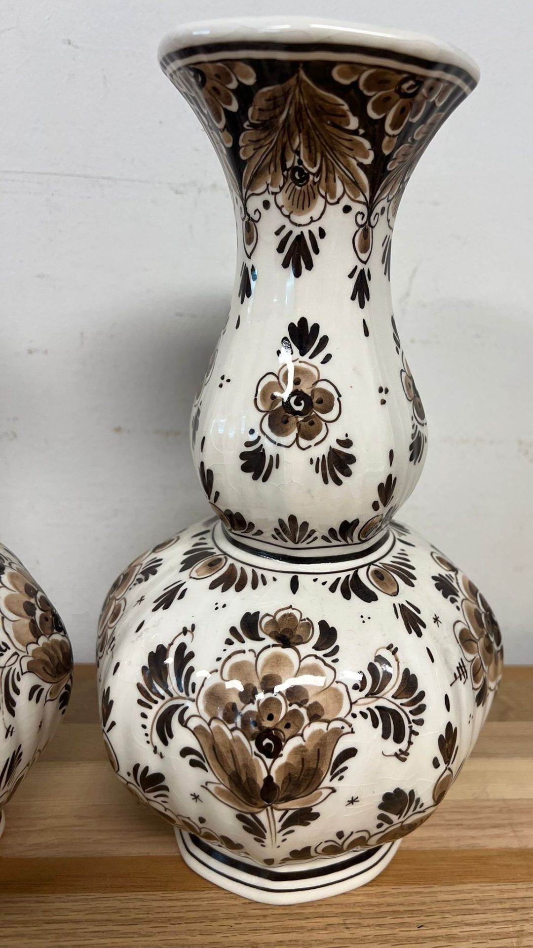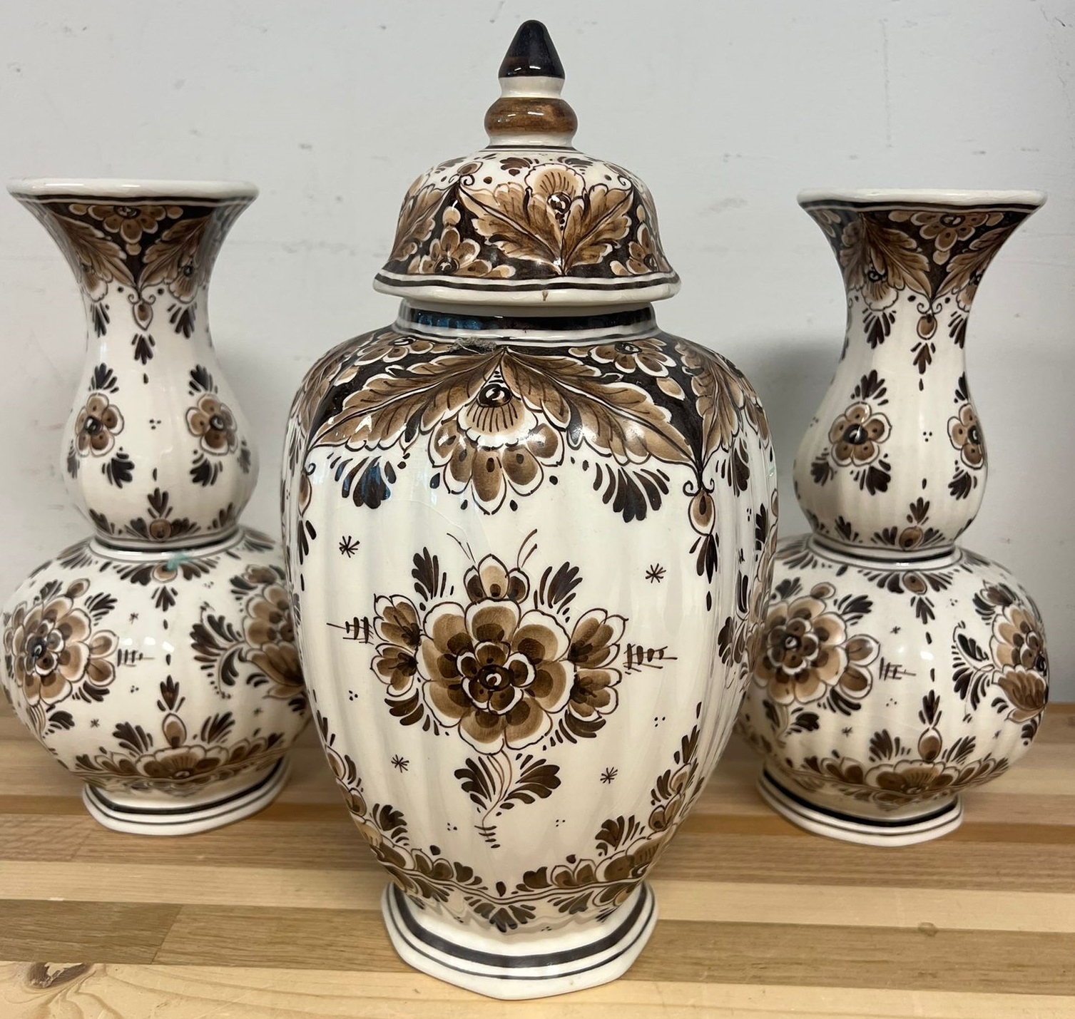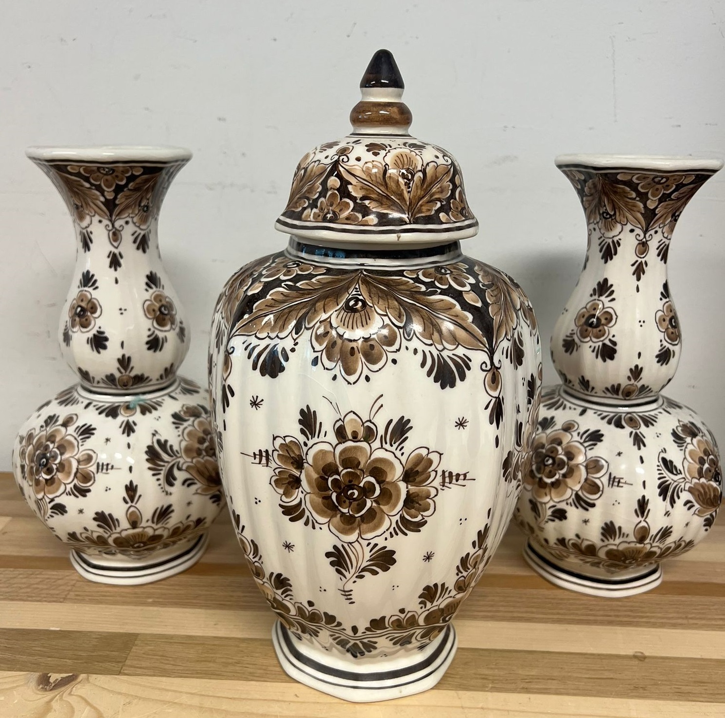 Prachtige set bestaande uit een Golda Brown pot met deksel en twee bijpassende vazen. Deze decoratieve stukken zijn uitgevoerd in een elegant bruin en crèmekleurig bloemmotief, perfect om elke ruimte te verfraaien. De pot en vazen zijn ideaal als blikvanger in uw interieur.