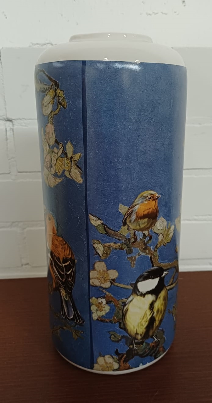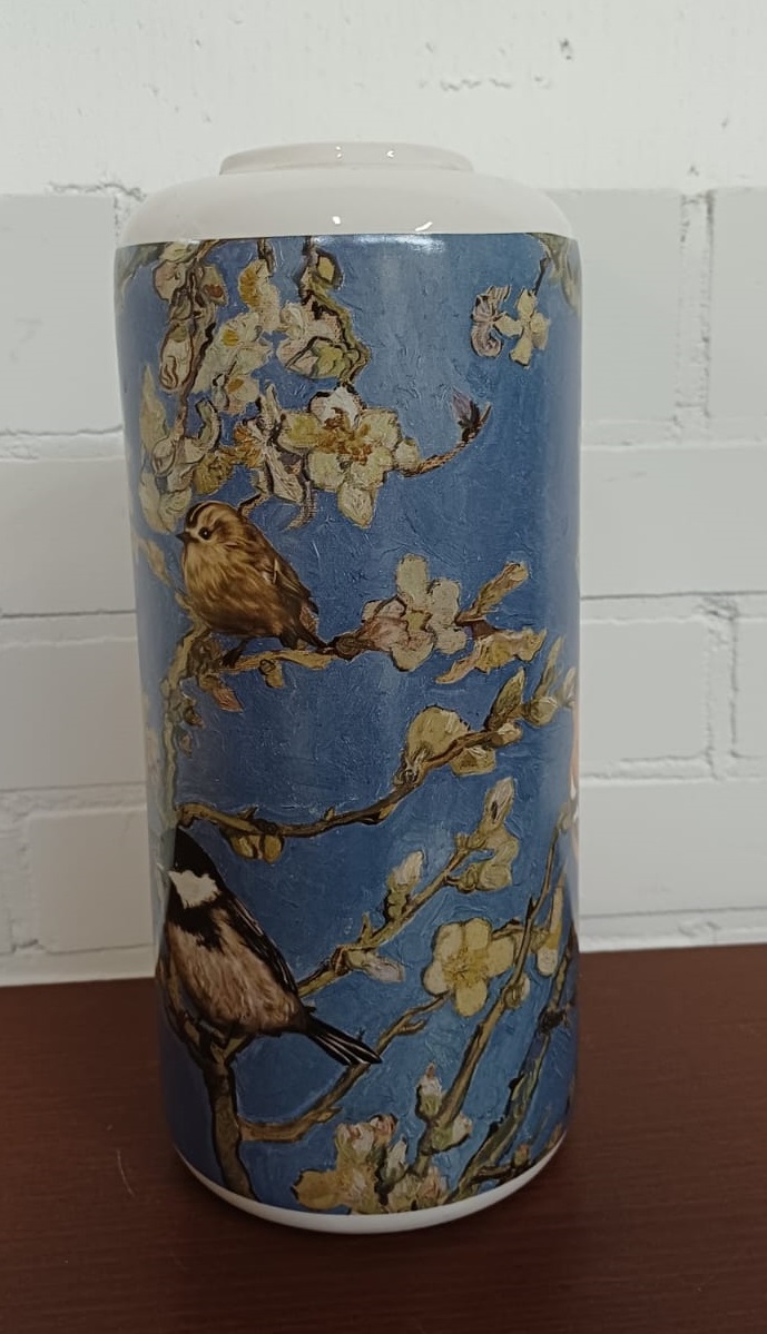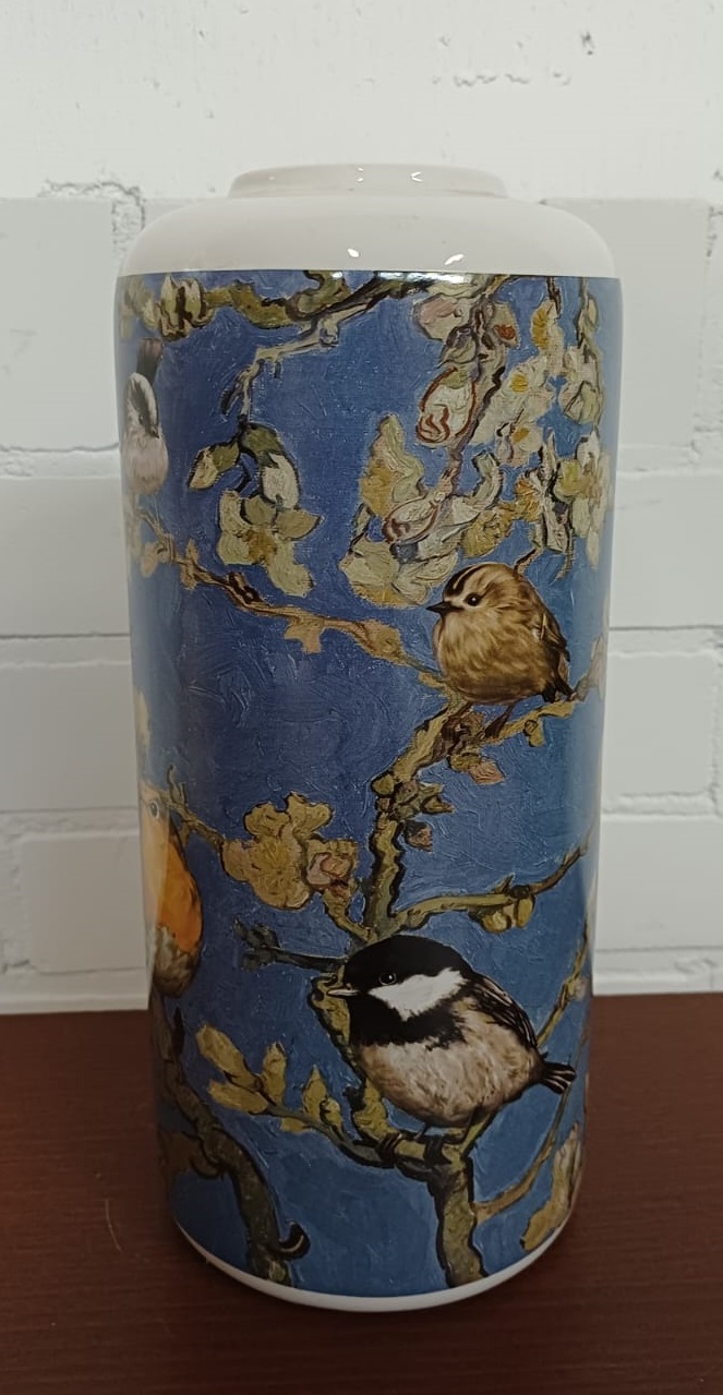 Deze moderne cilinder vaas past prachtig bij elke trendy interieurstijl van nu. De vaas is versierd met een rondlopende afbeelding gebaseerd op het schilderij Amandelbloesem van de Nederlandse kunstschilder Vincent van Gogh. Er zijn wel wat vrolijke bosvogeltjes het schilderij binnengevlogen en ze kijken je nieuwsgierig toe vanaf de vaas. Kortom een heerlijk vrolijke bloemenvaas waar je geen genoeg van kunt krijgen.