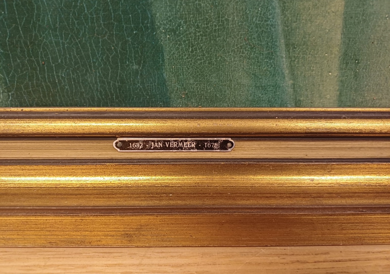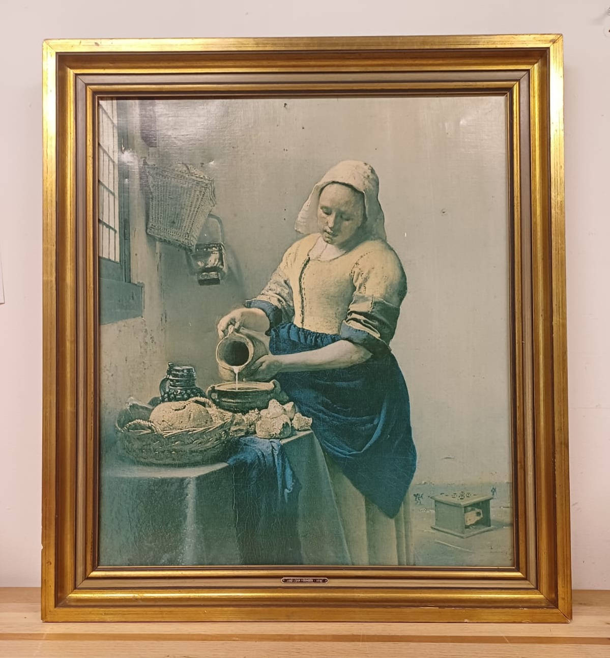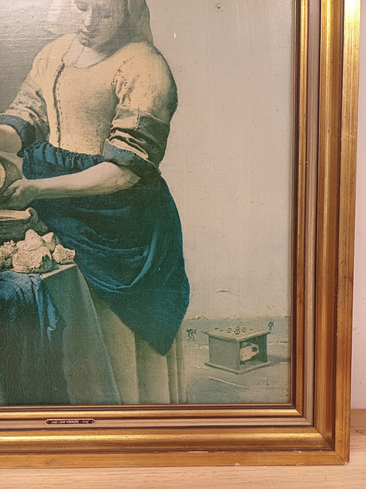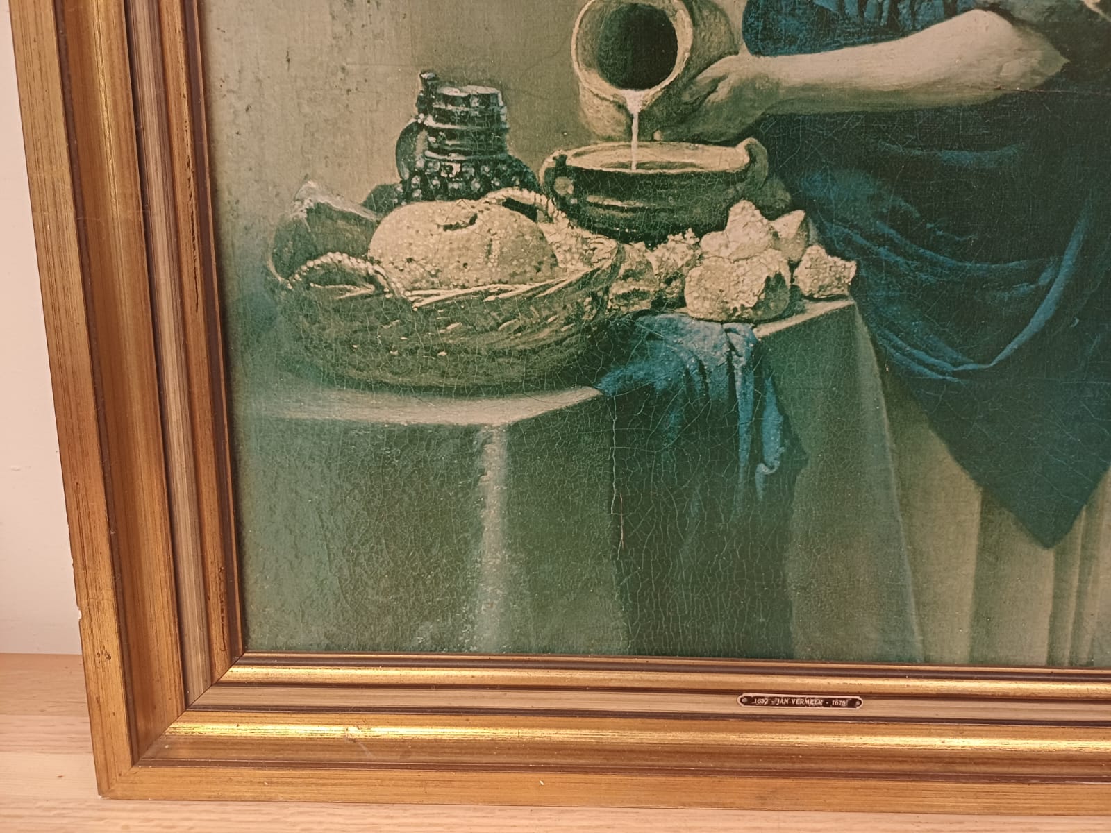 Een reproductie van het beroemde schilderij ‘Het Melkmeisje’ van Jan Vermeer. Dit schilderij toont een dienstmeid die melk in een aardewerken pot giet. Het is een iconisch werk van de Hollandse meester. Het schilderij is ingelijst in een gouden lijst. Perfect voor liefhebbers van klassieke kunst.