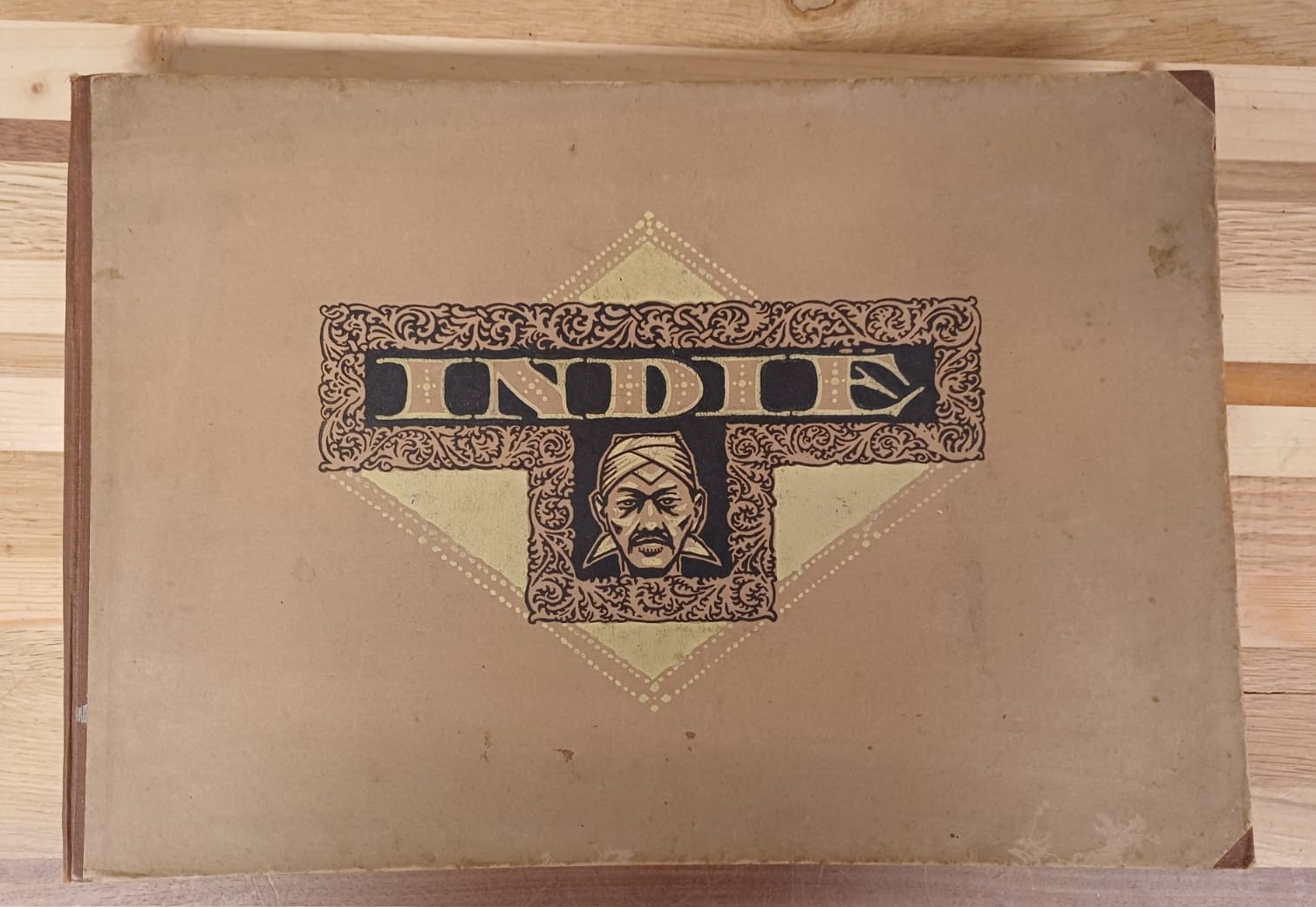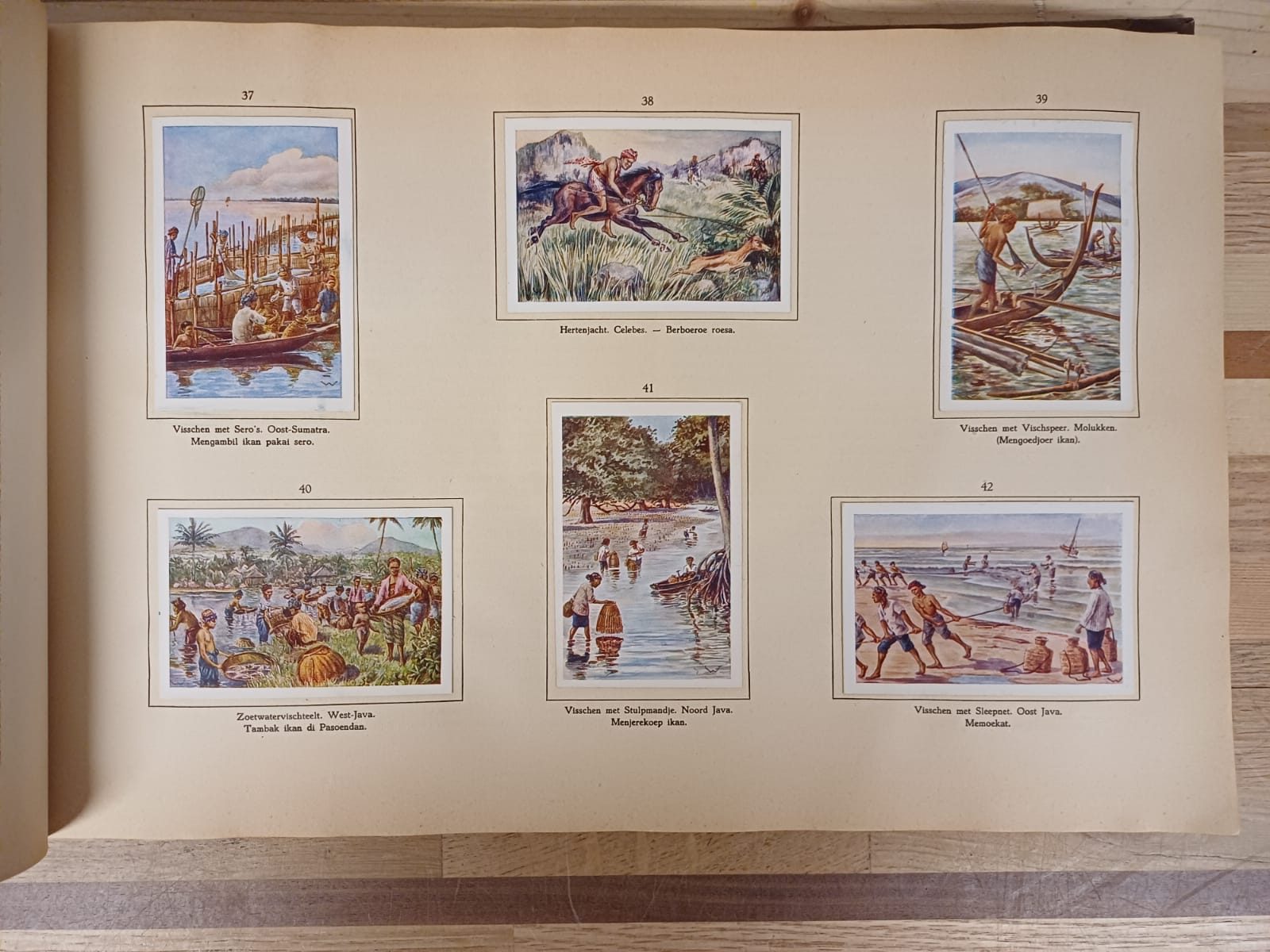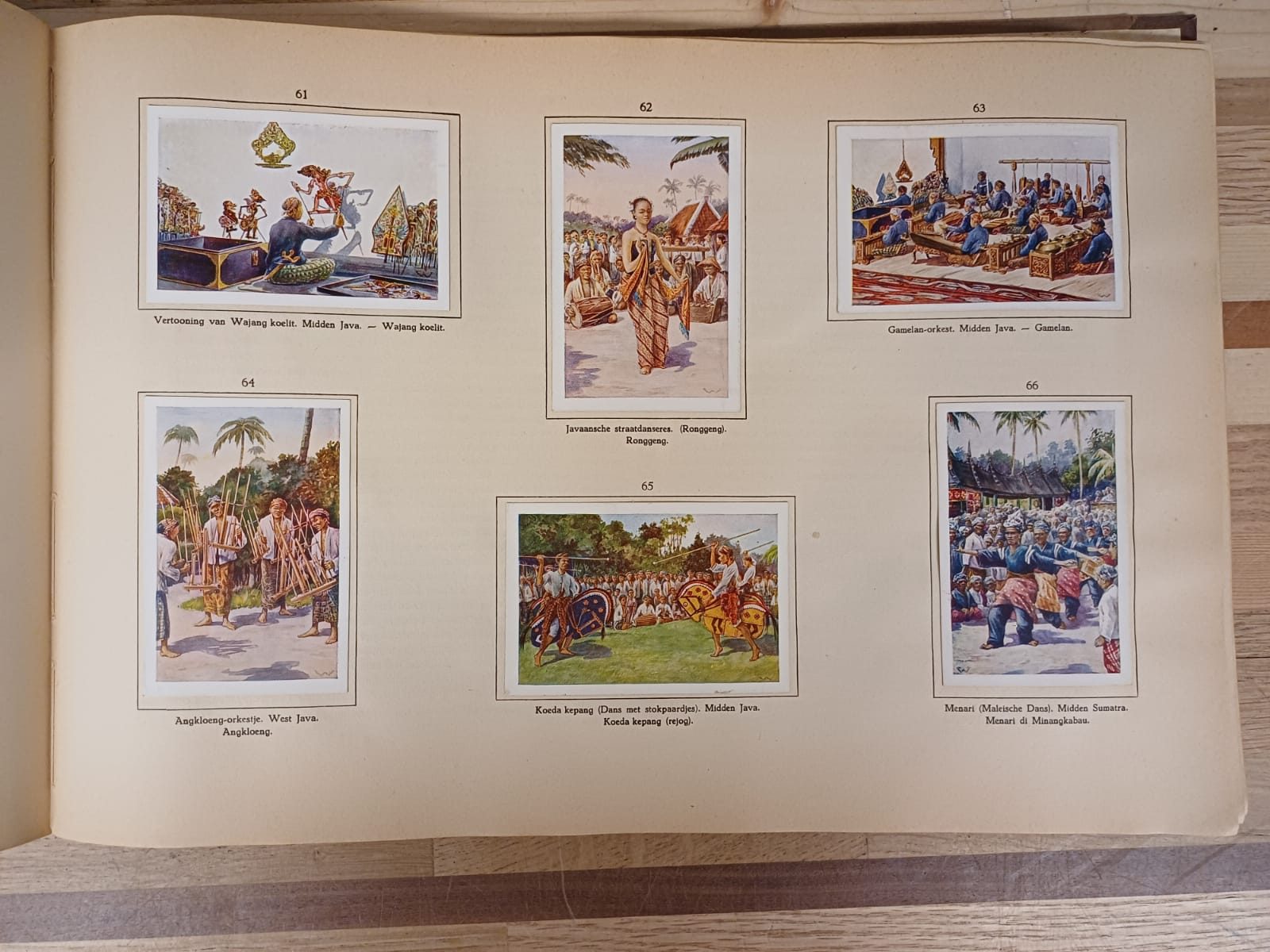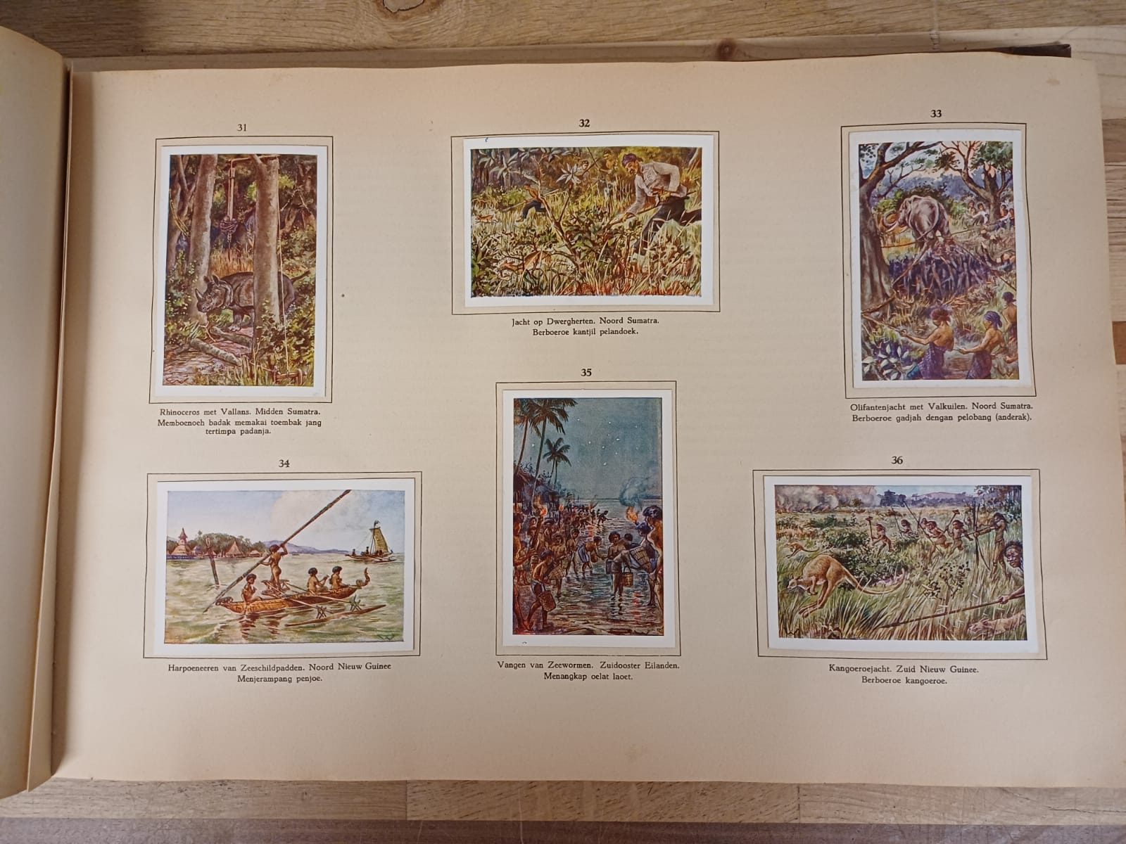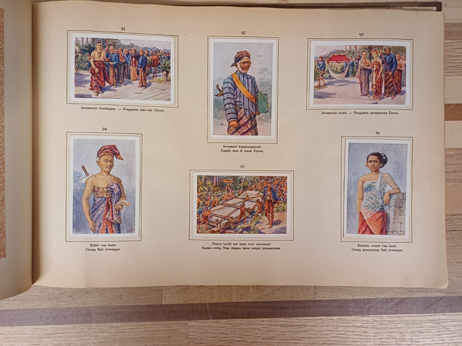 Oud boek met beschrijving van inheemse bevolking van Nederlands-Indië met plaatjes verkregen uit aankopen van Droste artikelen. Een mooie uitgave met prachtige illustraties van het voormalig Nederlands-Indië.