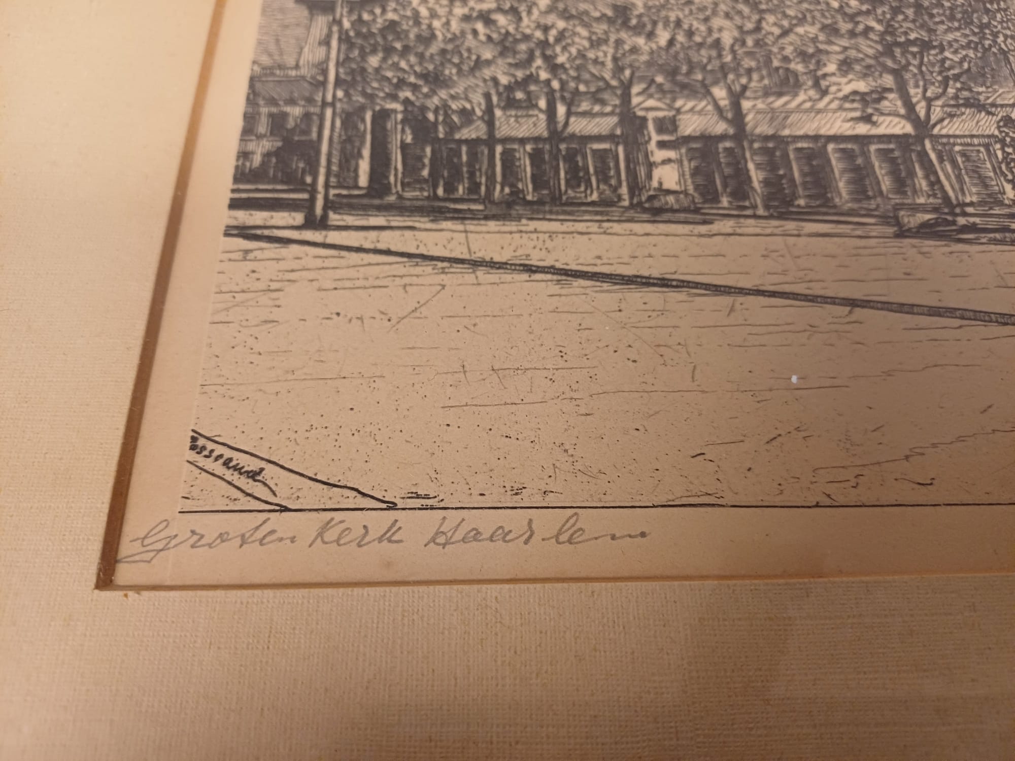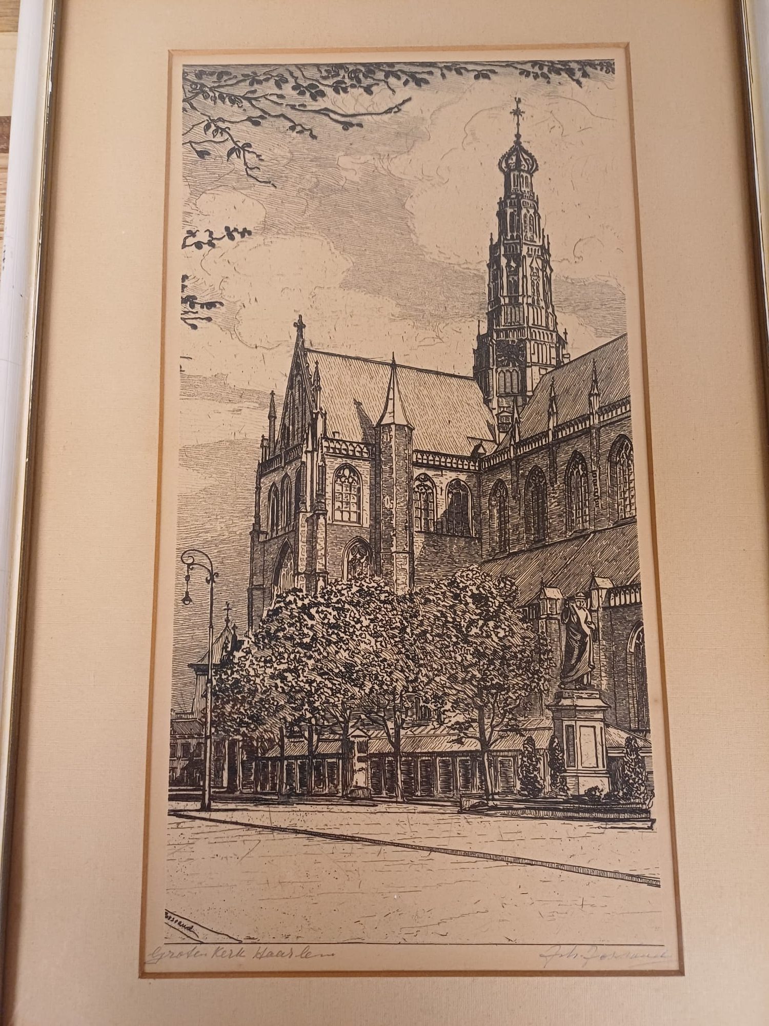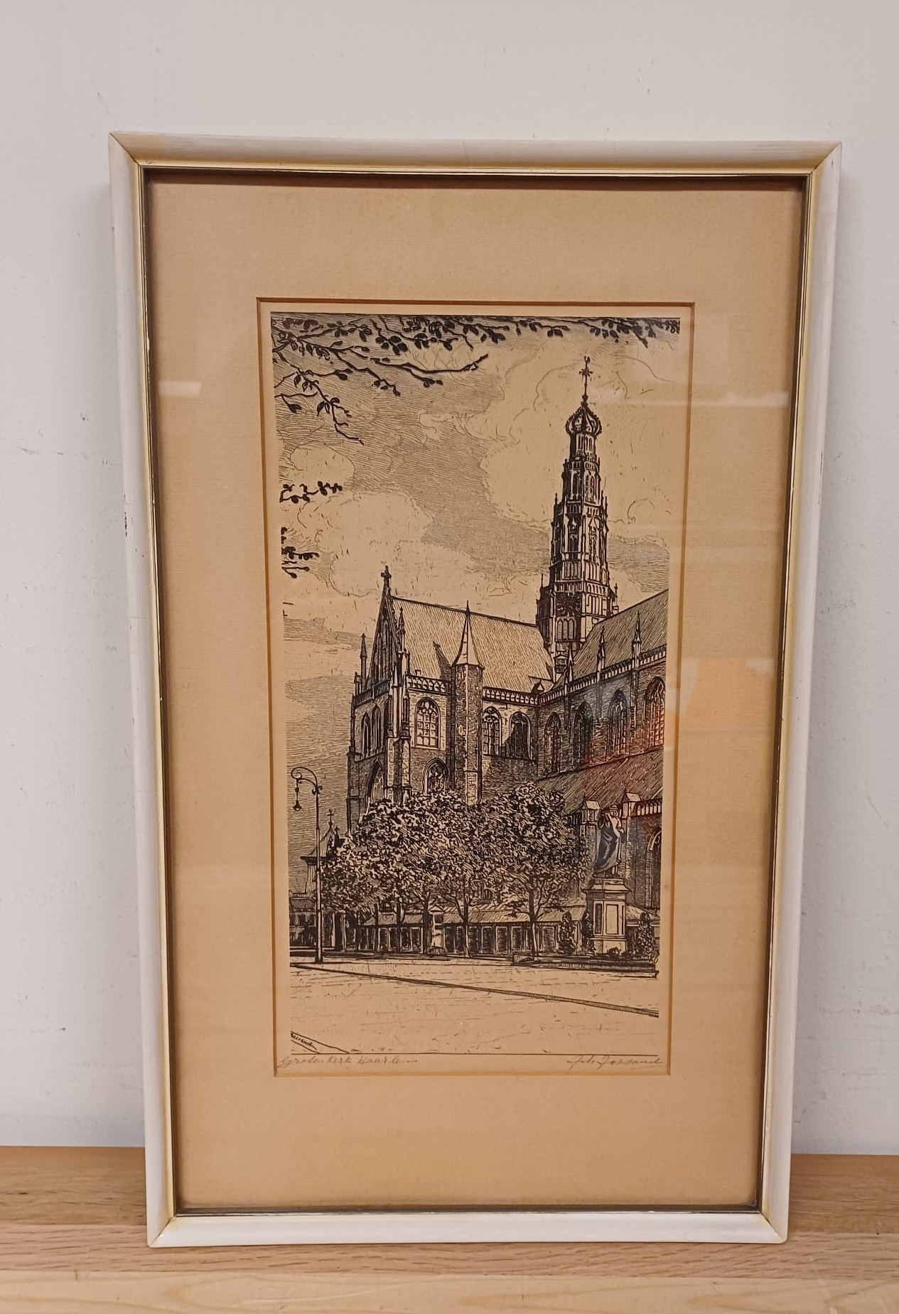 Een mooie ets van Johannes Josseaud, voorstellende de Grote Kerk in Haarlem. De ets is ingelijst en gesigneerd door de kunstenaar. Een prachtig stuk voor liefhebbers van Haarlemse stadsgezichten en etsen.