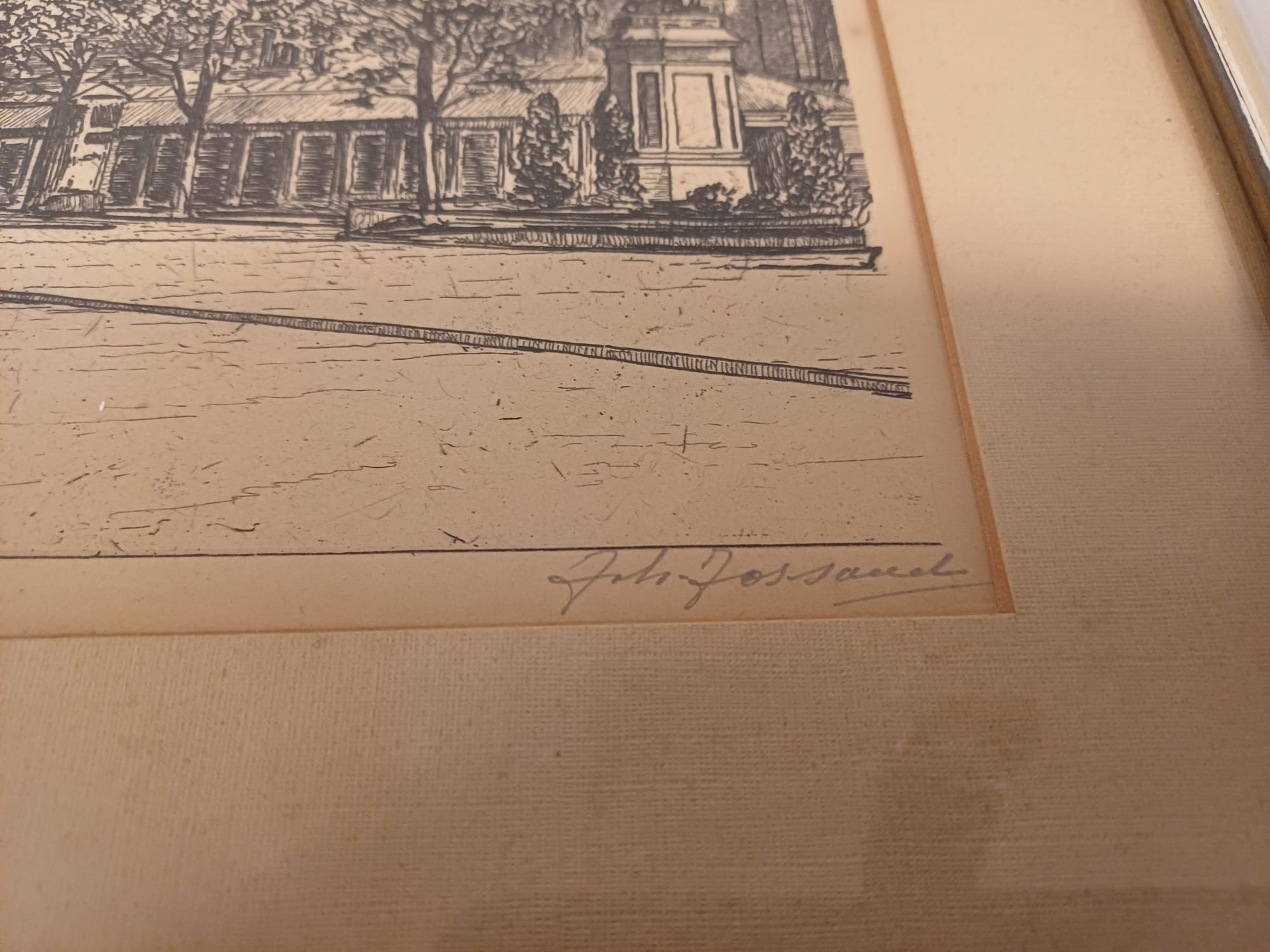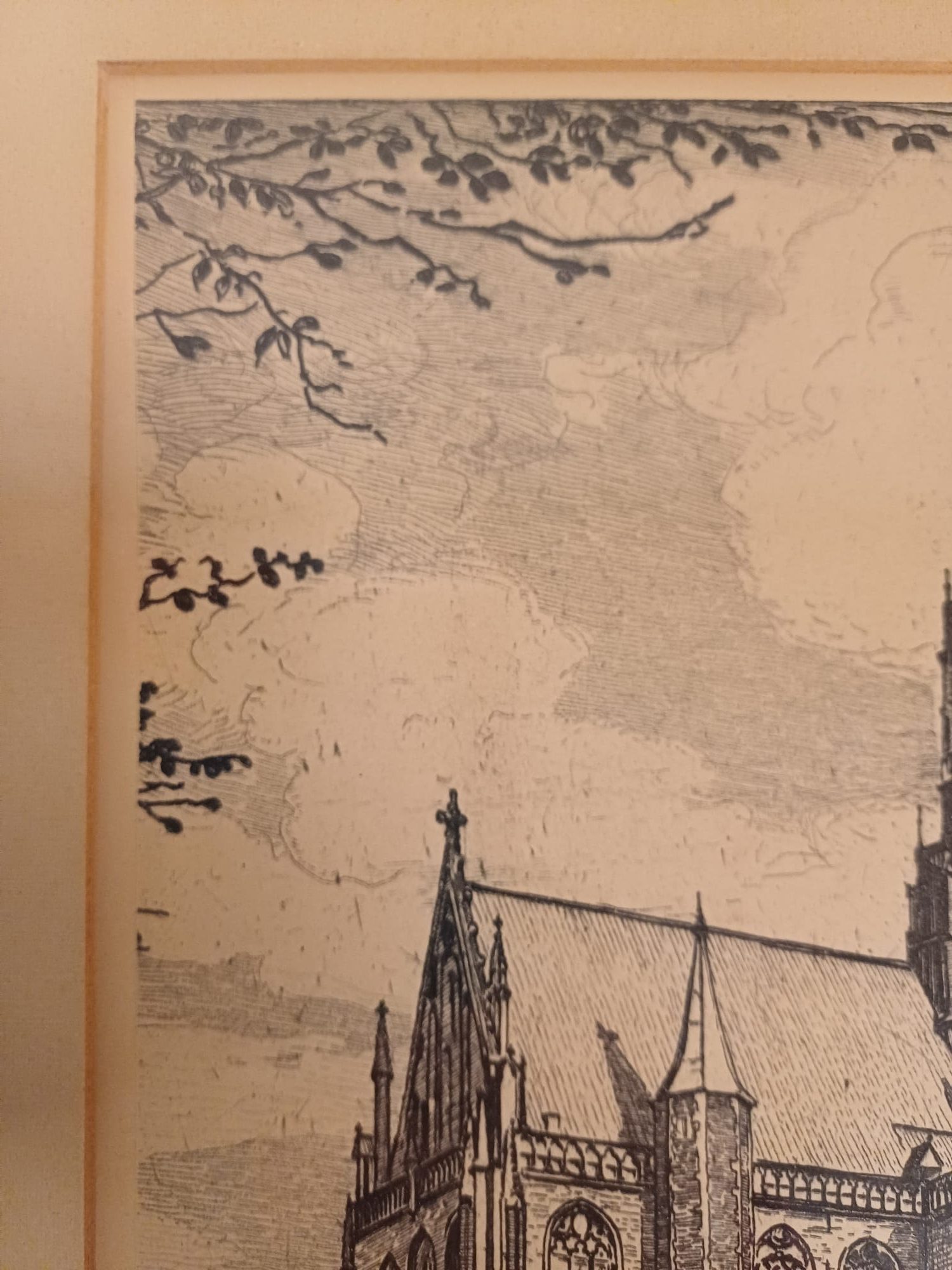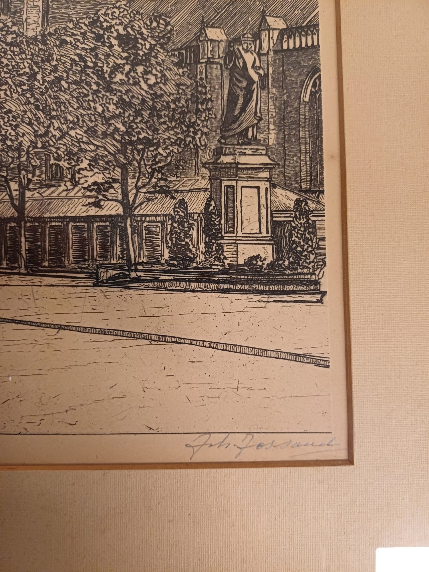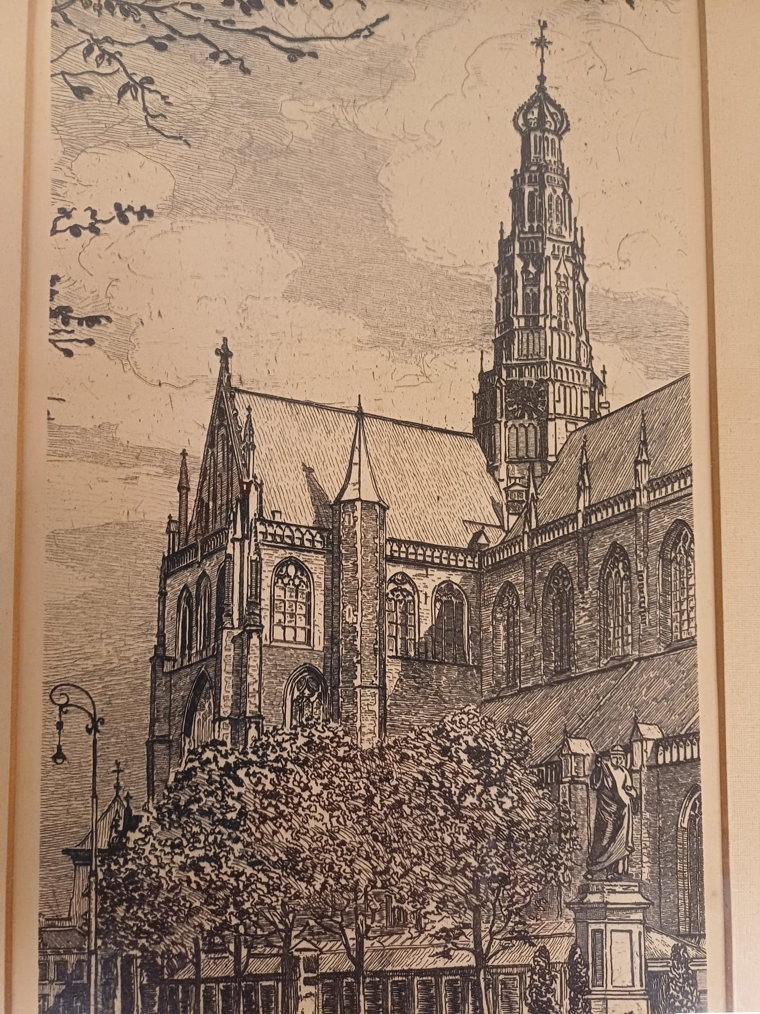 Een mooie ets van Johannes Josseaud, voorstellende de Grote Kerk in Haarlem. De ets is ingelijst en gesigneerd door de kunstenaar. Een prachtig stuk voor liefhebbers van Haarlemse stadsgezichten en etsen.