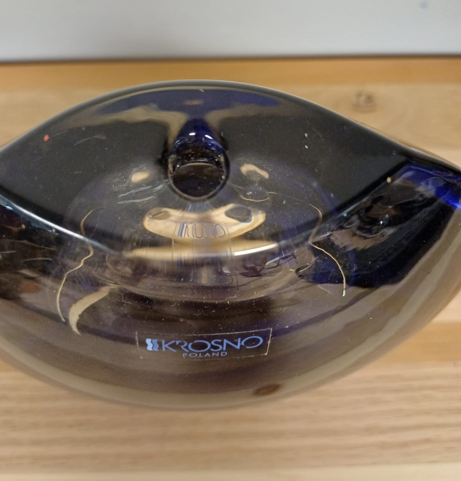 Mooi vaasje van Krosno Polen, gemaakt van blauw glas. Het vaasje heeft een uniek design. Perfect voor een bloemetje of als decoratie.
