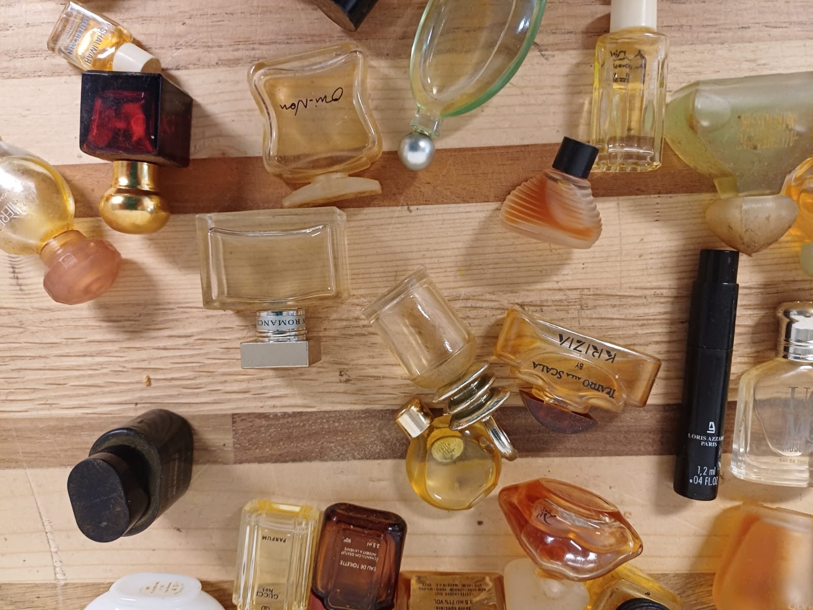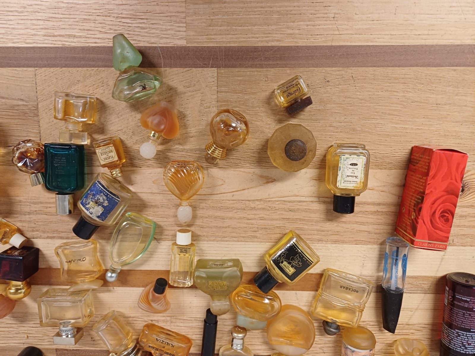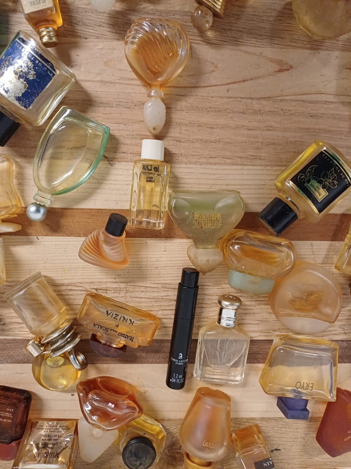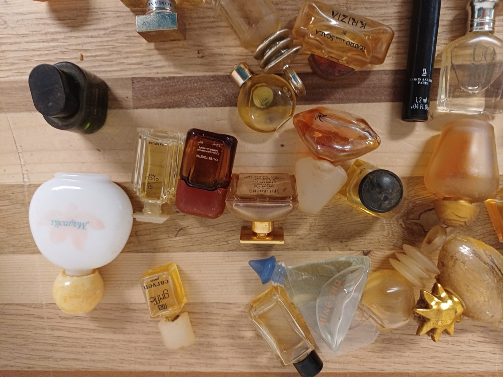 Een verzameling van verschillende miniatuur parfumflesjes. De flesjes zijn van diverse merken en in verschillende vormen.