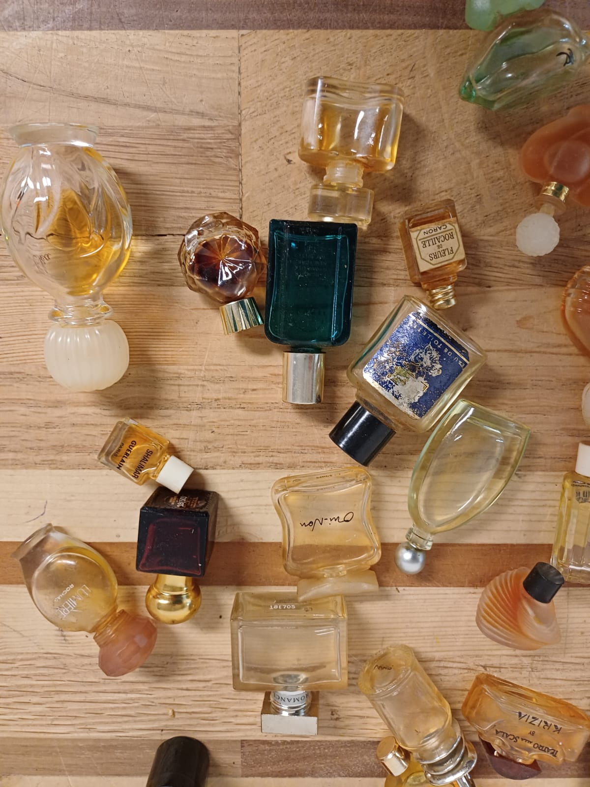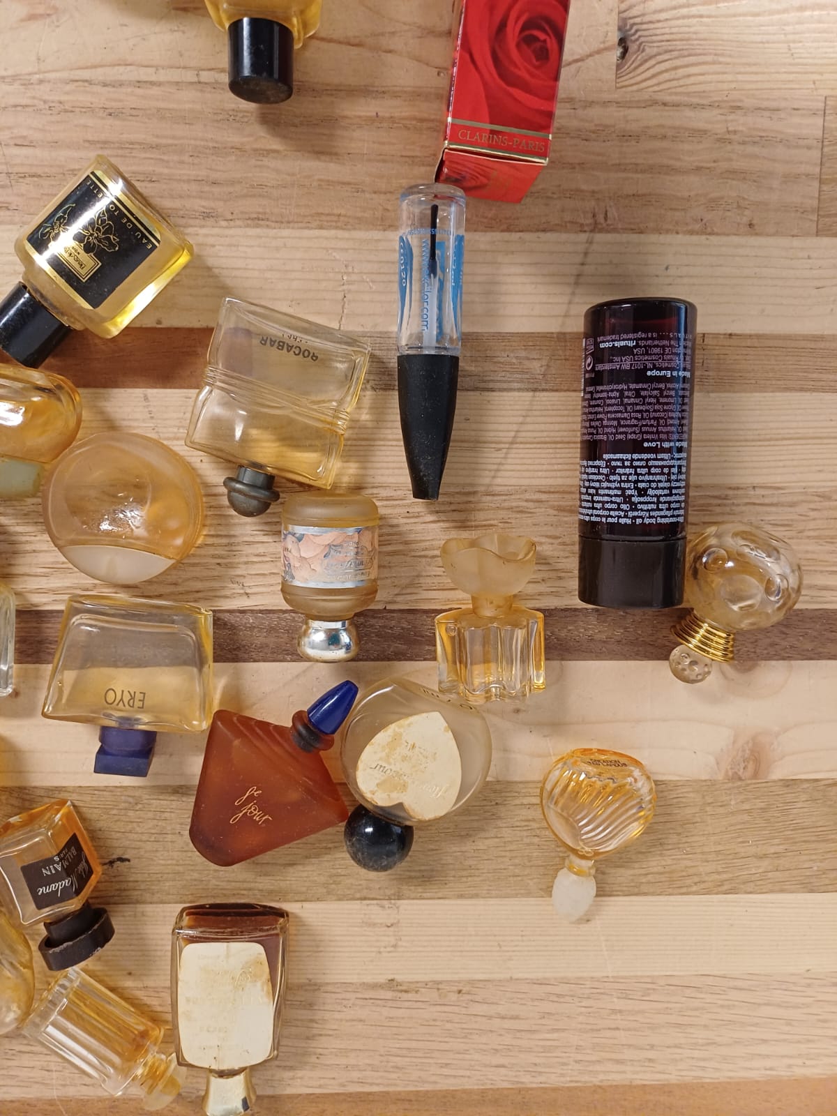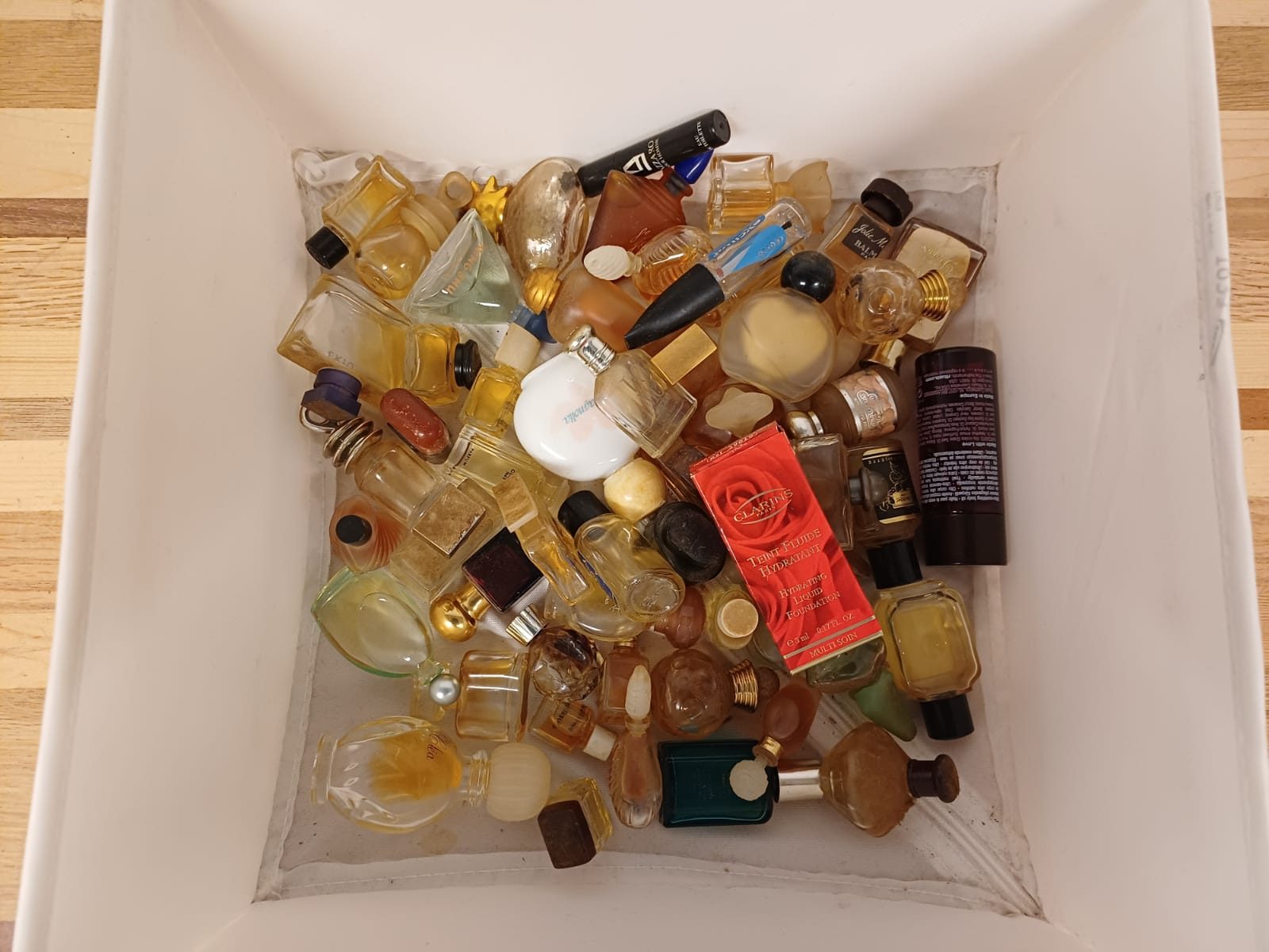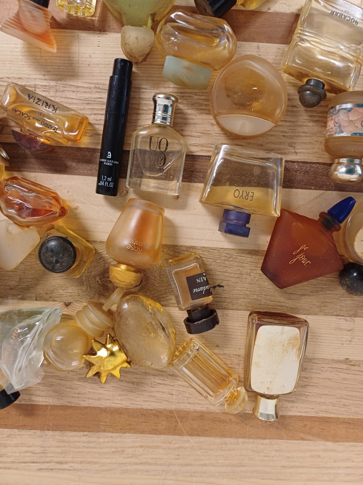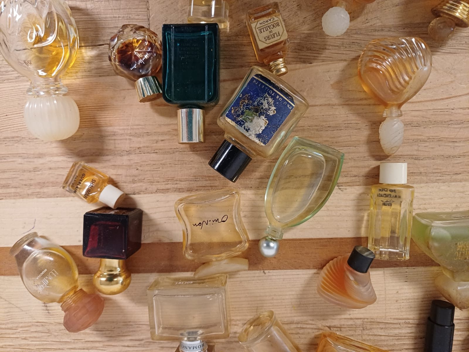 Een verzameling van verschillende miniatuur parfumflesjes. De flesjes zijn van diverse merken en in verschillende vormen.