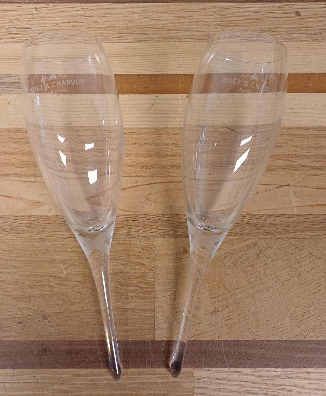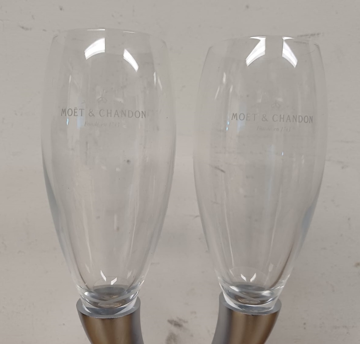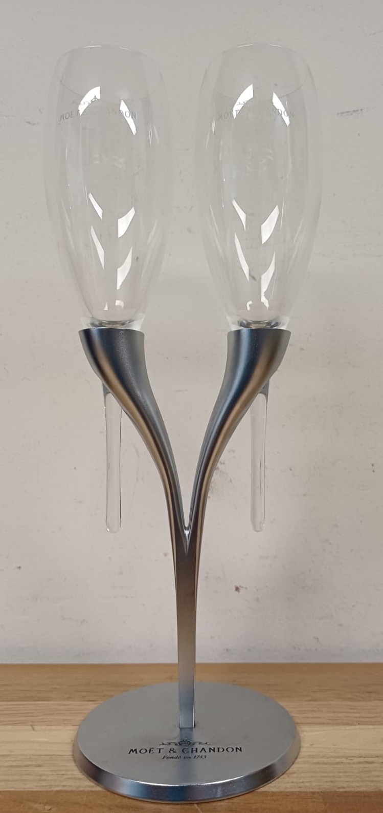 De kristallen flutes hangen in de houder en zijn ingegraveerd met tekst Moët & Chandon en met het bekende lintje.