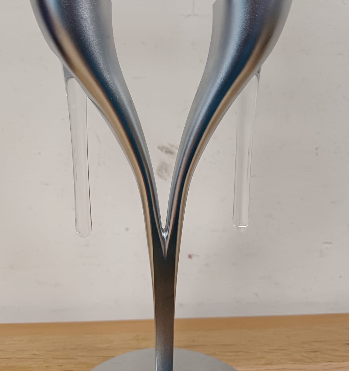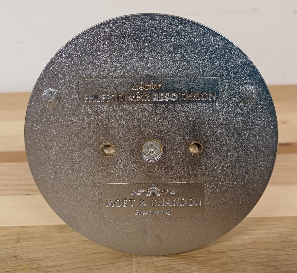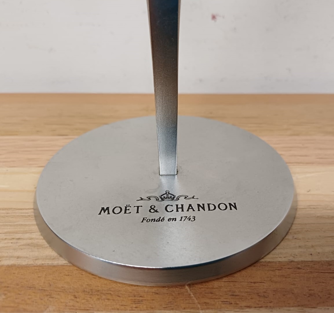 De kristallen flutes hangen in de houder en zijn ingegraveerd met tekst Moët & Chandon en met het bekende lintje.