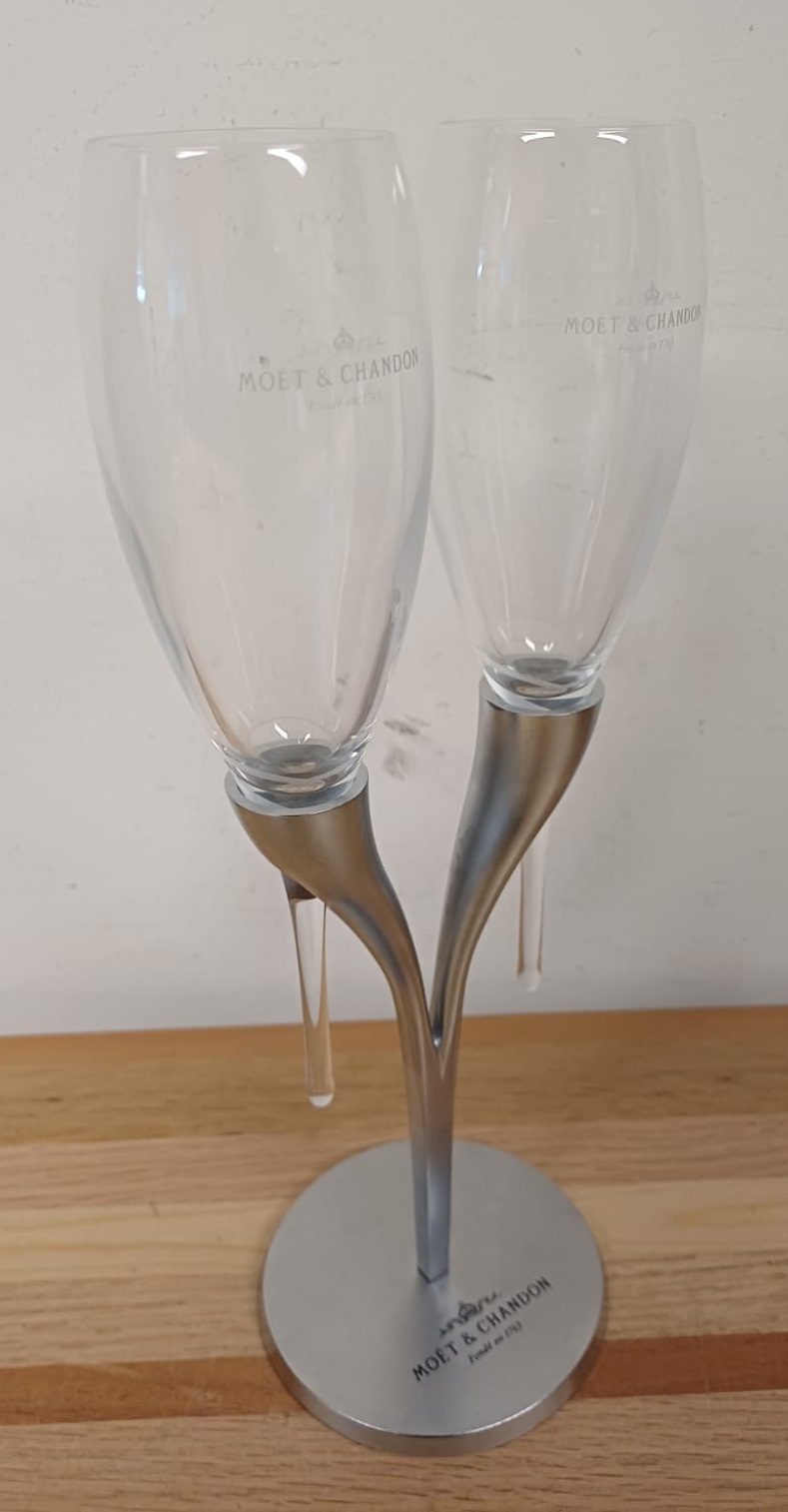 Stijlvolle Moet & Chandon set kristallen champagneglazen in houder. Perfect voor een sprankelende toast. Deze glazen zijn niet alleen functioneel maar ook een echte eyecatcher in je interieur.