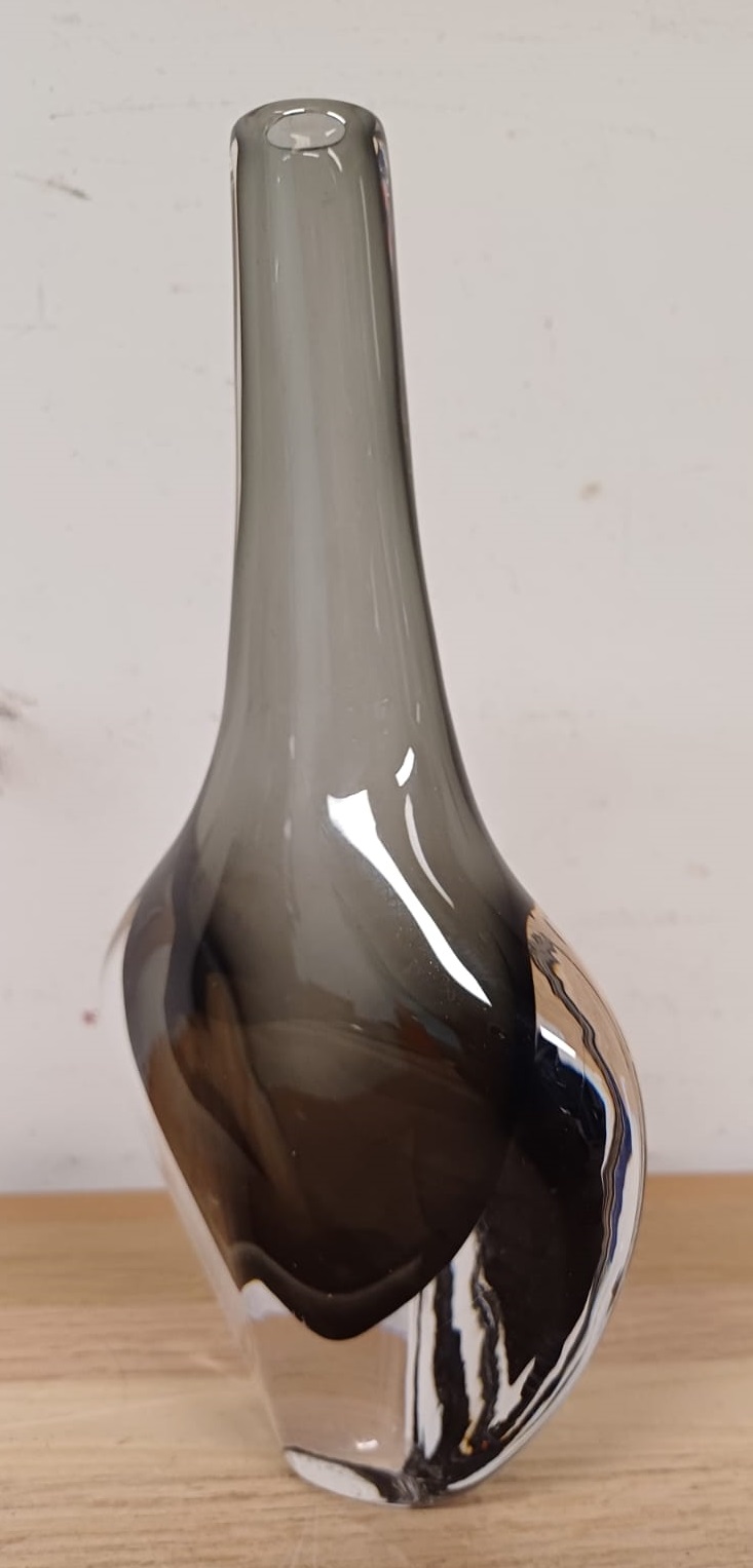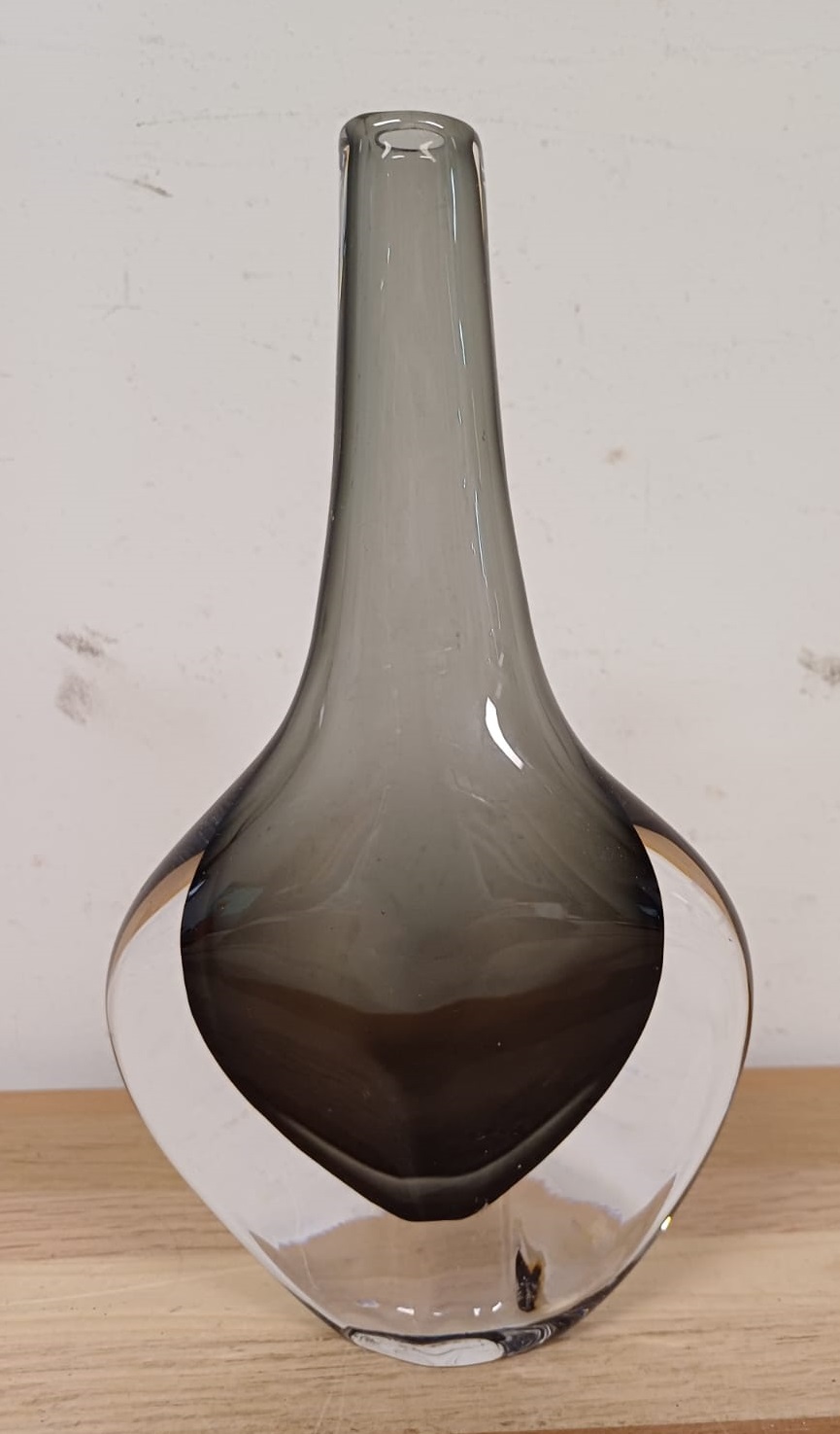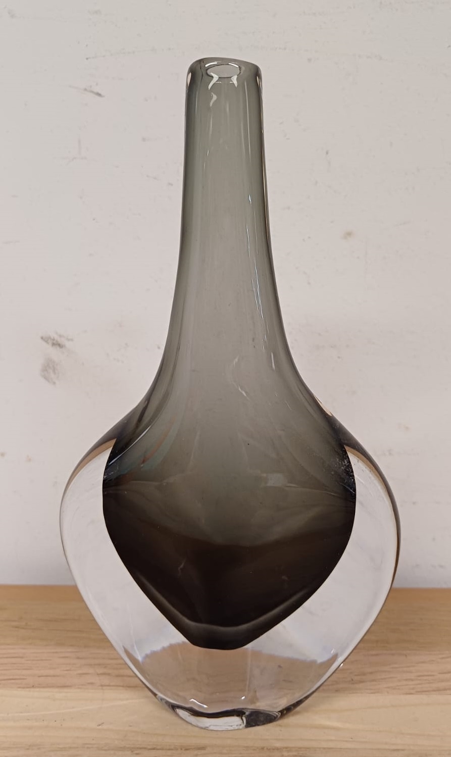 Deze Sommerso vaas is gemaakt van zeer massief Orrefors helder kristal met een prachtige donkere, rokerig-olijfkleurige tint. De vaas is met de hand geblazen en hoewel er vergelijkbare ontwerpen bestaan, is geen enkel exemplaar exact hetzelfde – er zijn subtiele verschillen in vorm en kleur. Deze vaas is op zichzelf al een blikvanger en staat ook prachtig in combinatie met andere modellen uit dezelfde serie.