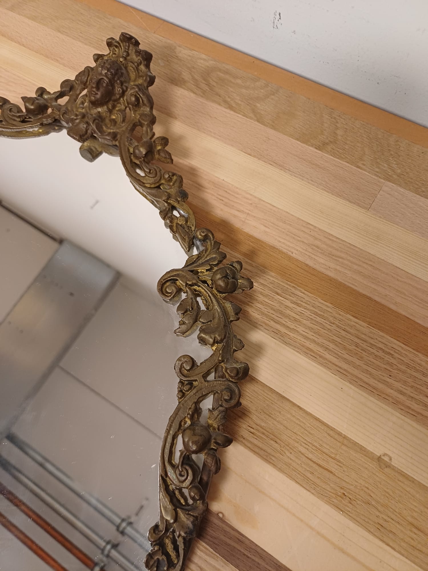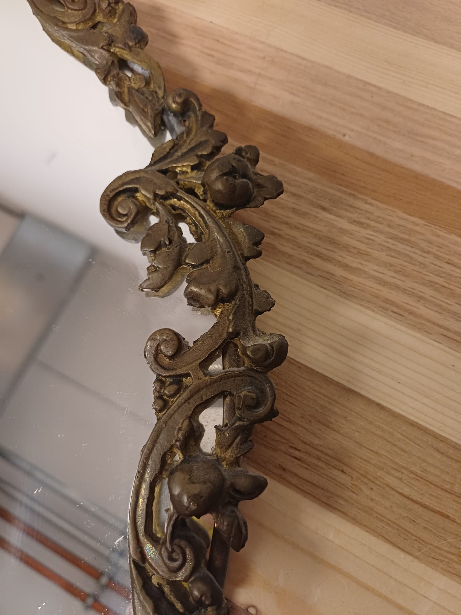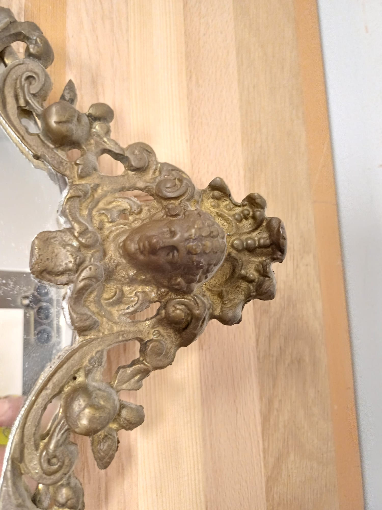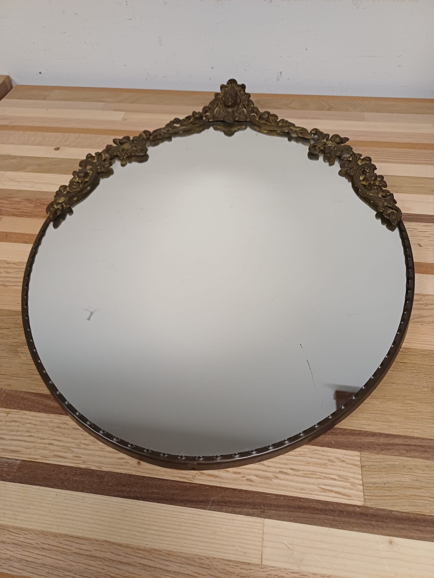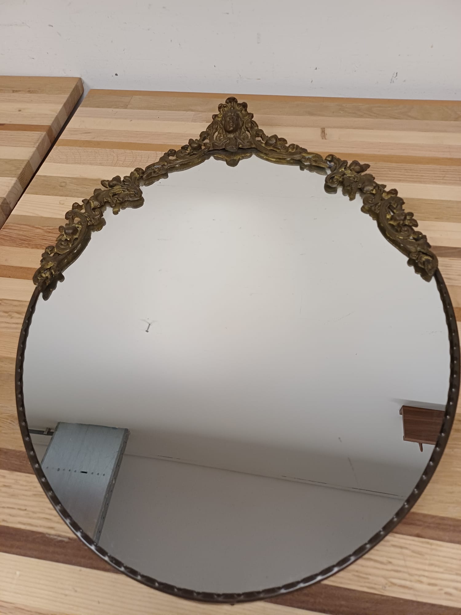 Deze ovale spiegel heeft een koperen rand met versieringen aan de bovenkant.