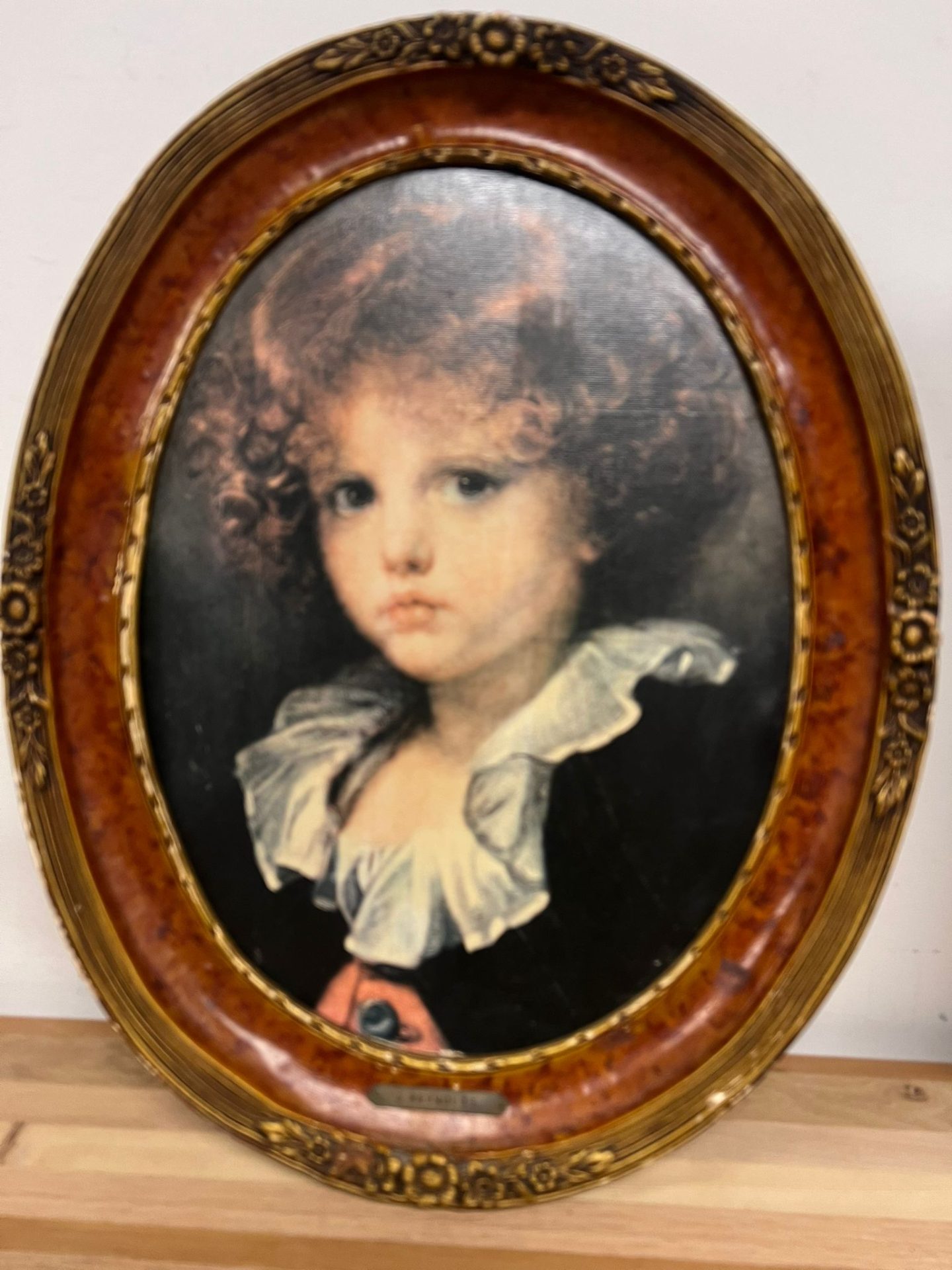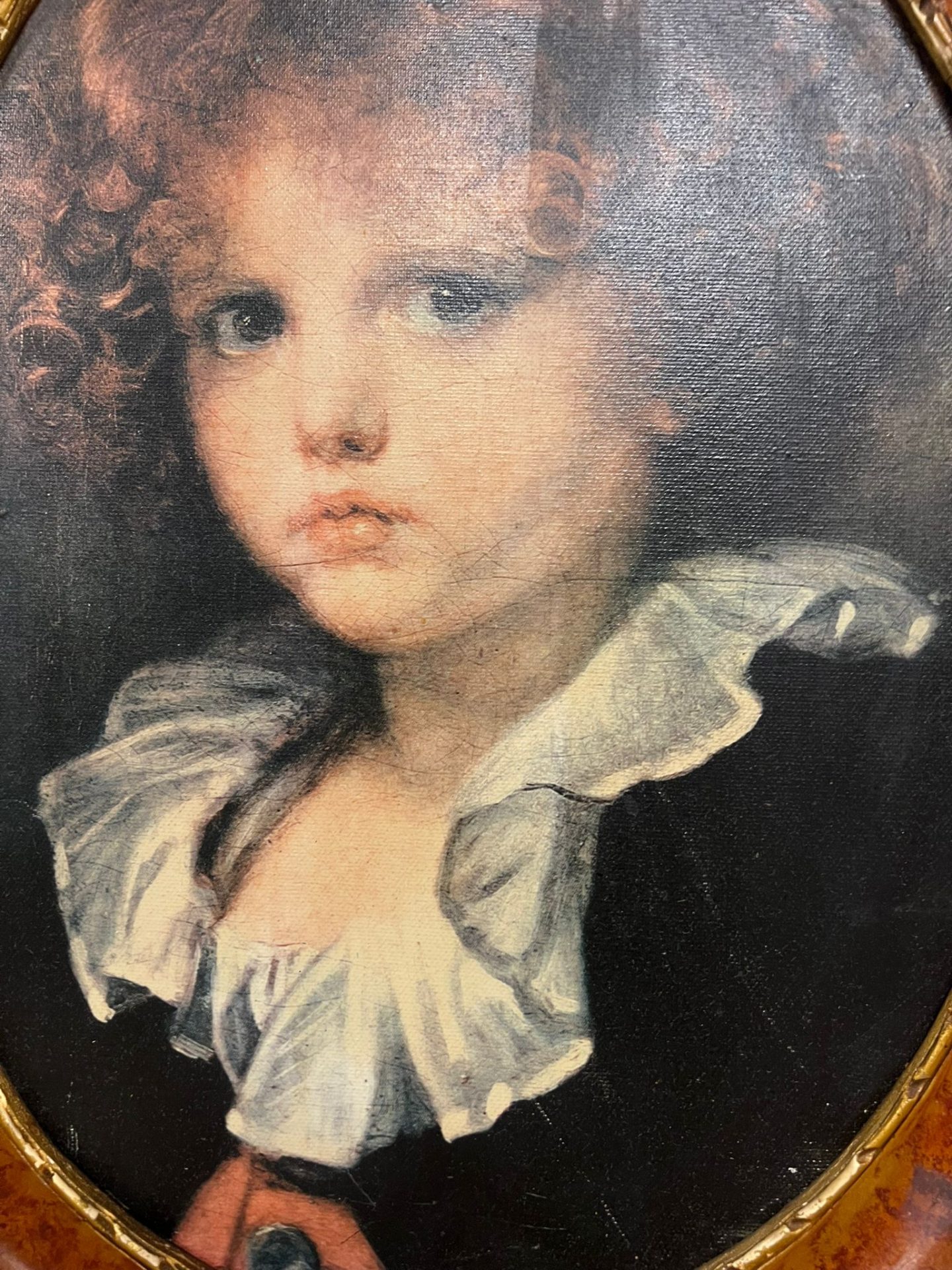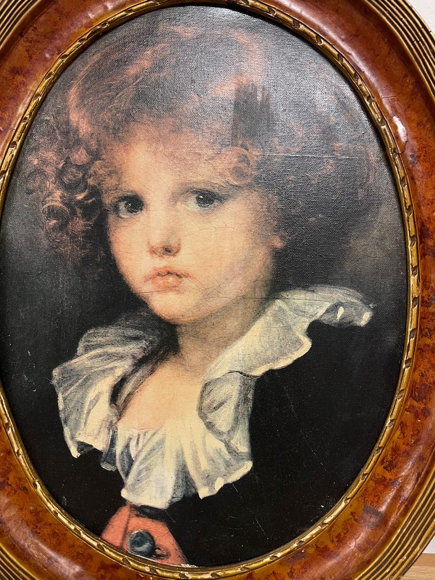 Mooie ovale lijst met een prent van J. Reynolds, vermoedelijk ‘The Age of Innocence’ of een vergelijkbaar werk. De lijst heeft een klassieke uitstraling met een warme bruine tint en gouden accenten, wat het geheel een elegante look geeft. De prent toont een charmant kindportret, kenmerkend voor de stijl van Reynolds. Een prachtige toevoeging aan elk interieur.
