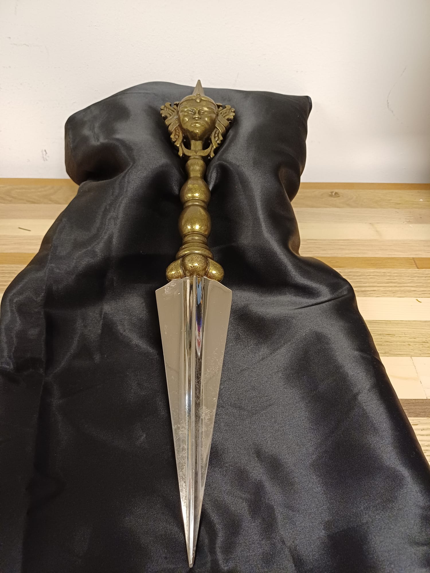 Authentieke Phurbu Dolk, een ritueel object uit Tibet. Deze dolk, ook wel bekend als een Kila, wordt gebruikt in het Tibetaans boeddhisme voor spirituele doeleinden, zoals het verdrijven van negatieve energieën en het vastzetten van positieve krachten. Het handvat is versierd met een gedetailleerd gezicht en de dolk zelf is gemaakt van metaal. Een uniek en waardevol object voor verzamelaars en beoefenaars van het Tibetaans boeddhisme.