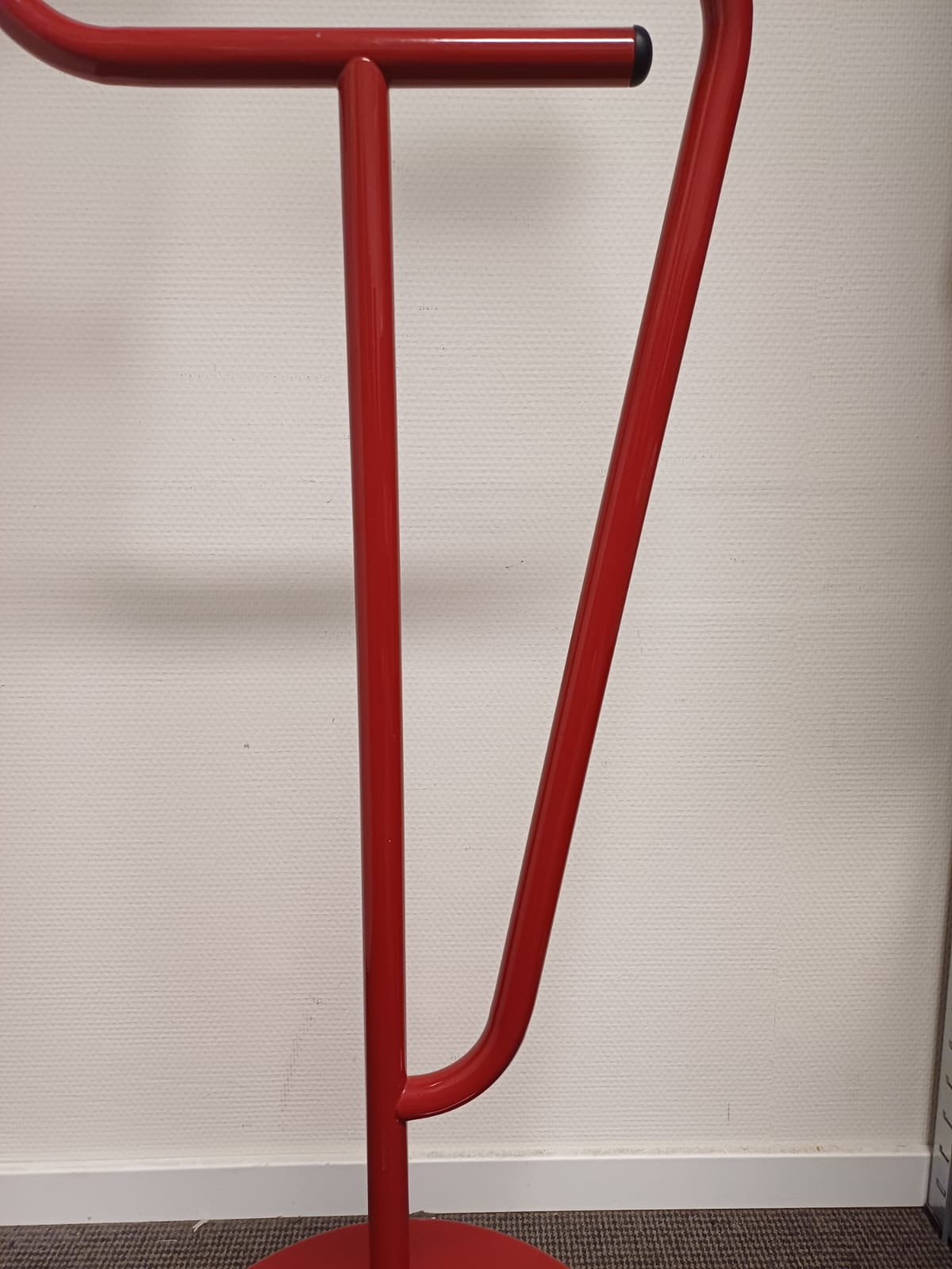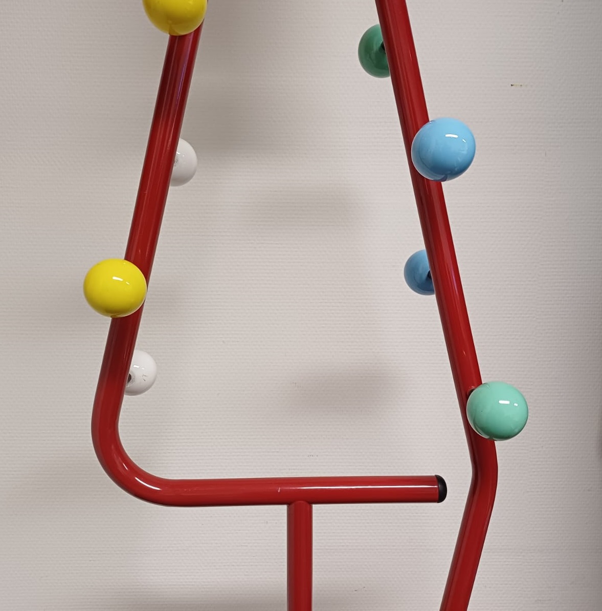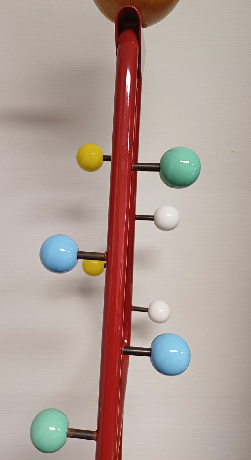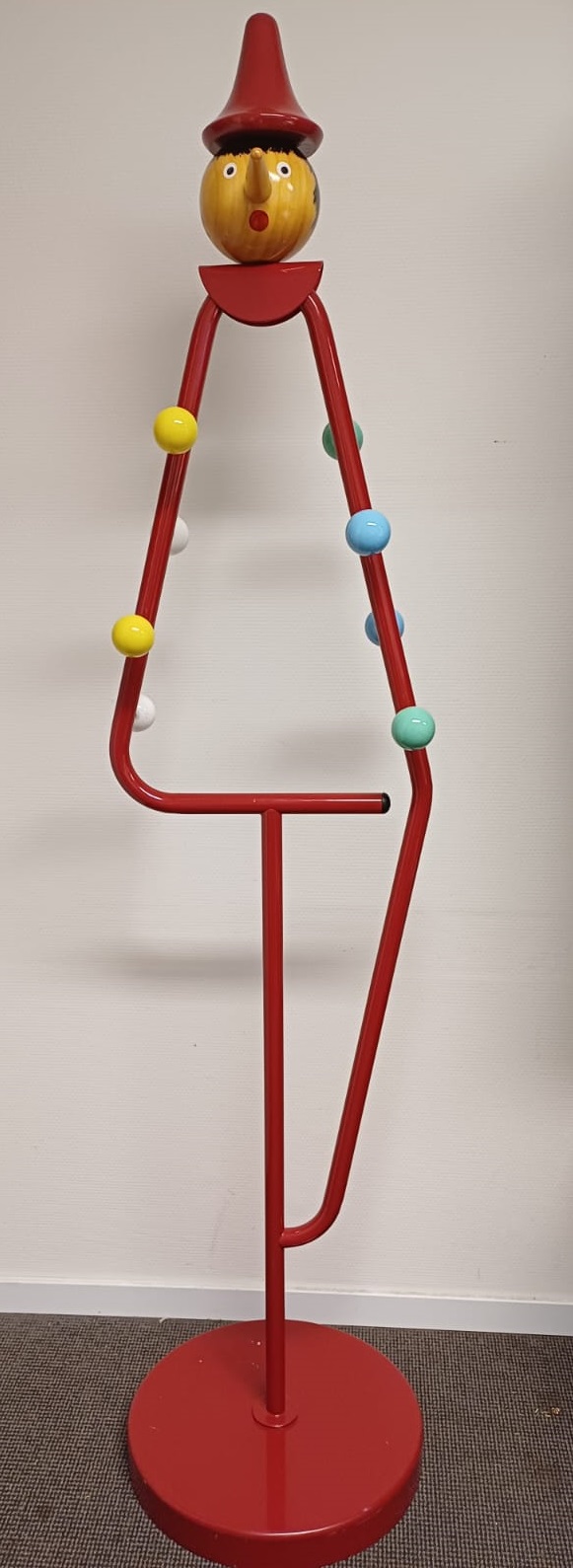 Pinokkio kapstok van Giocattoli Galetti Milano uit de jaren 50. Deze kapstok, gemaakt in de jaren 50 door Giocattoli Galetti in Milaan, heeft een handbeschilderde Pinokkio-kop van beukenhout en de houten ballen zijn gelakt. De rode kraag en de buizen waaruit de kapstok bestaat, zijn van metaal en de voet is van gelakt hout (gietijzer).