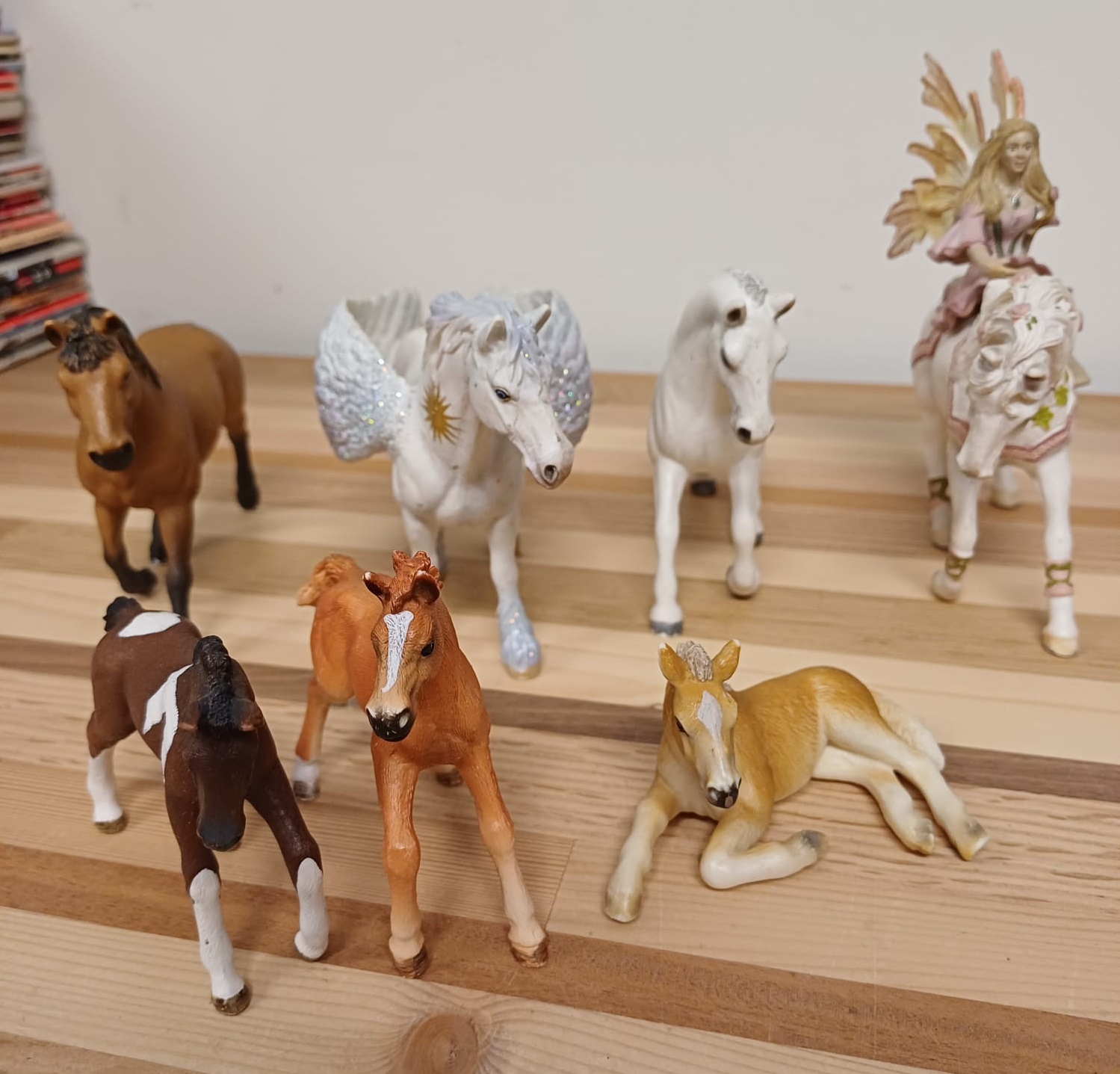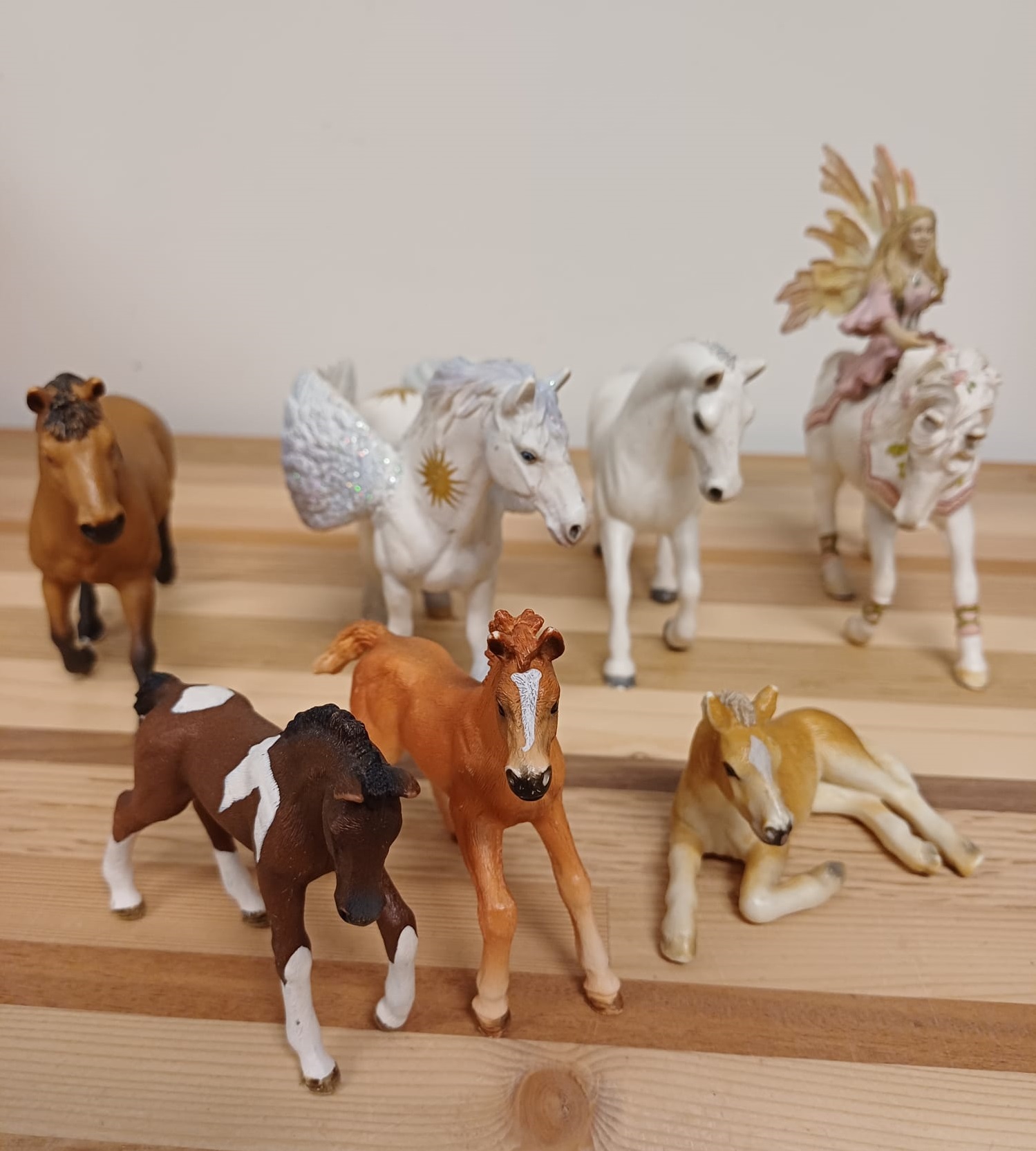 Een verzameling van 7 Schleich paarden figuren. Verschillende modellen en kleuren. Ideaal voor de verzamelaar of als speelgoed.