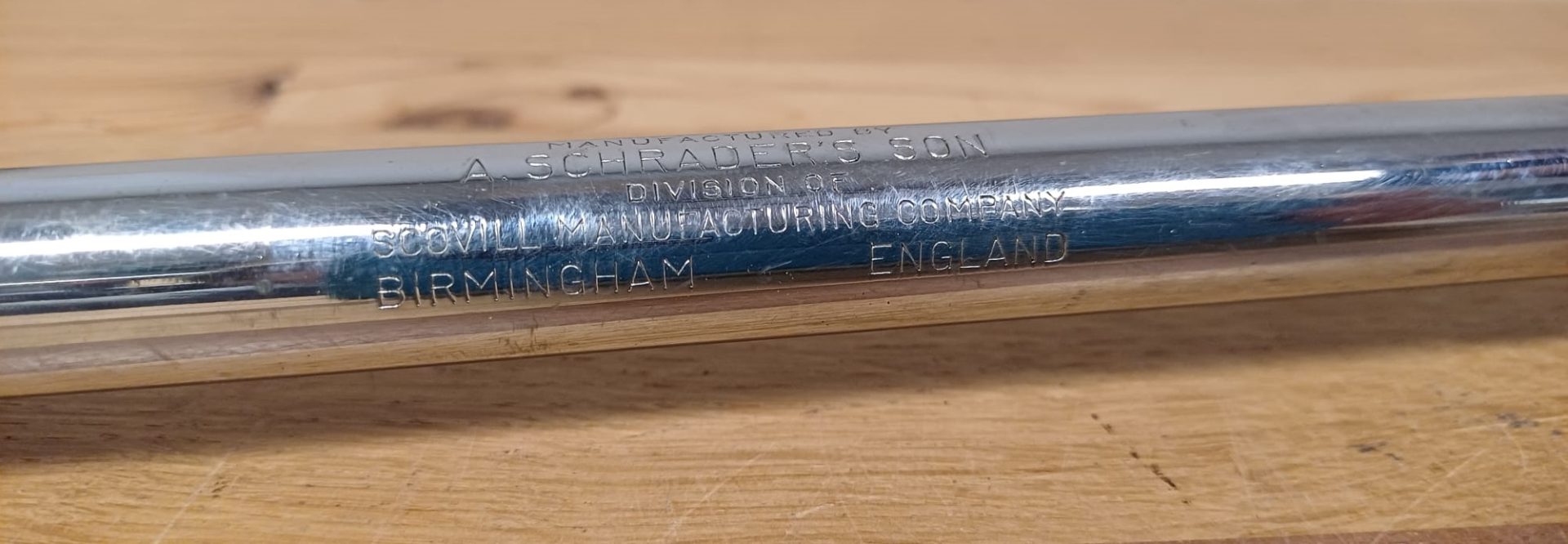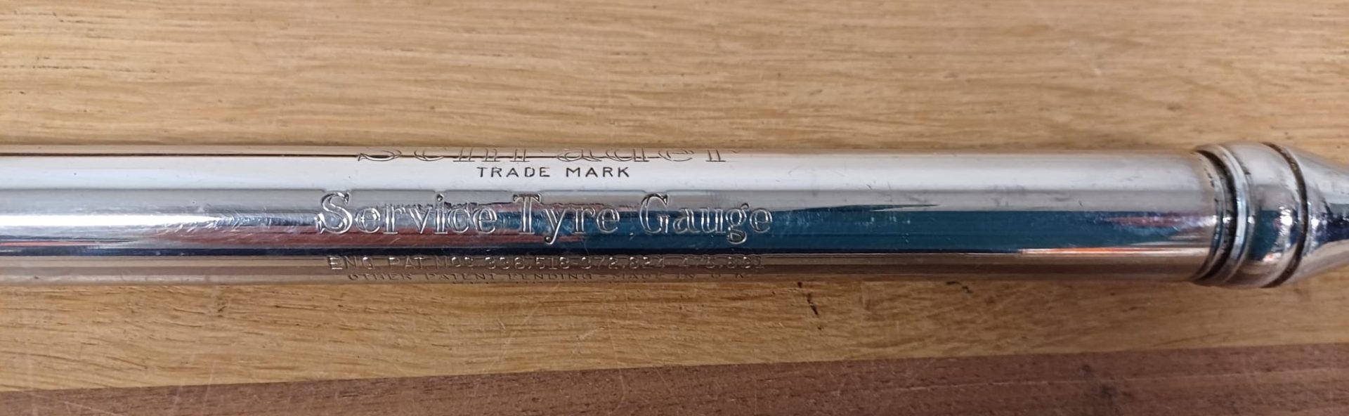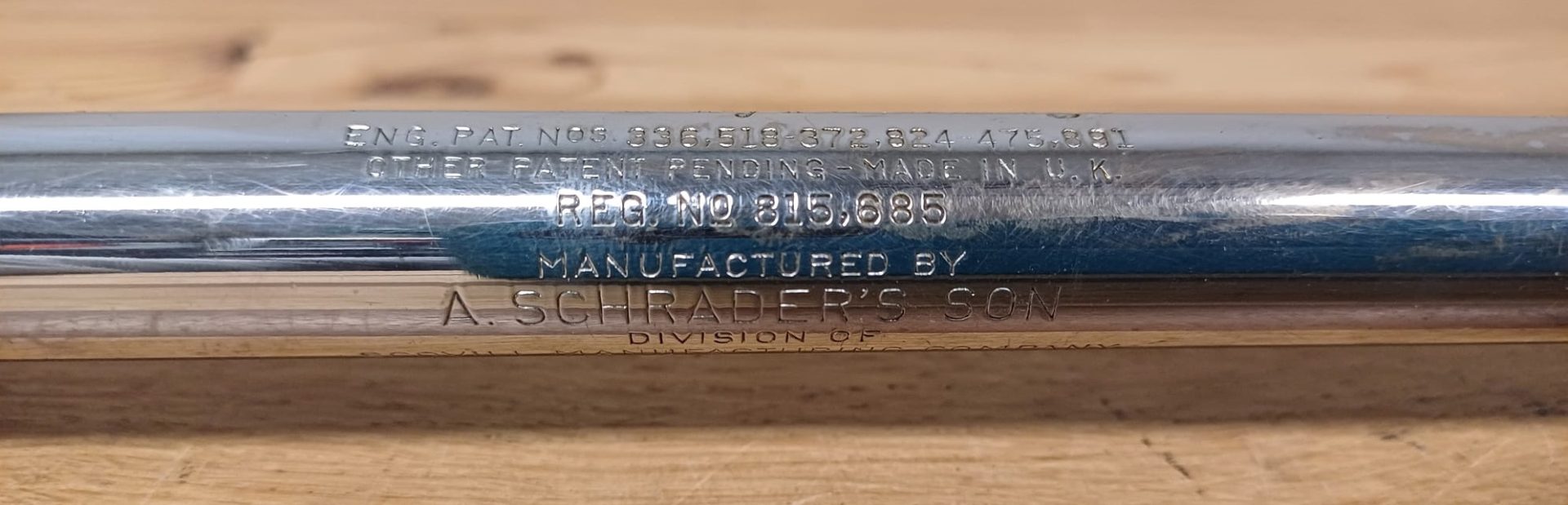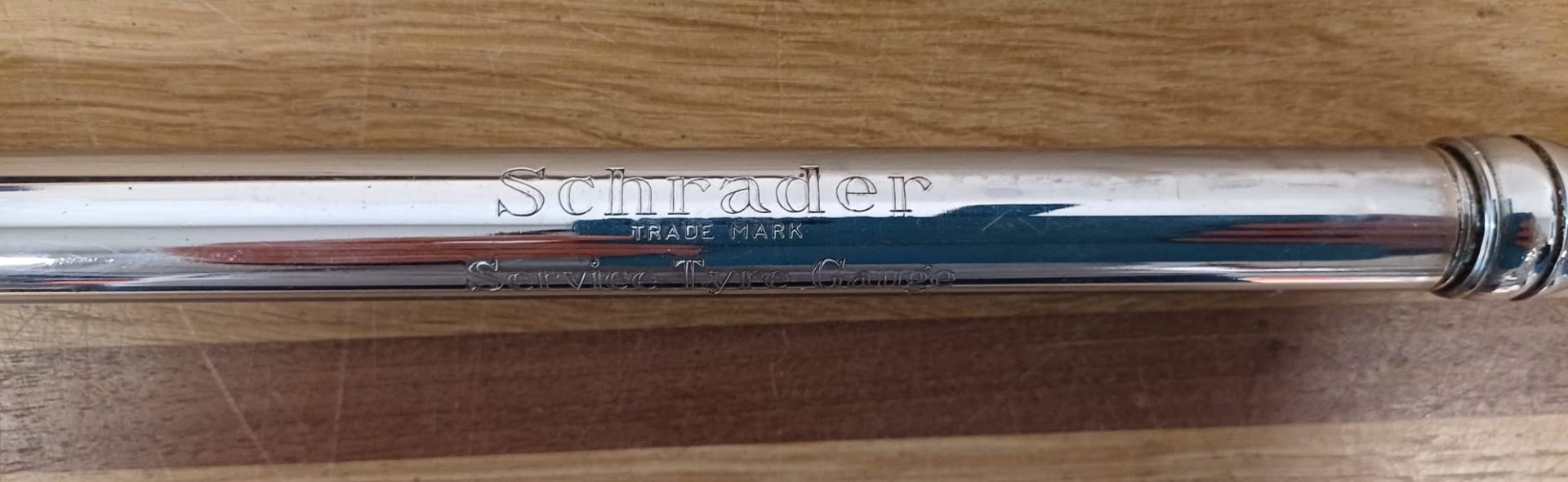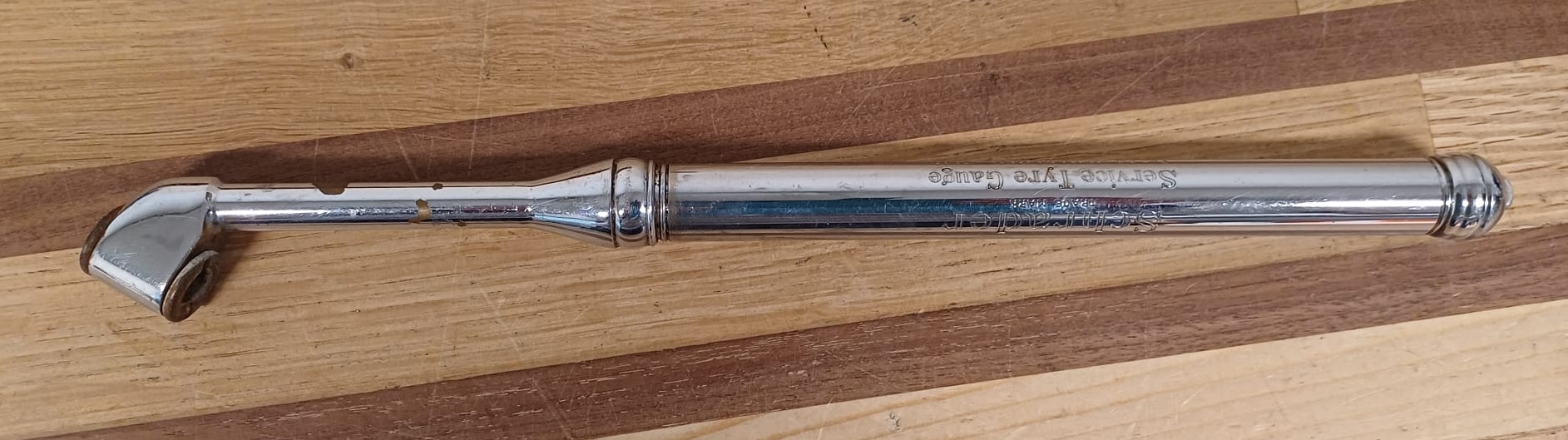 Deze klassieke bandenspanningsmeter werd vroeger gebruikt in garages en bij bandenservice. Het betreft een mechanisch, verchroomd model met haakse meetkop. Schrader staat bekend om zijn hoogwaardige ventielen en meetinstrumenten en is nog steeds een begrip in de automotive wereld.