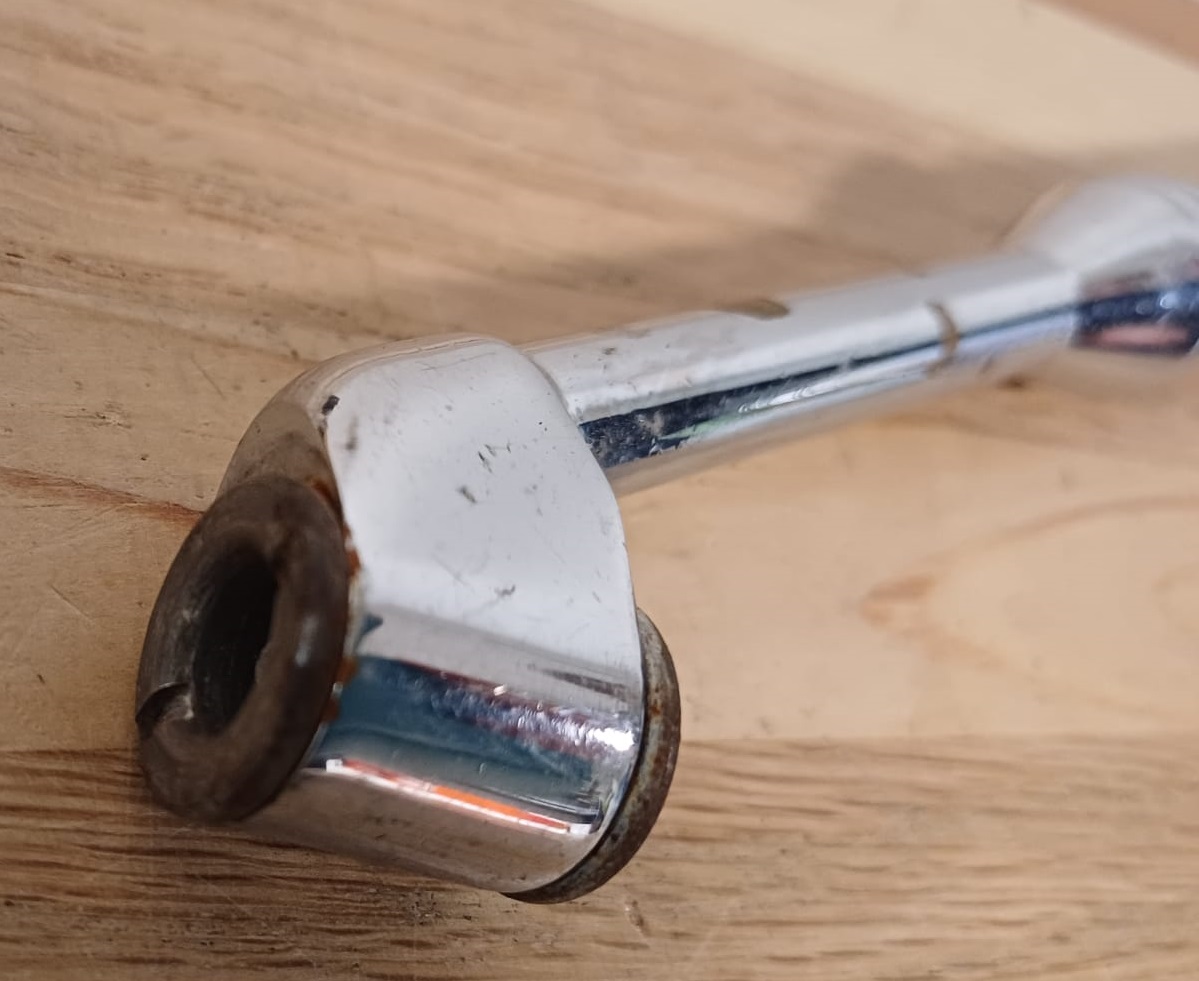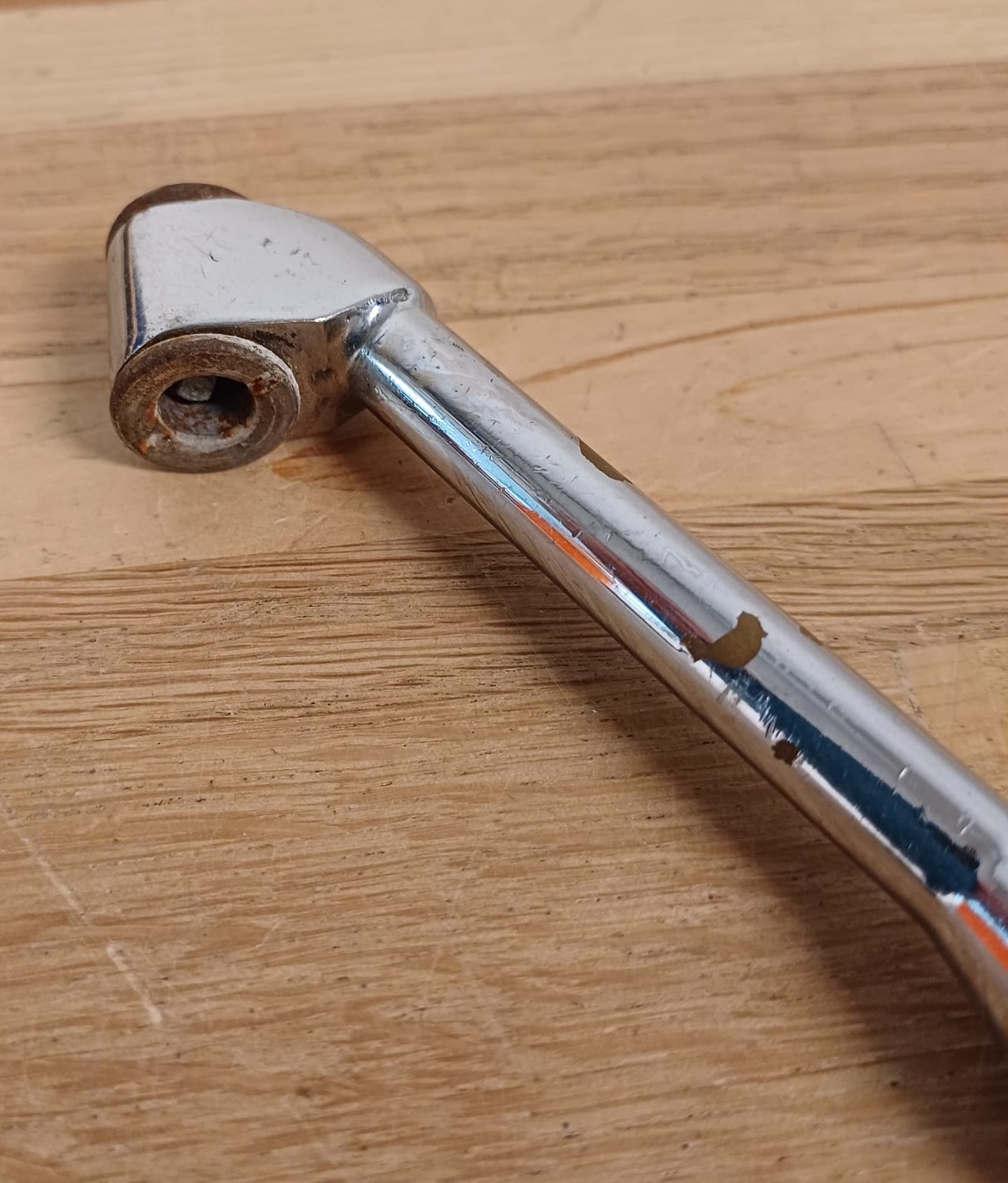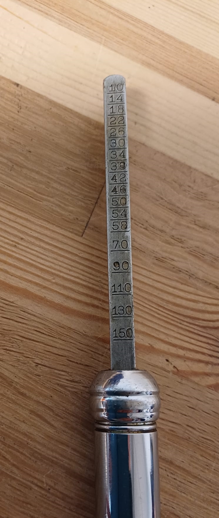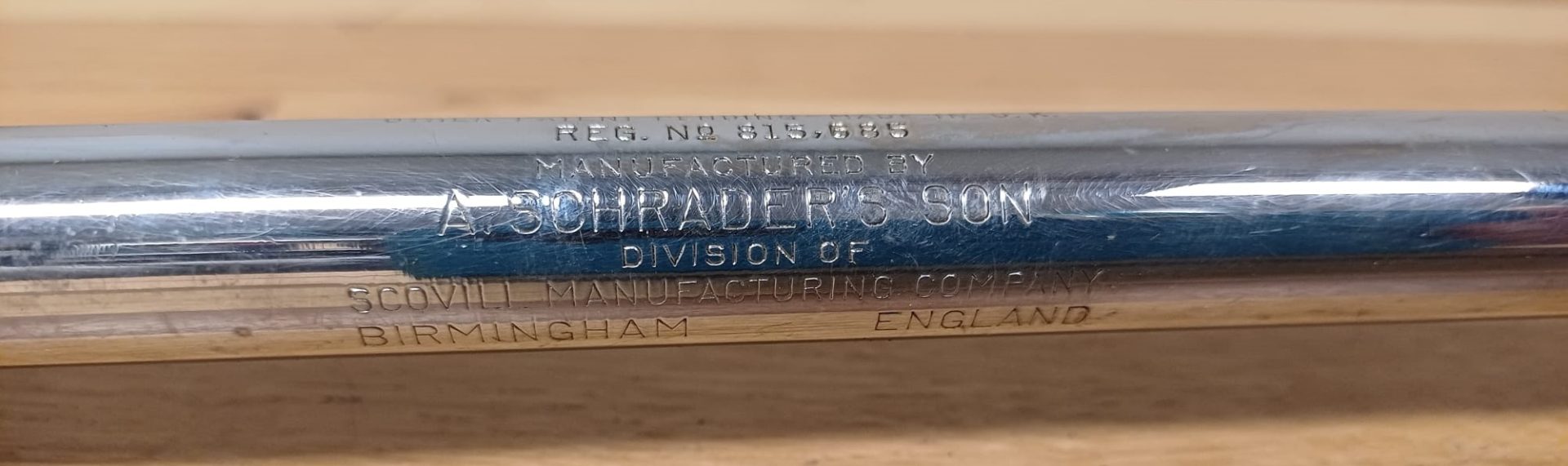 Deze klassieke bandenspanningsmeter werd vroeger gebruikt in garages en bij bandenservice. Het betreft een mechanisch, verchroomd model met haakse meetkop. Schrader staat bekend om zijn hoogwaardige ventielen en meetinstrumenten en is nog steeds een begrip in de automotive wereld.