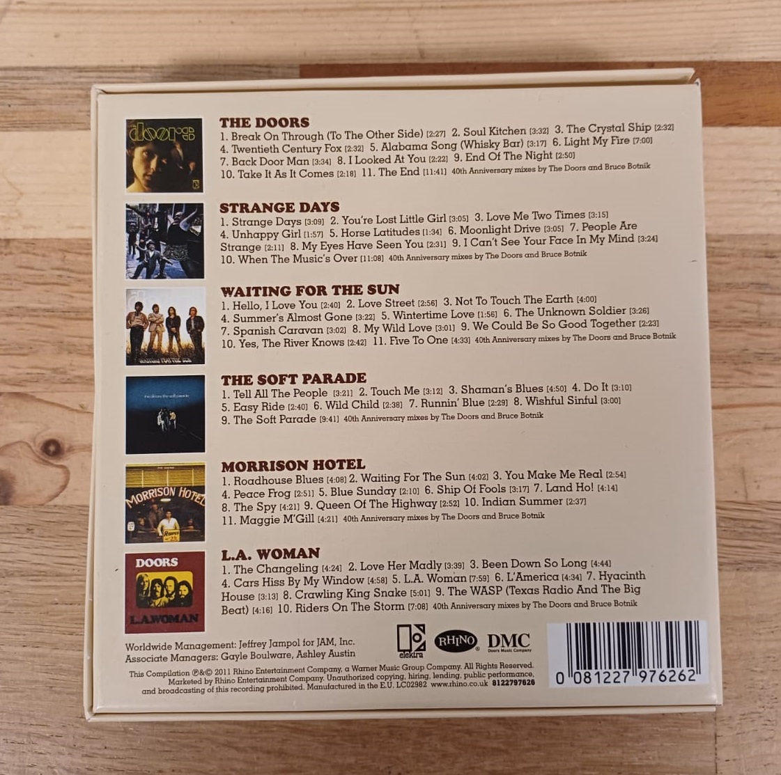6 studio albums van de legendarische band The Doors zijn verzameld in deze prachtige box set: A Collection. De creatieve energie van vier briljante muzikanten – drummer John Densmore, gitarist Robby Kreiger, toetsenist Ray Manzarek en zanger/frontman Jim Morrison – maakten The Doors tot één van de meest iconische en invloedrijke bands ooit. In deze box set zijn alle zes studio albums van The Doors opnieuw gedrukt in replica albumhoezen.