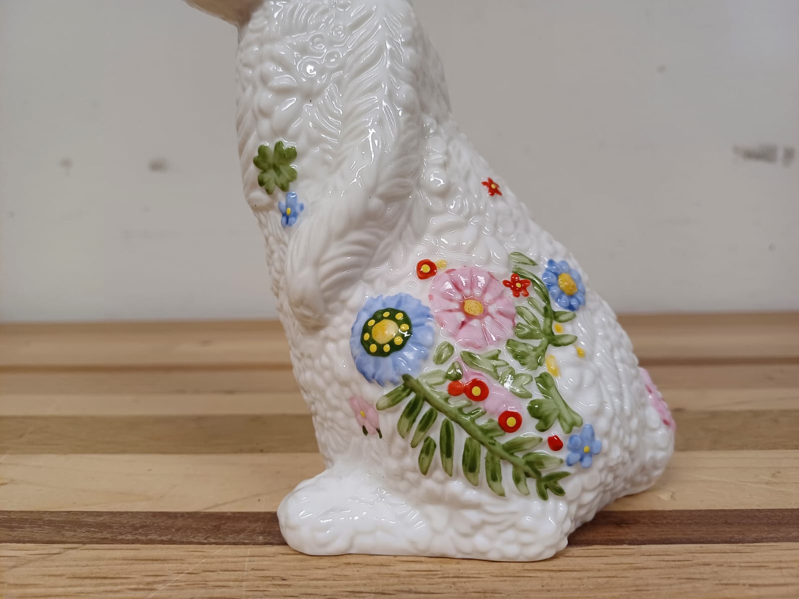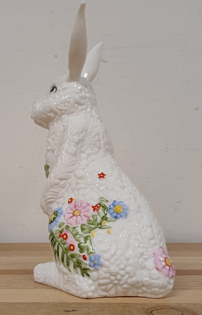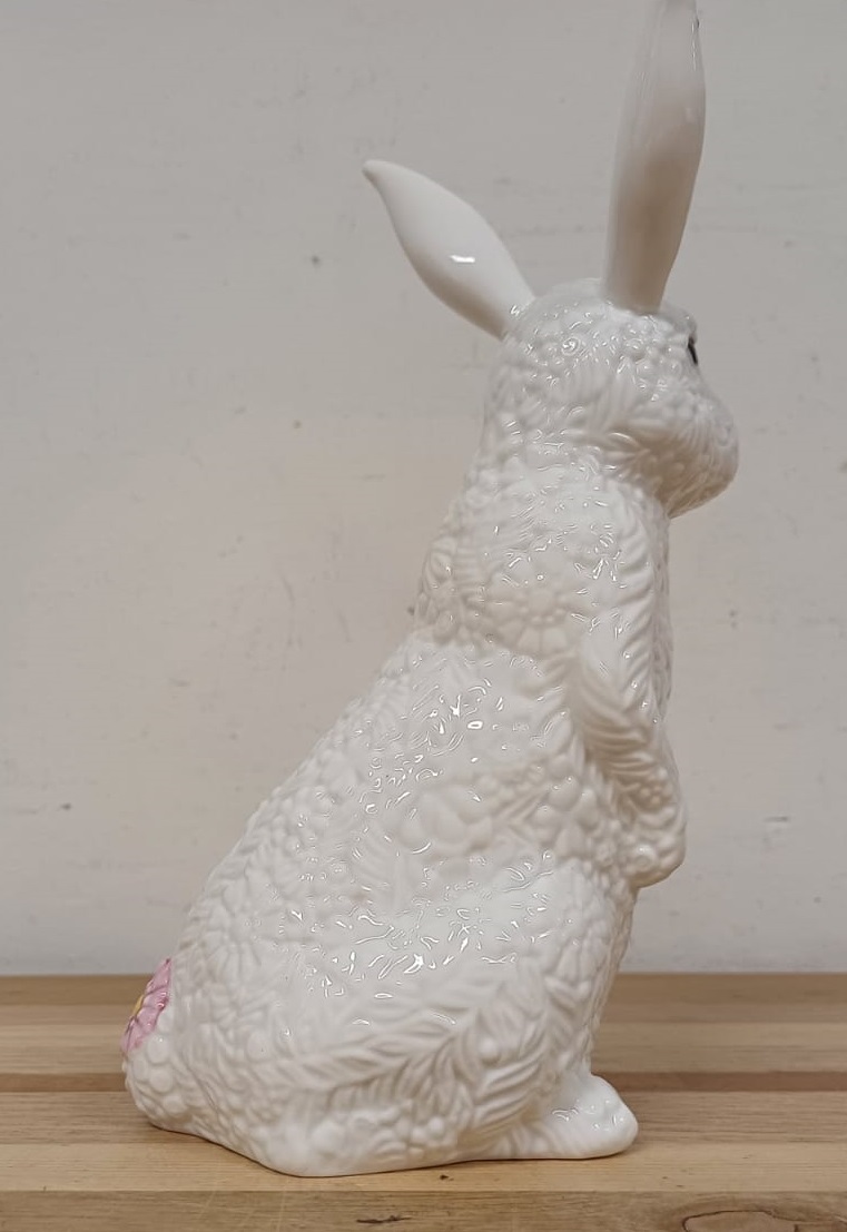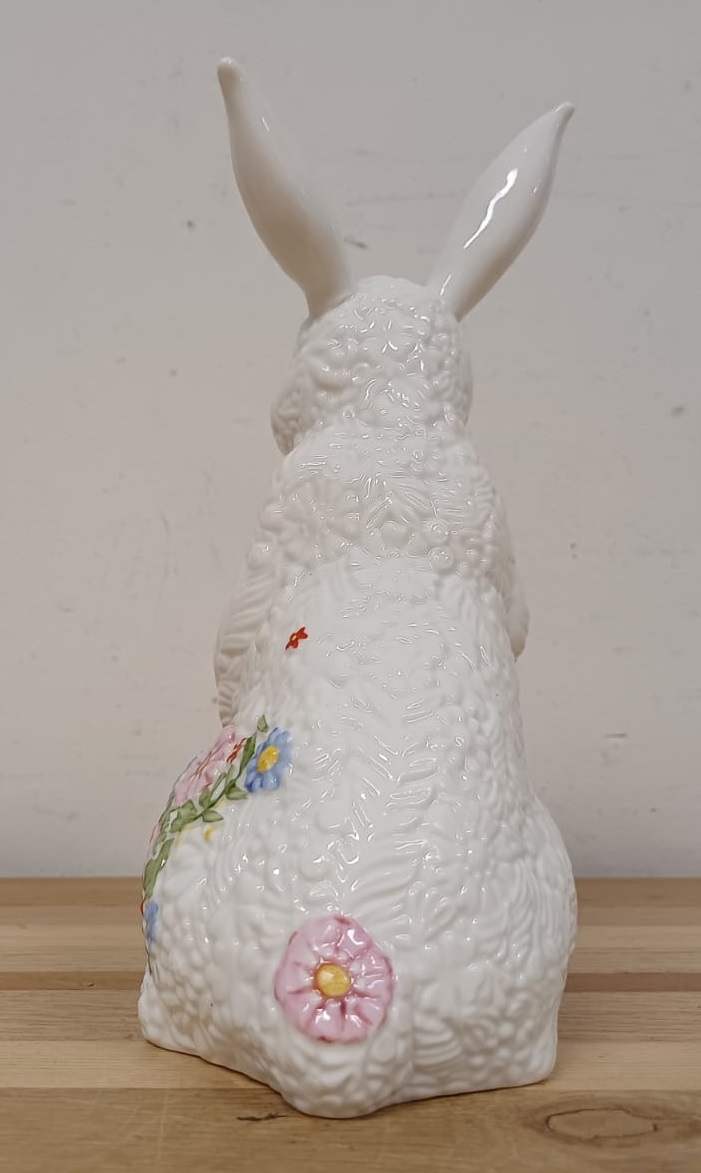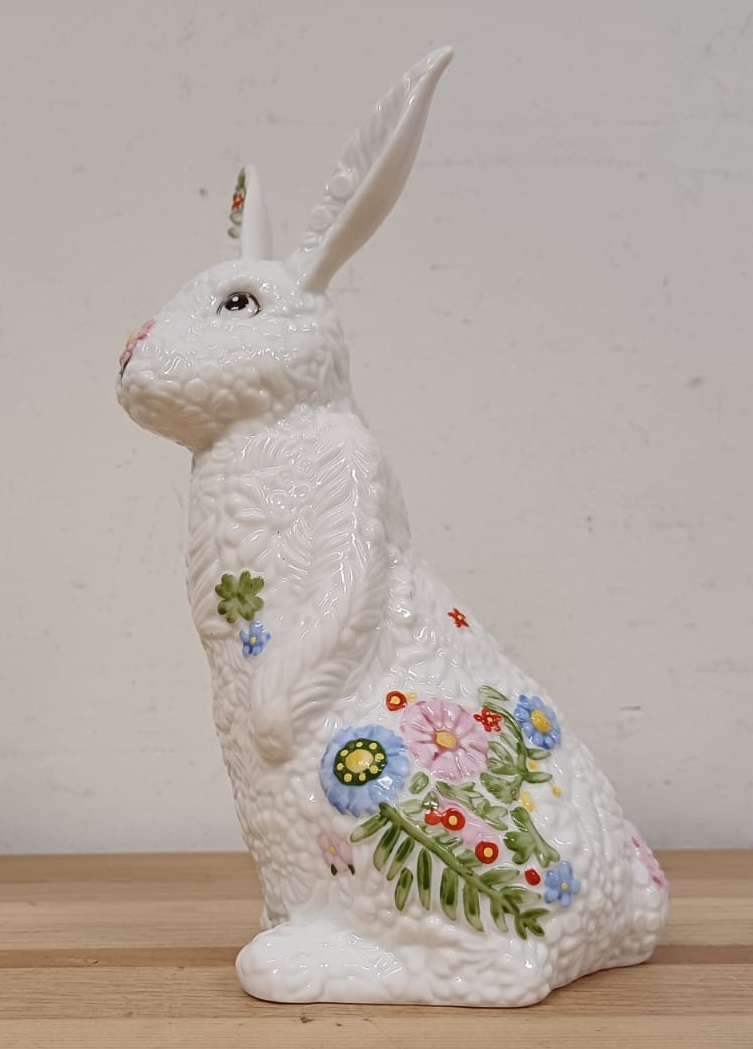 De “vacht” van de paashaas is bedekt met een lenteachtige textuur, aangevuld met een bloemenversiering, waardoor het beeldje vol zit met intrigerende, opvallende details.