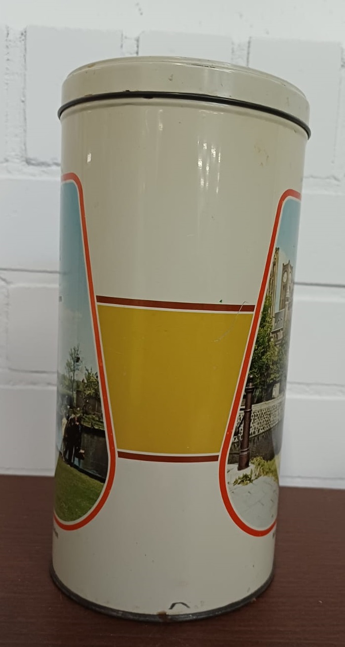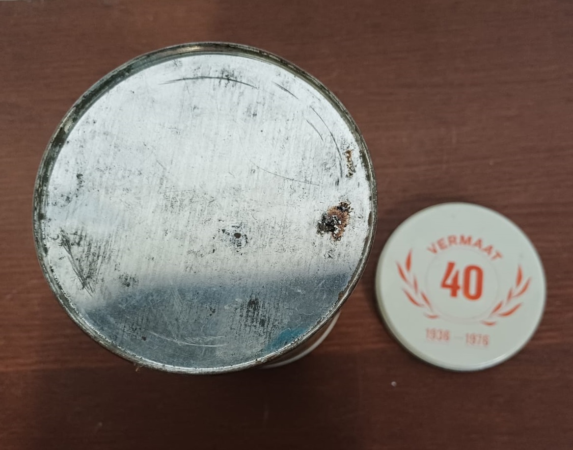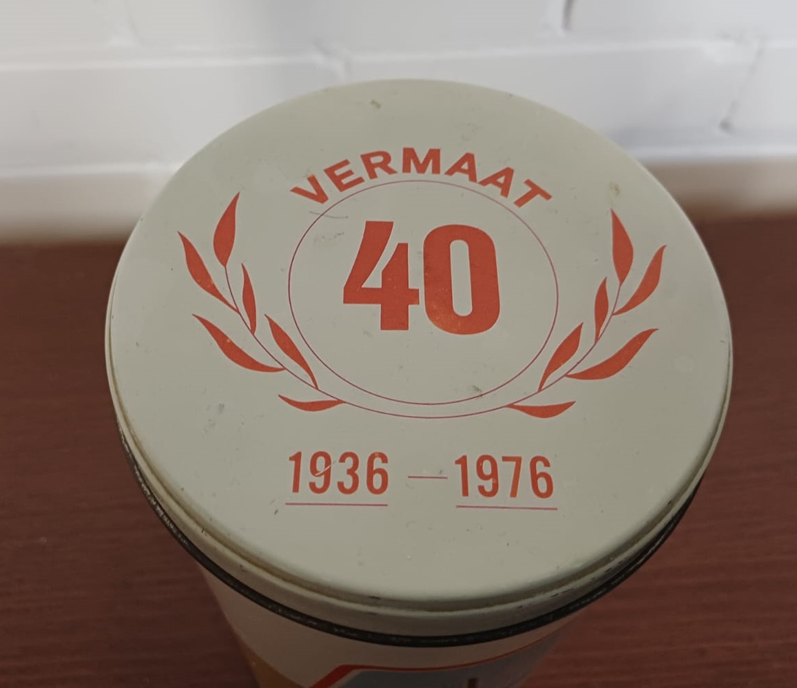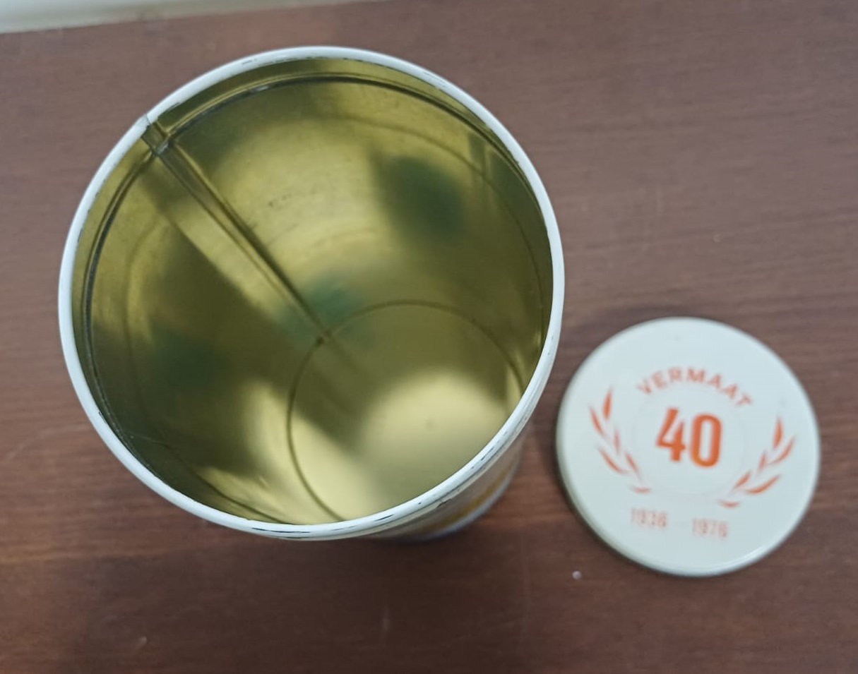 Vintage jubileum beschuitbus van Vermaats Moderne Bakkerijen, uitgebracht ter ere van hun 40-jarig bestaan in 1976. Deze charmante beschuitbus heeft een tijdloos ontwerp met een los oversluitdeksel en draagt trots de inscriptie “Vermaat 40 jaar 1936 – 1976”.