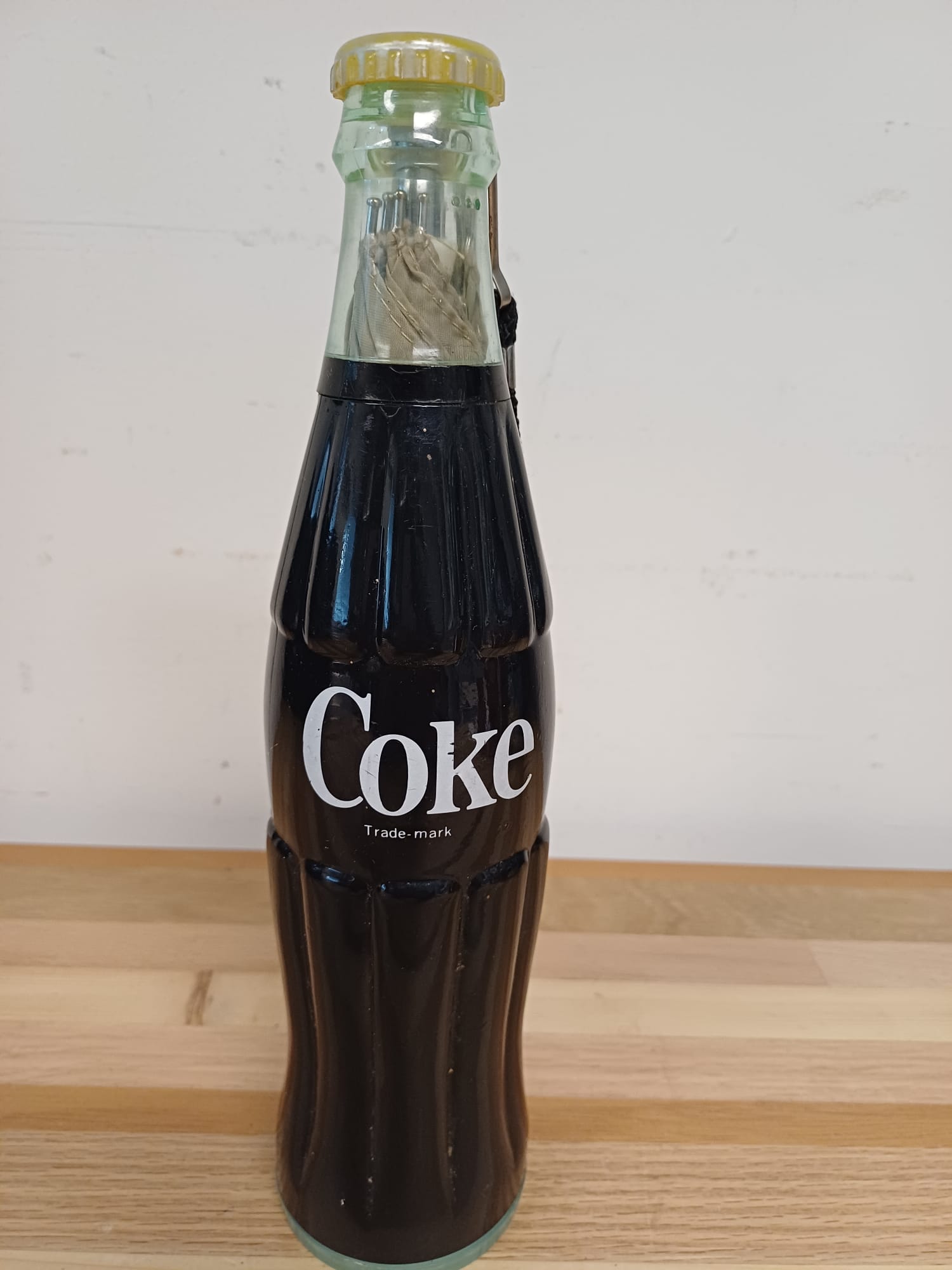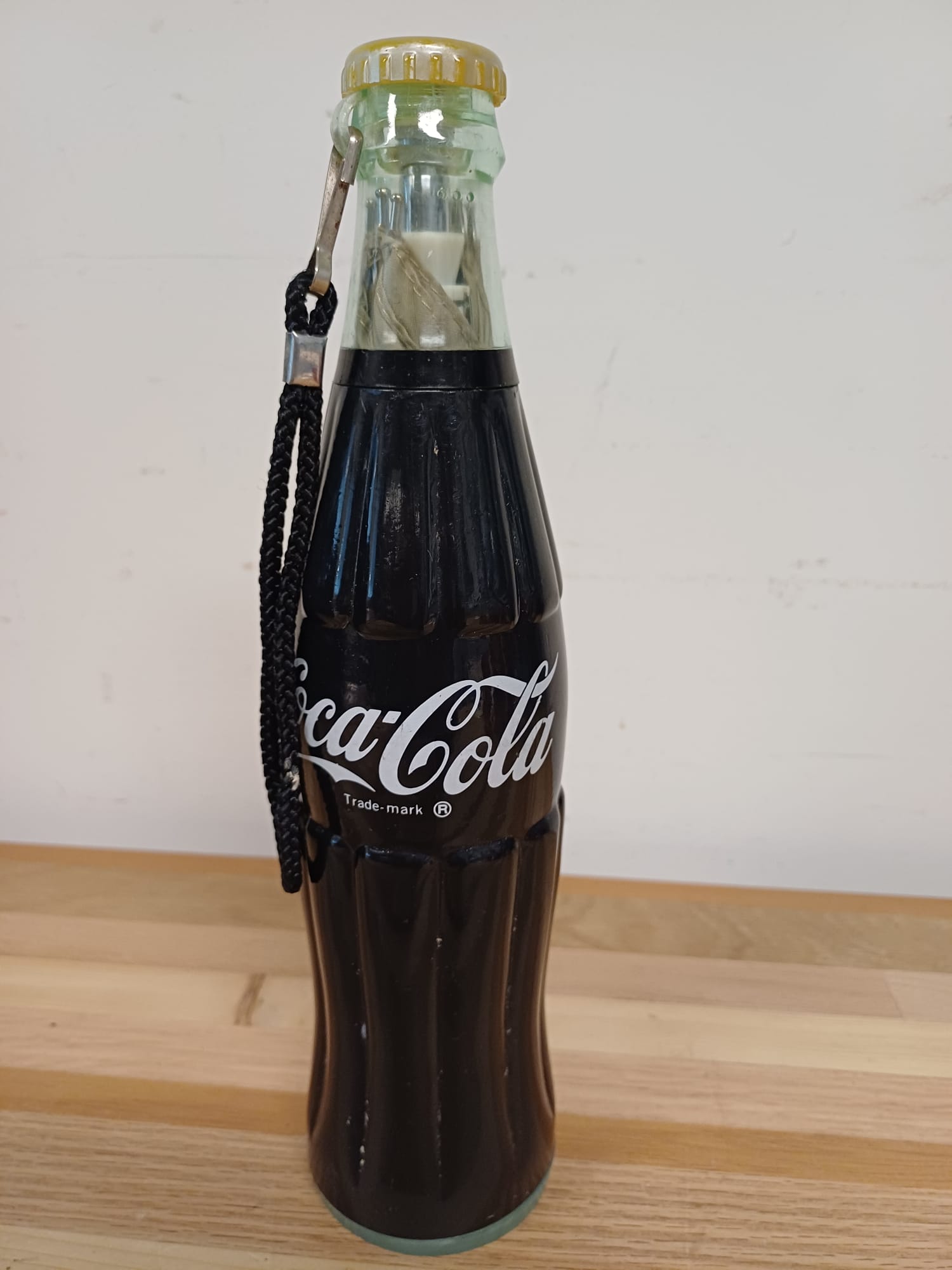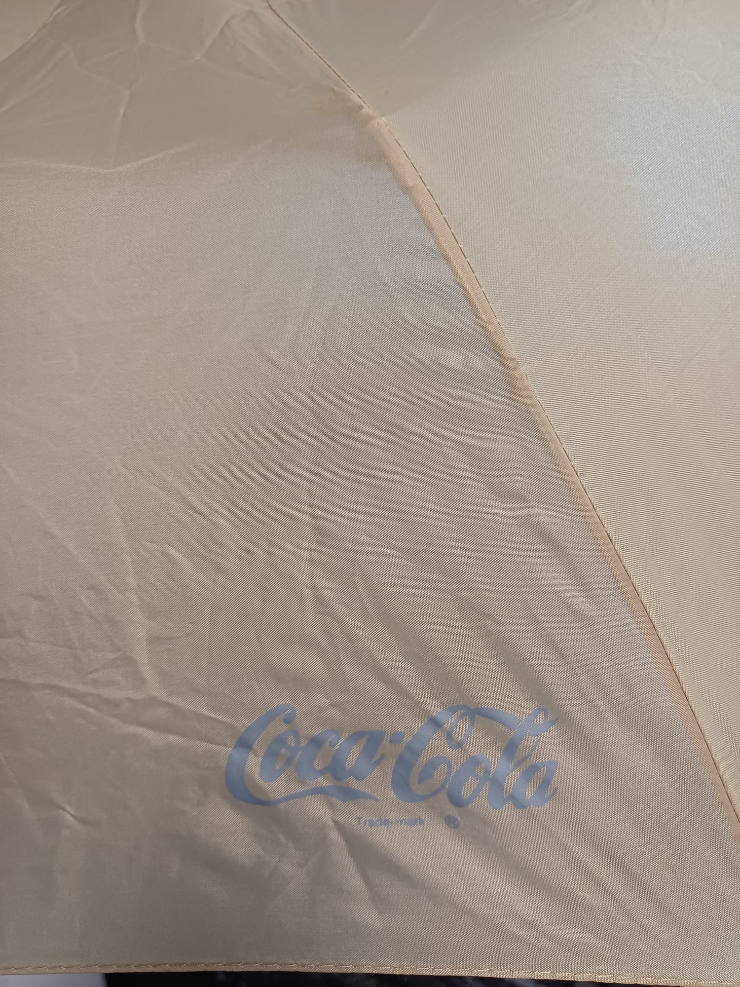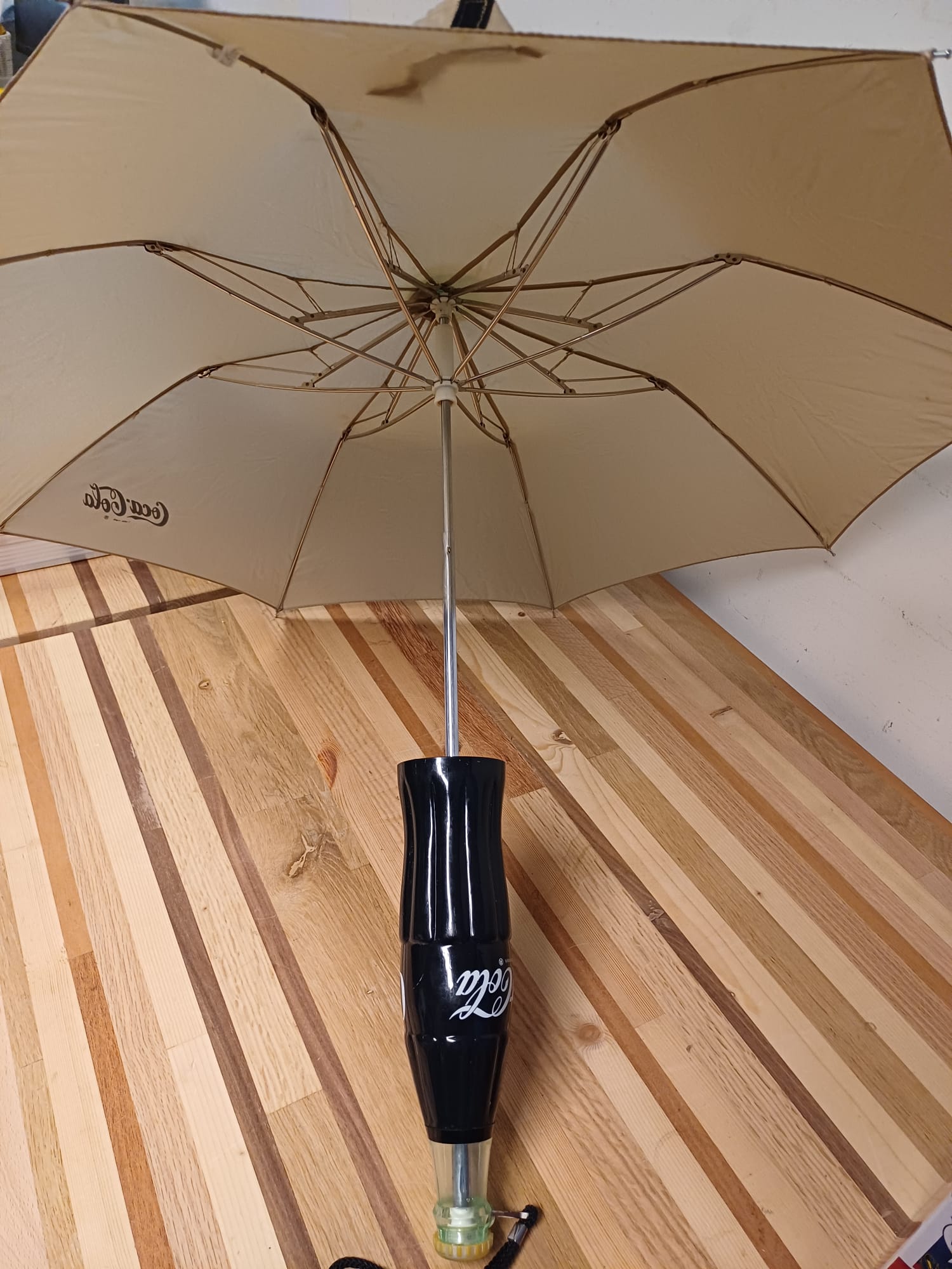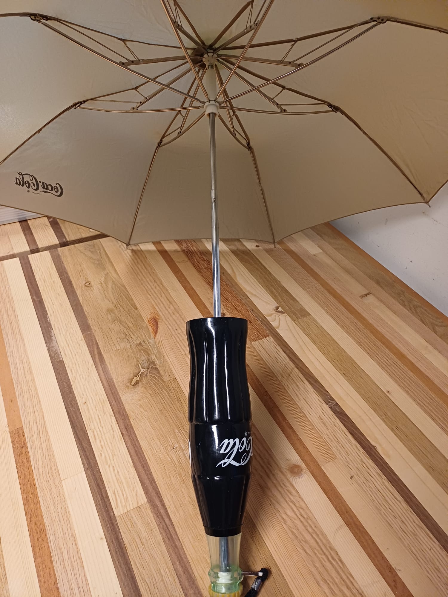 Deze vintage Coca-Cola paraplu is nog werkend en ziet er netjes uit. Het is een uniek verzamelobject met het Coca-Cola logo op de stof en een handvat in de vorm van een fles.De paraplu komt uit 1985