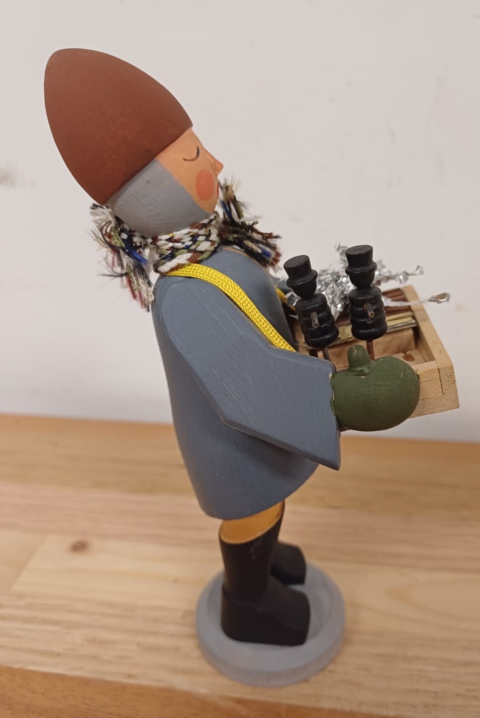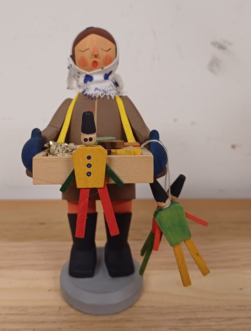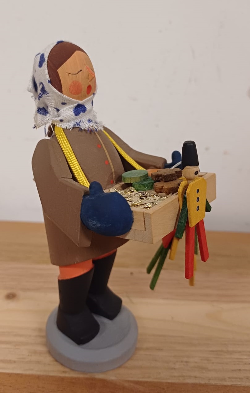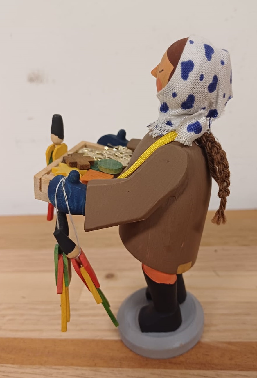Erzgebirge Expert houten figuren gemaakt in DDR Duitsland. Uit de jaren 60. Beide zijn speelgoedhandelaren, compleet met een dienblad vol speelgoed/artikelen.