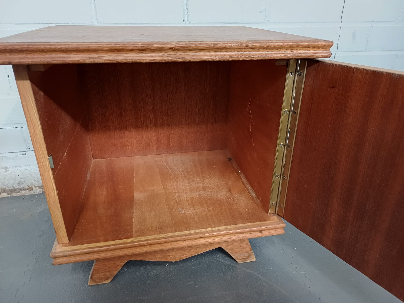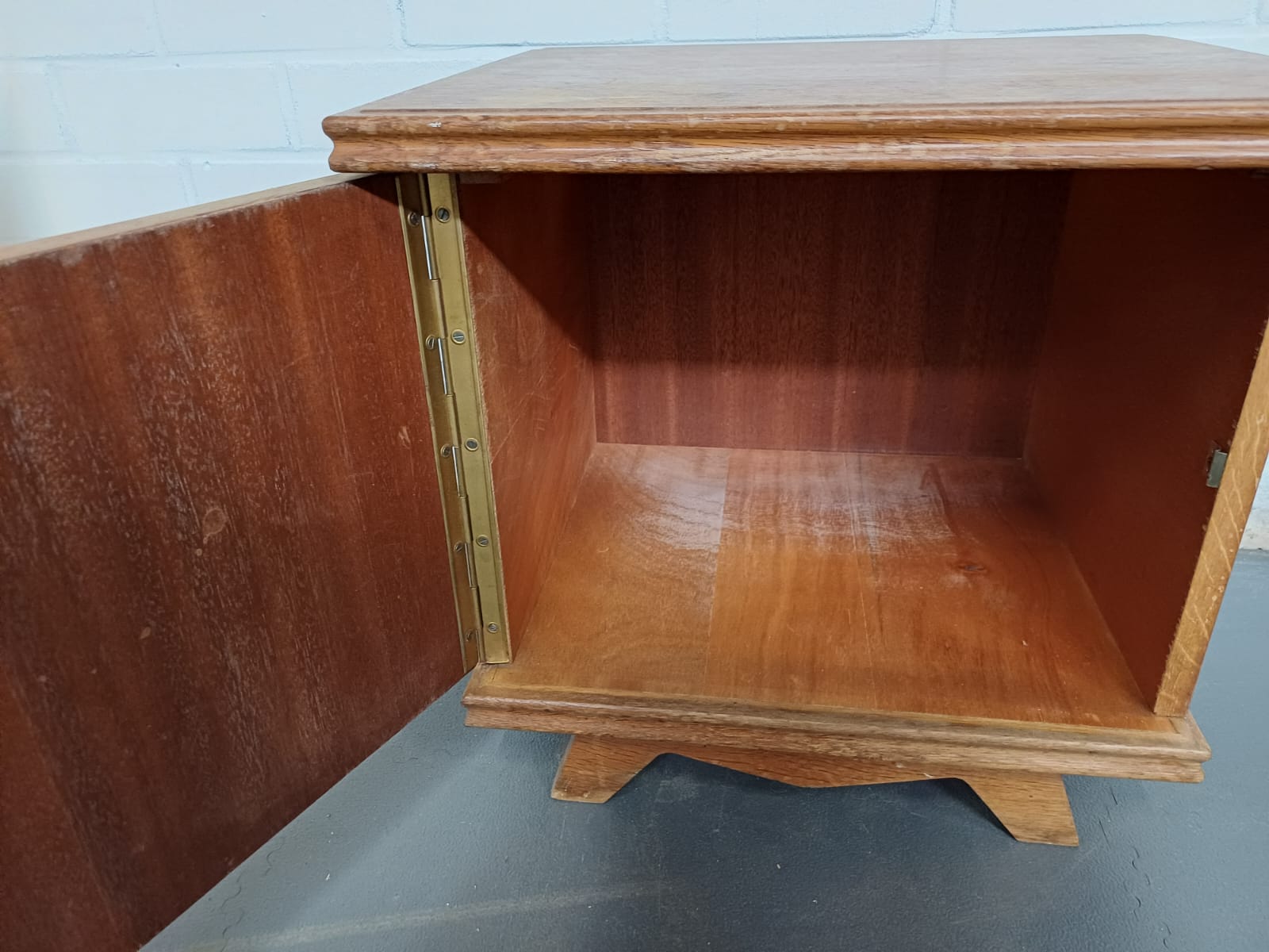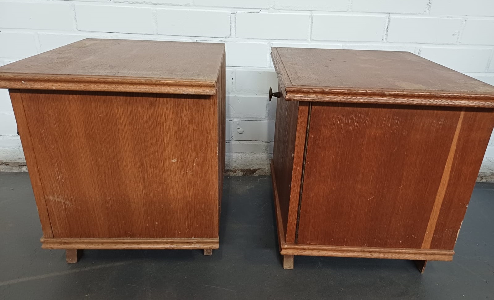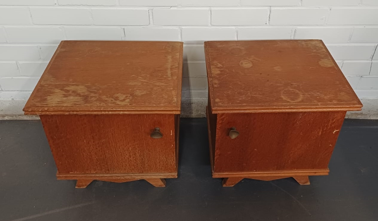Een vintage nachtkastje met een deur. Zijn 2 kastje. Bij 1 gaat de deur links open en bij de ander rechts.