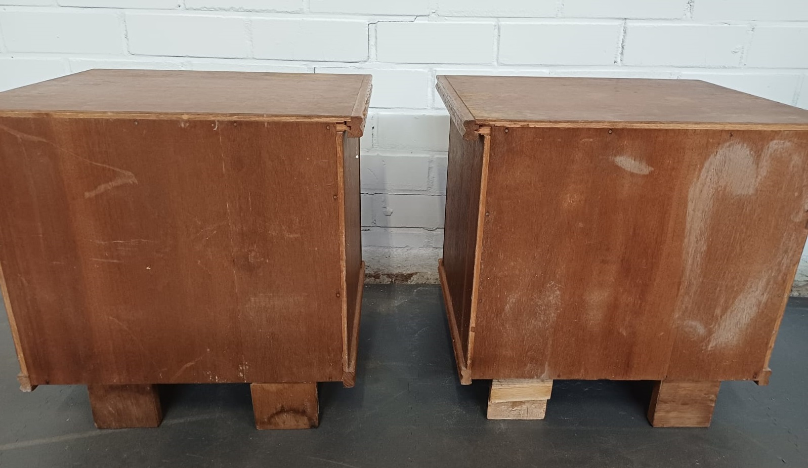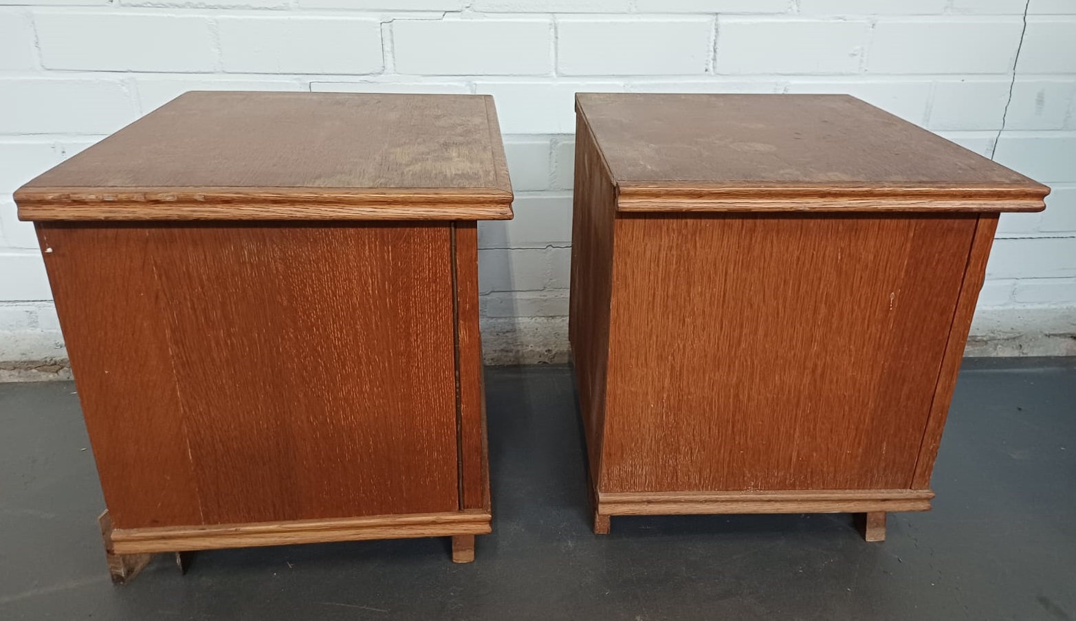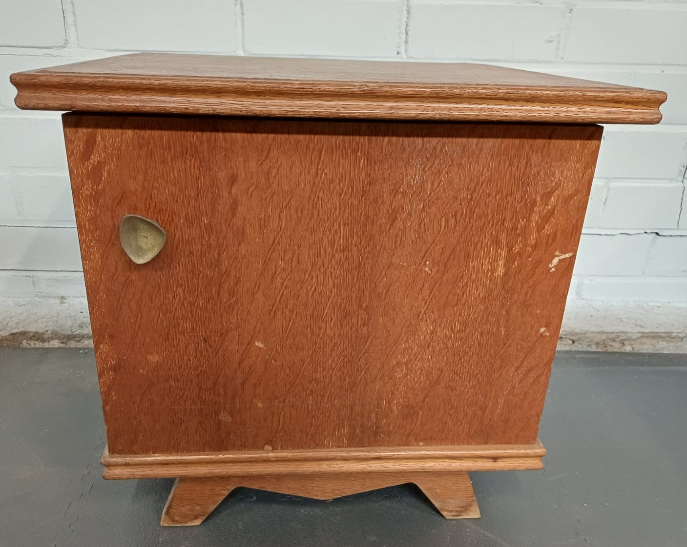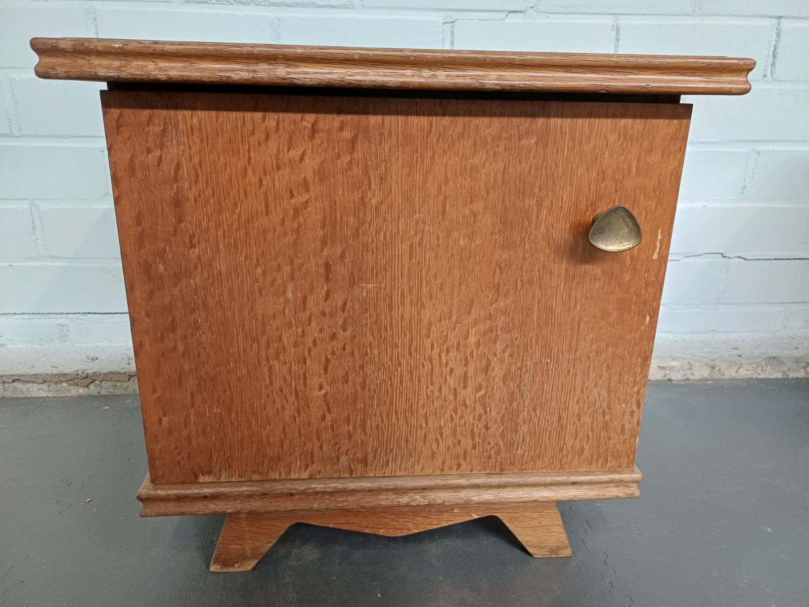 Een vintage nachtkastje met een deur. Zijn 2 kastje. Bij 1 gaat de deur links open en bij de ander rechts.