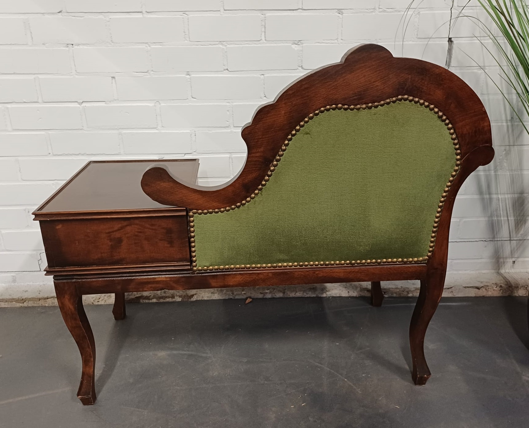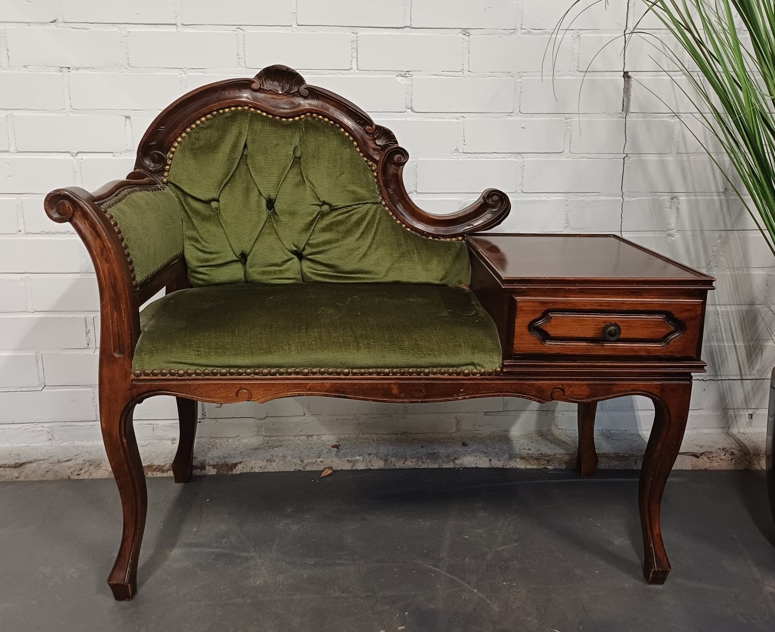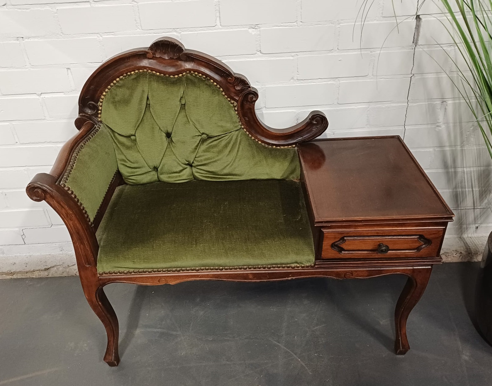 Vintage houten telefoonbankje met groene bekleding. Het bankje heeft een fraaie decoratieve uitstraling en is voorzien van een lade en mooi gevormde pootjes. Dergelijke bankjes werden vroeger vaak in de hal geplaatst met een telefoon erop, of bij de telefoon, zodat men rustig even kon zitten bij het telefoneren.