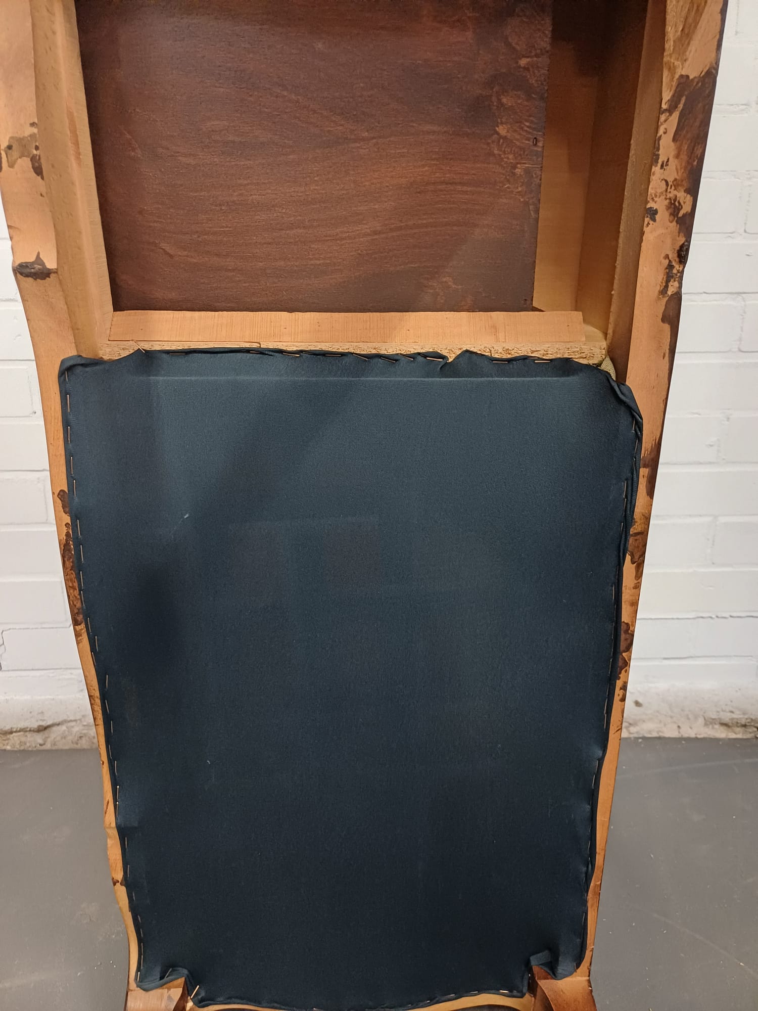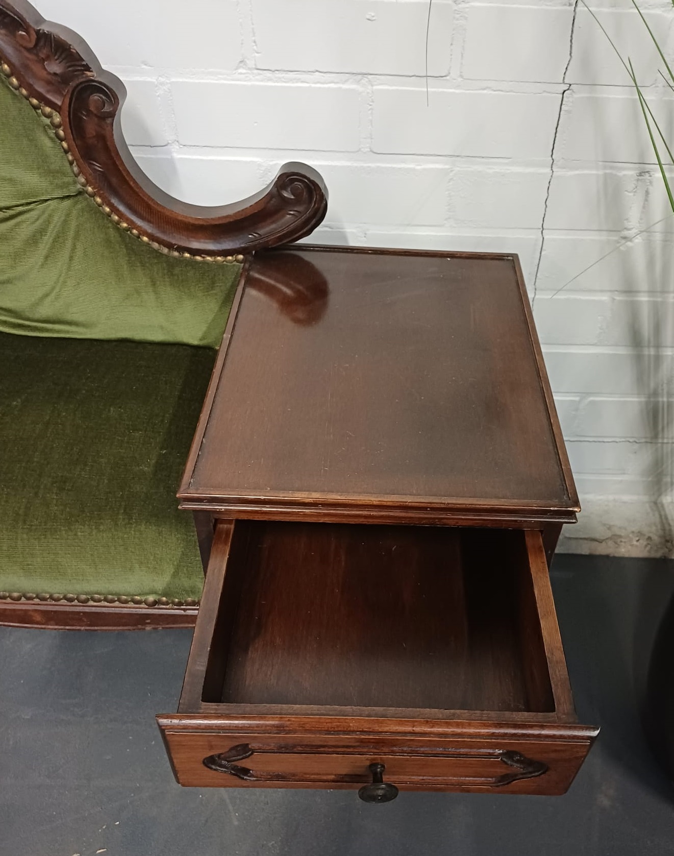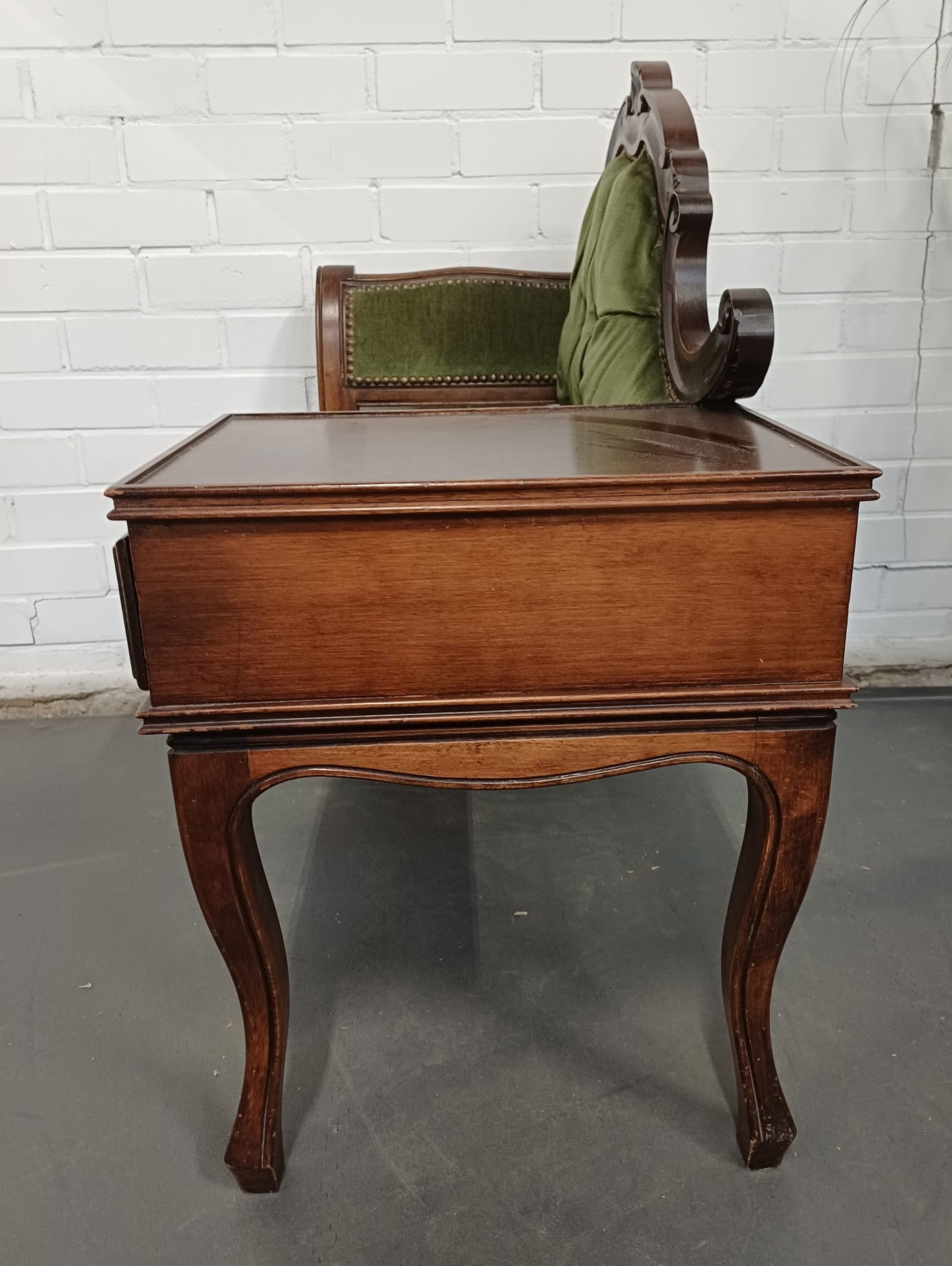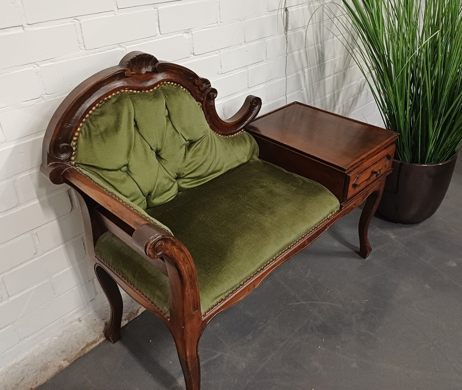 Vintage houten telefoonbankje met groene bekleding. Het bankje heeft een fraaie decoratieve uitstraling en is voorzien van een lade en mooi gevormde pootjes. Dergelijke bankjes werden vroeger vaak in de hal geplaatst met een telefoon erop, of bij de telefoon, zodat men rustig even kon zitten bij het telefoneren.