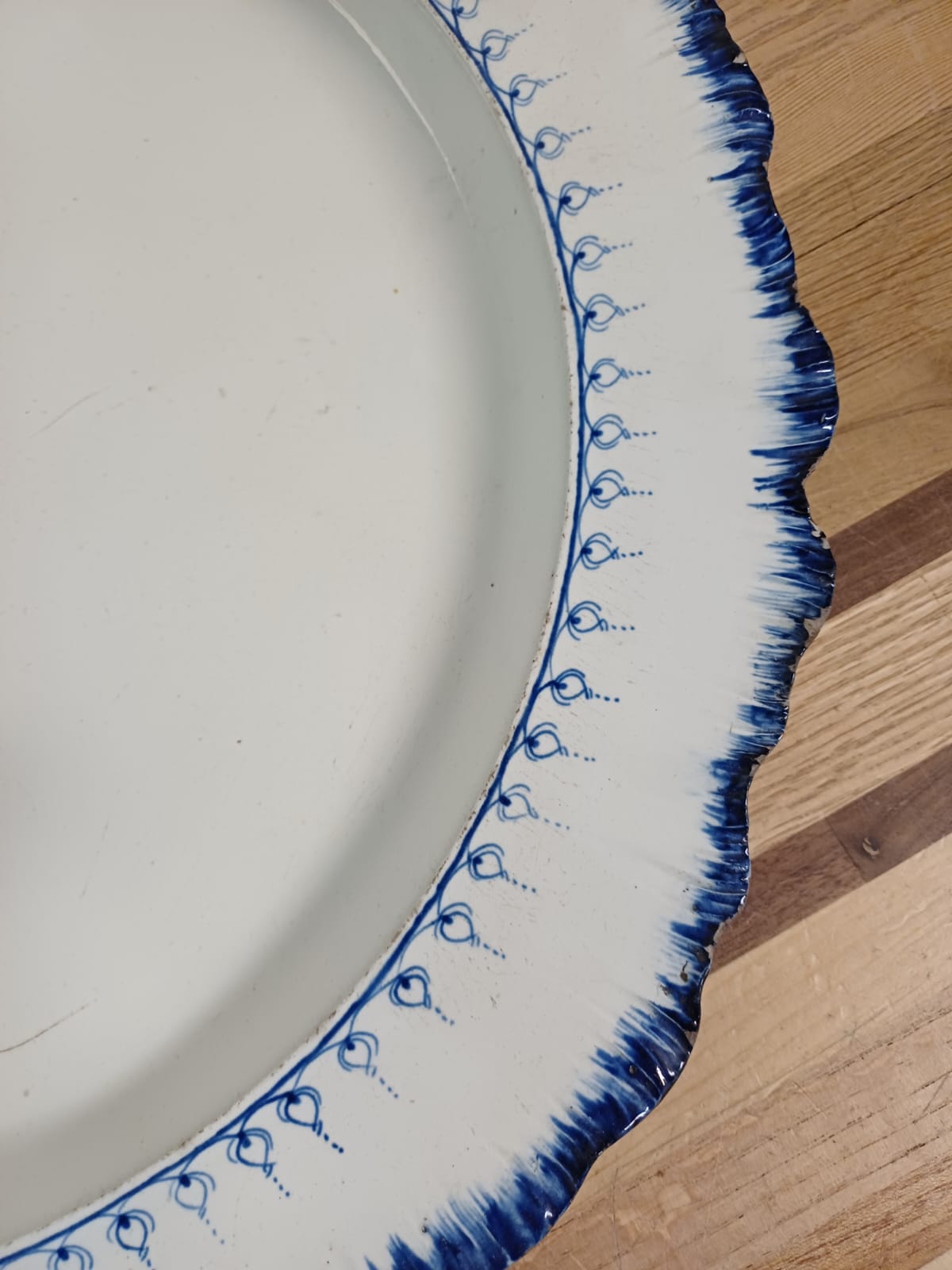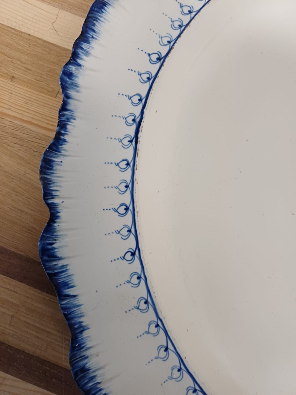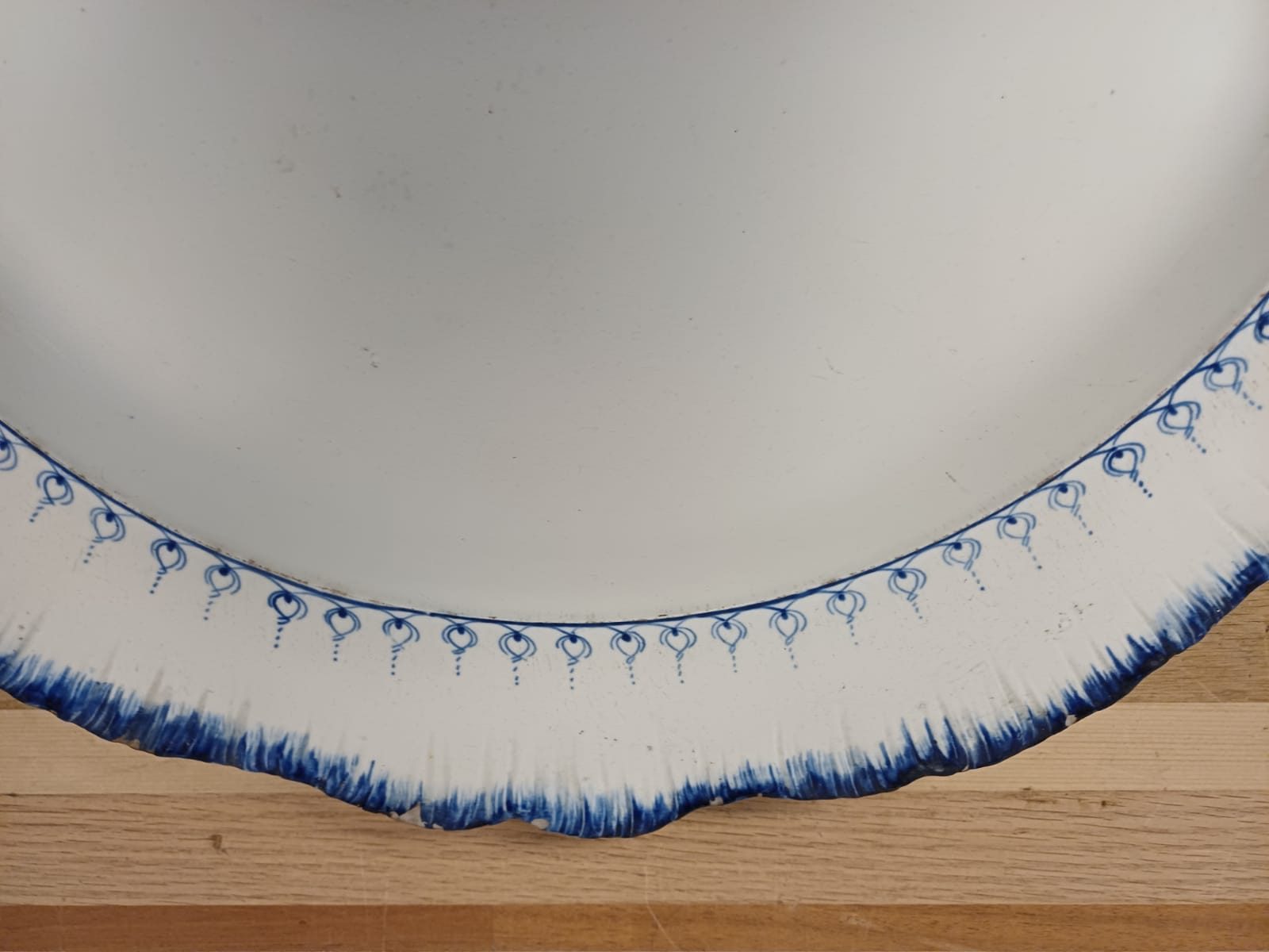 Met uitlopende, geschulpte rand, versierd met blauwe lijnen en gestileerde bloemhoofdjes, ingedrukt merkteken.