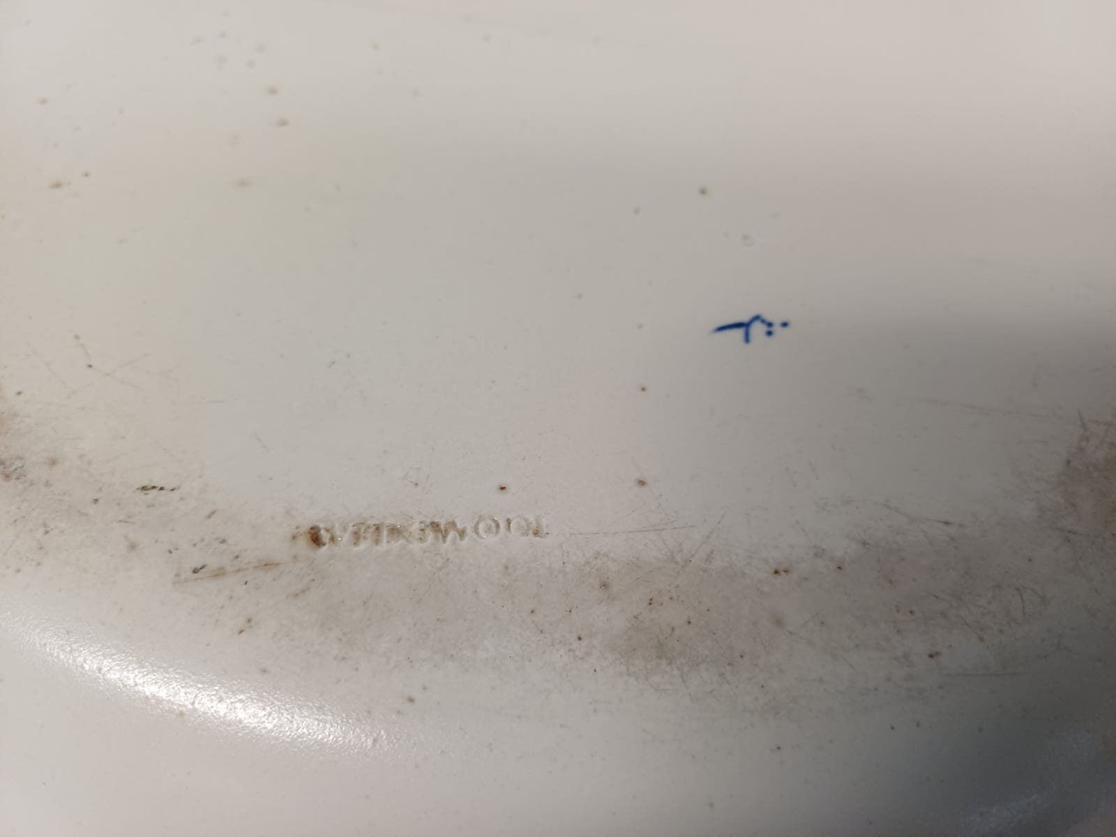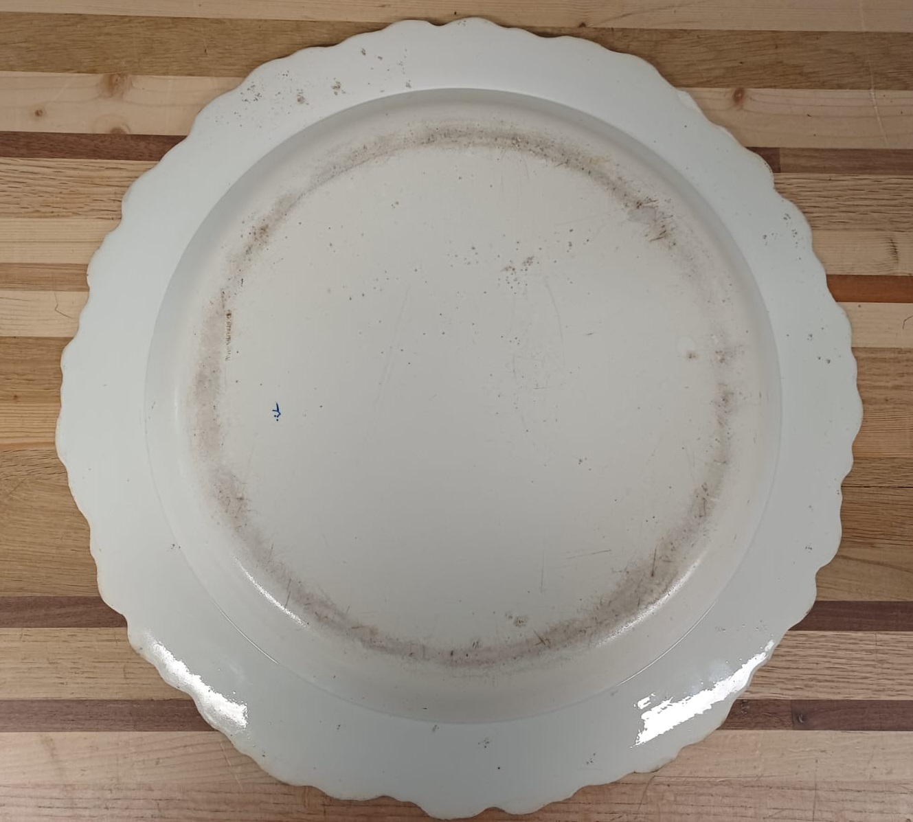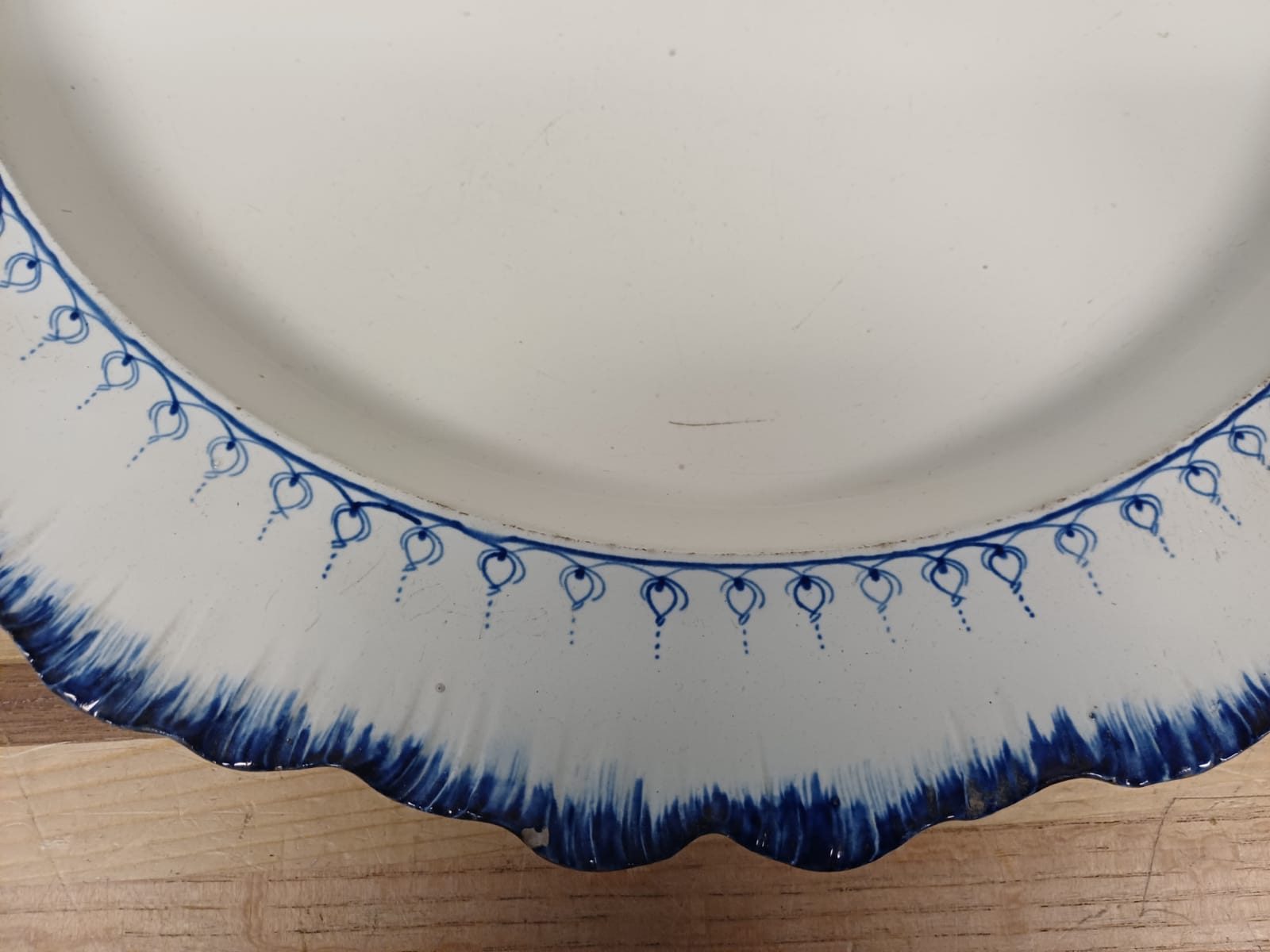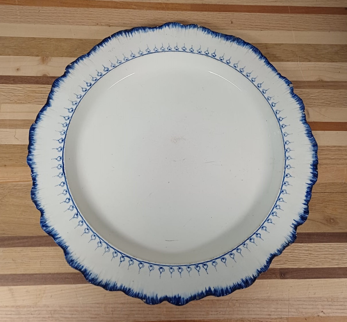 Met uitlopende, geschulpte rand, versierd met blauwe lijnen en gestileerde bloemhoofdjes, ingedrukt merkteken.