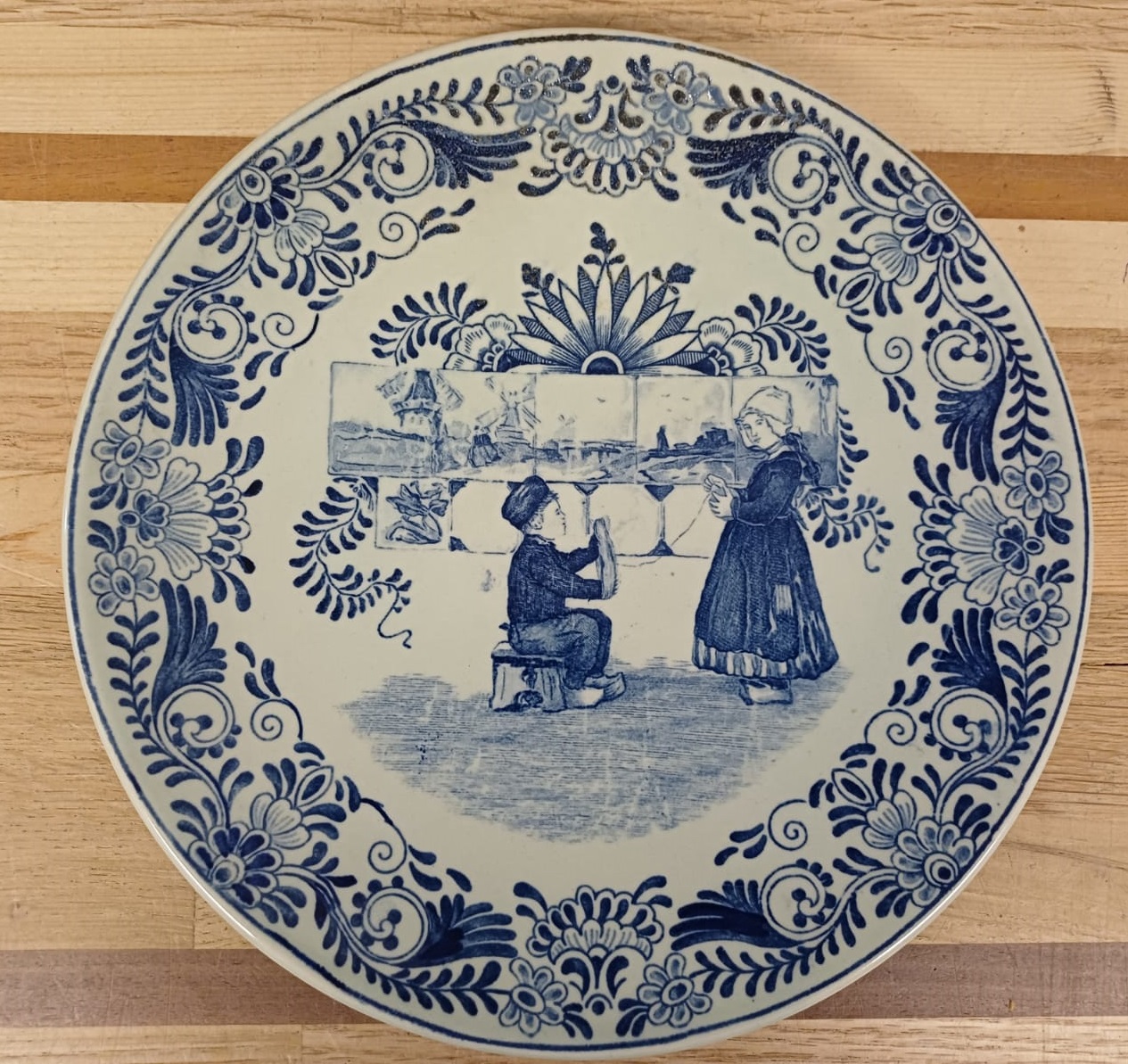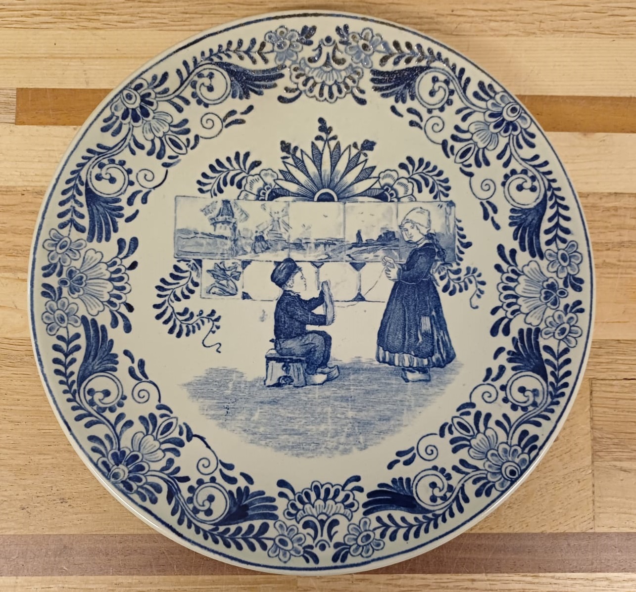 Dit sierwandbord met oud-Hollands tafereel is gemaakt tussen 1836 en 1897 en uitgevoerd in een blauwe decoratie. De ouderdom is te zien aan de grijsachtig blauwe basis. Op het bord een afbeelding van twee kinderen in klederdracht. Het jongetje houdt de wol ‘op’, het meisje maakt er een bolletje van. Achter de kinderen is een soort stripverhaal te zien, vijf kaders van een Hollands landschap met molens. Op de rand van het bord zijn bloemmotieven aangebracht. Op de achterkant staat een porselein stempel van de firma Petrus Regout & Co, Maastricht, Fantaisie, made in Holland.